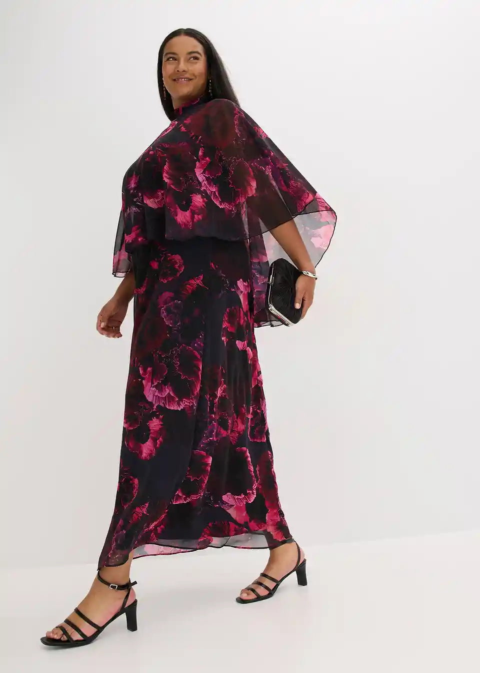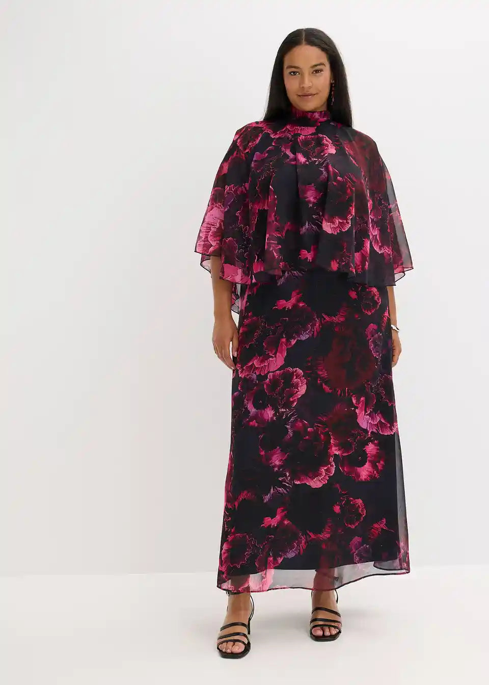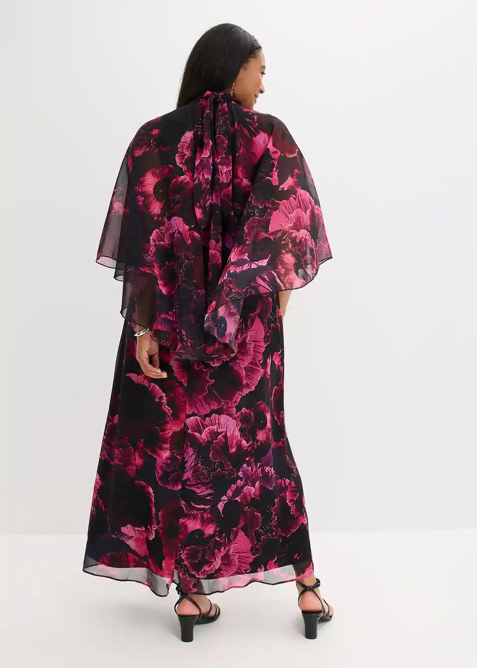 Romantično in ženstveno: večerna obleka v dolgem kroju iz finega šifona z ogrinjalom in pokončnim ovratnikom z vrvico