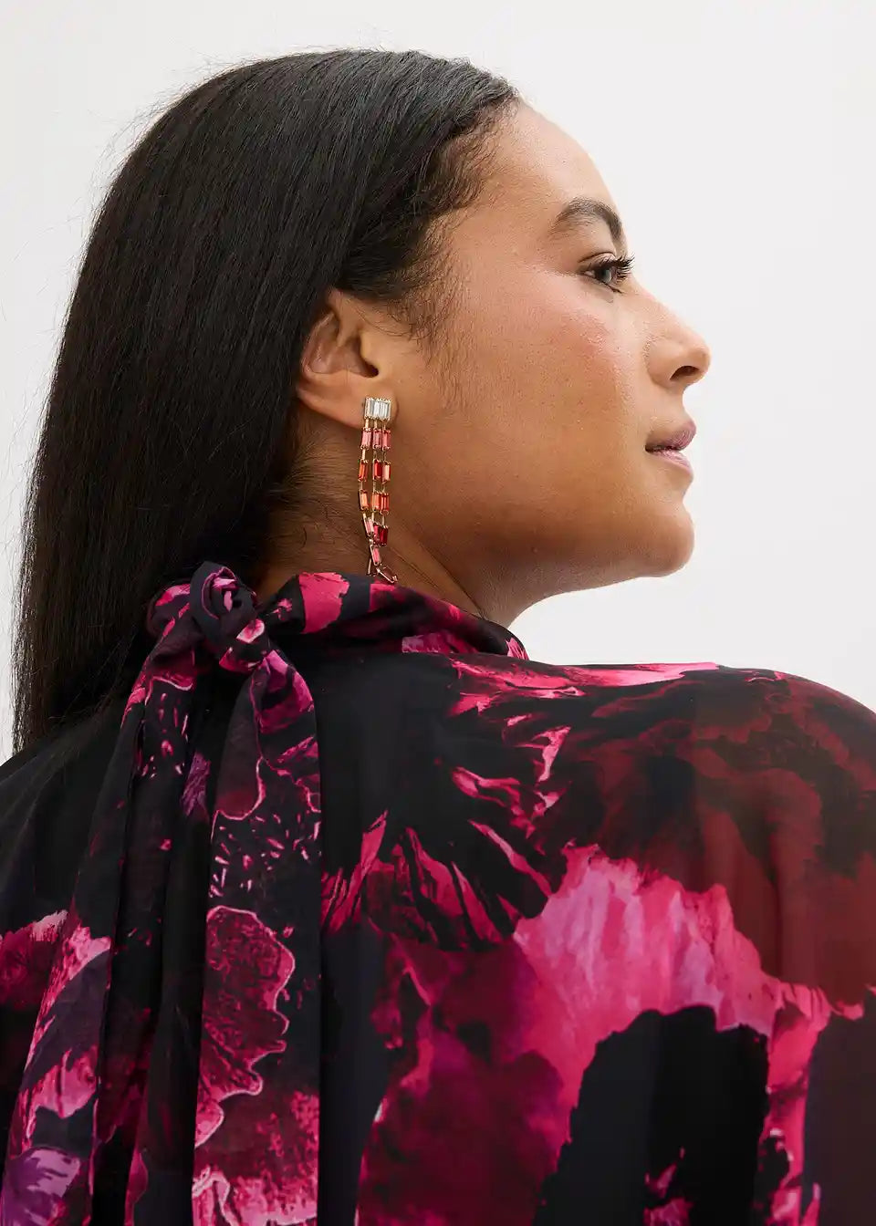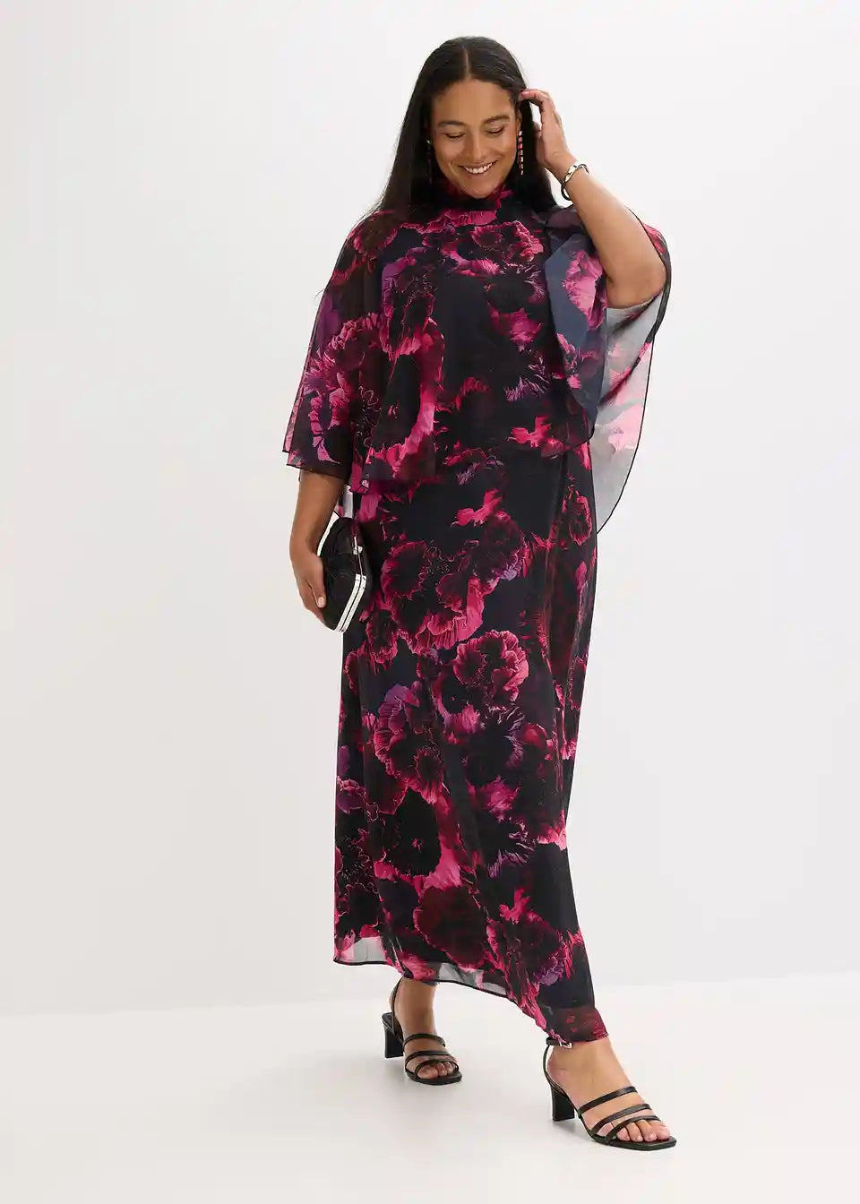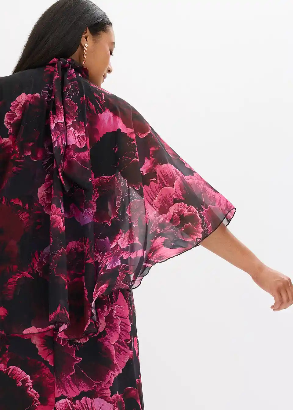 Romantično in ženstveno: večerna obleka v dolgem kroju iz finega šifona z ogrinjalom in pokončnim ovratnikom z vrvico