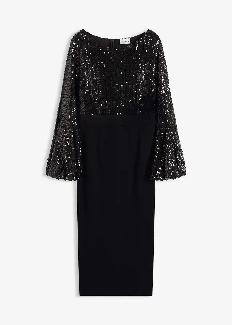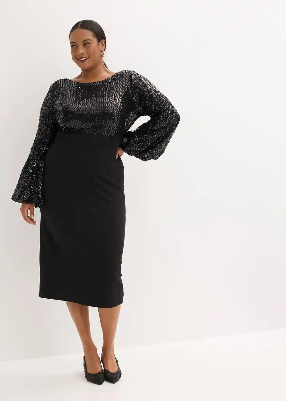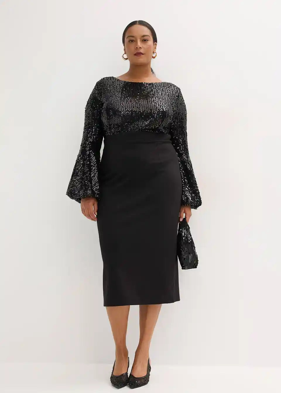 Moderna in ženstvena midi obleka s krilom iz mehkega debelejšega scuba materiala ter zgornjim delom iz sijočih bleščic.
