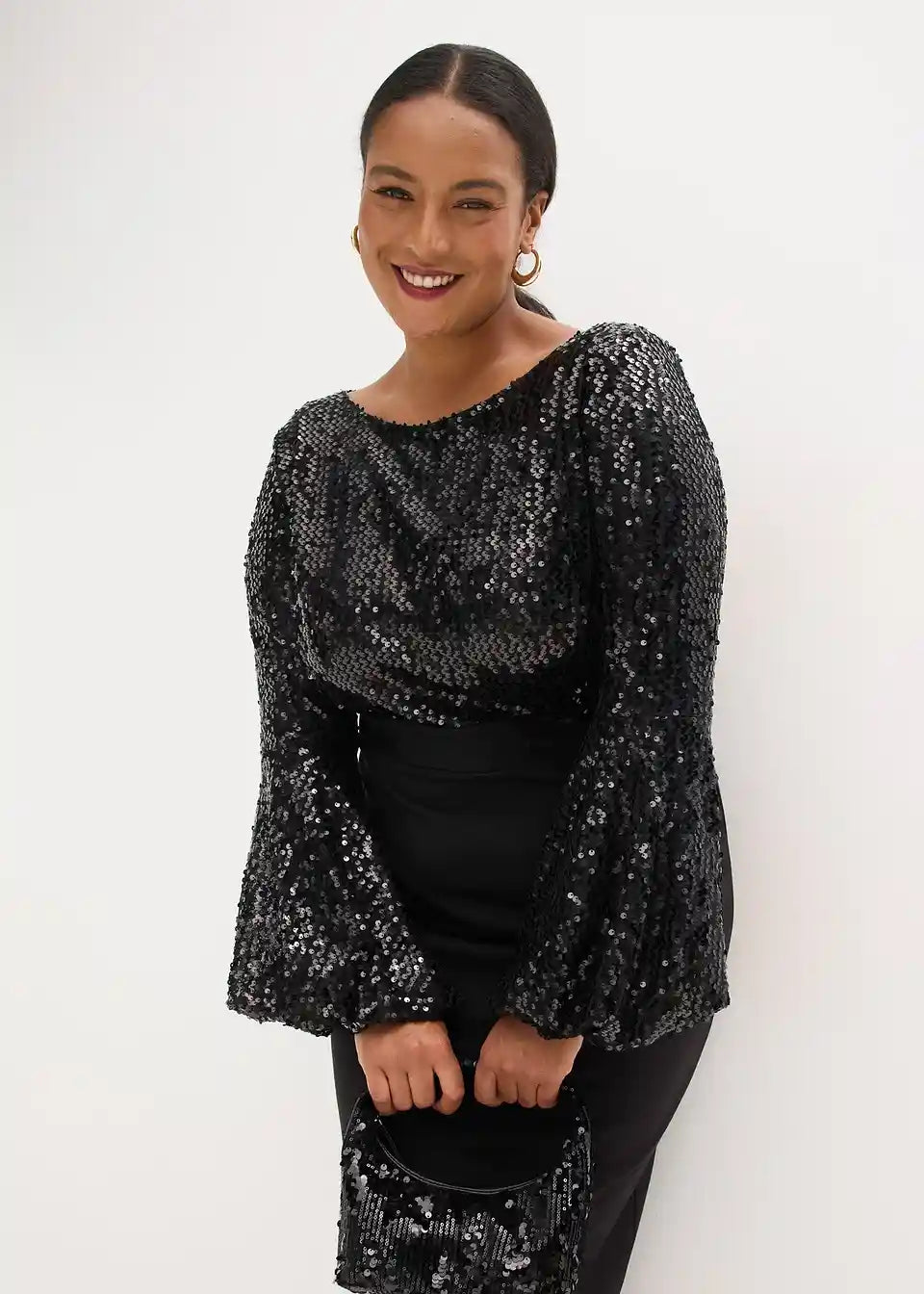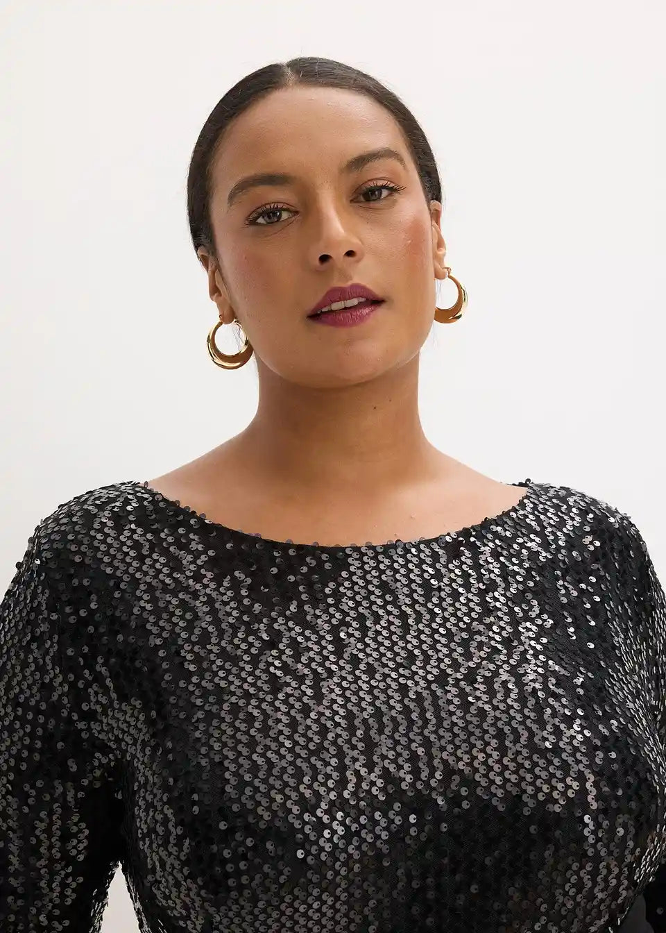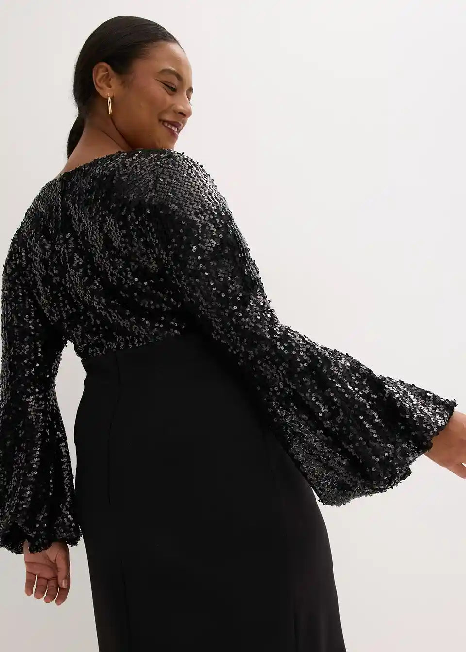 Moderna in ženstvena midi obleka s krilom iz mehkega debelejšega scuba materiala ter zgornjim delom iz sijočih bleščic.