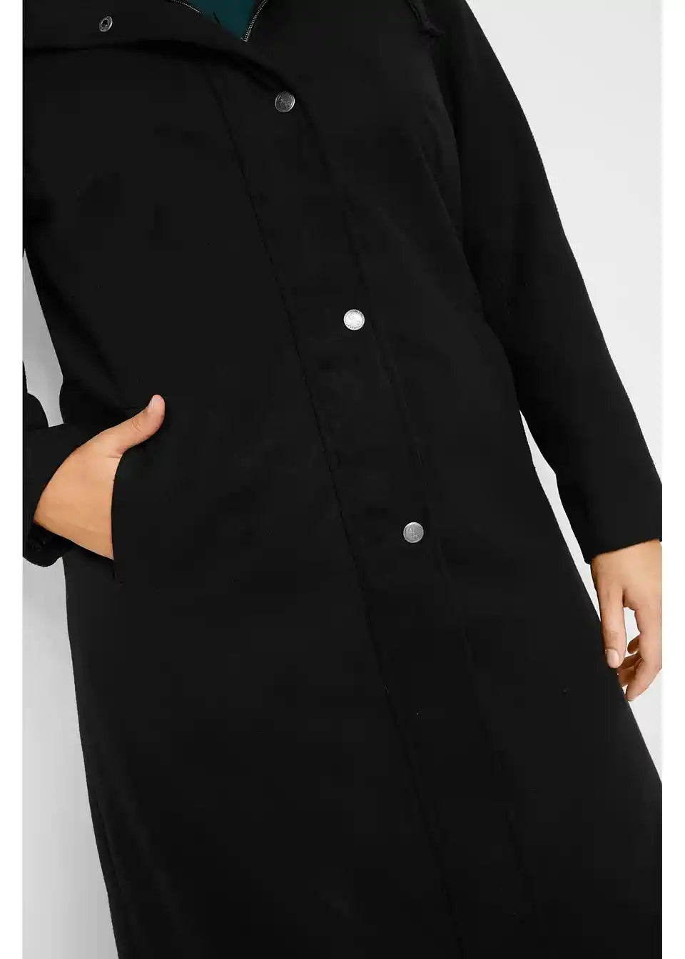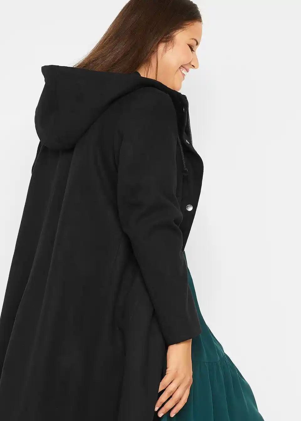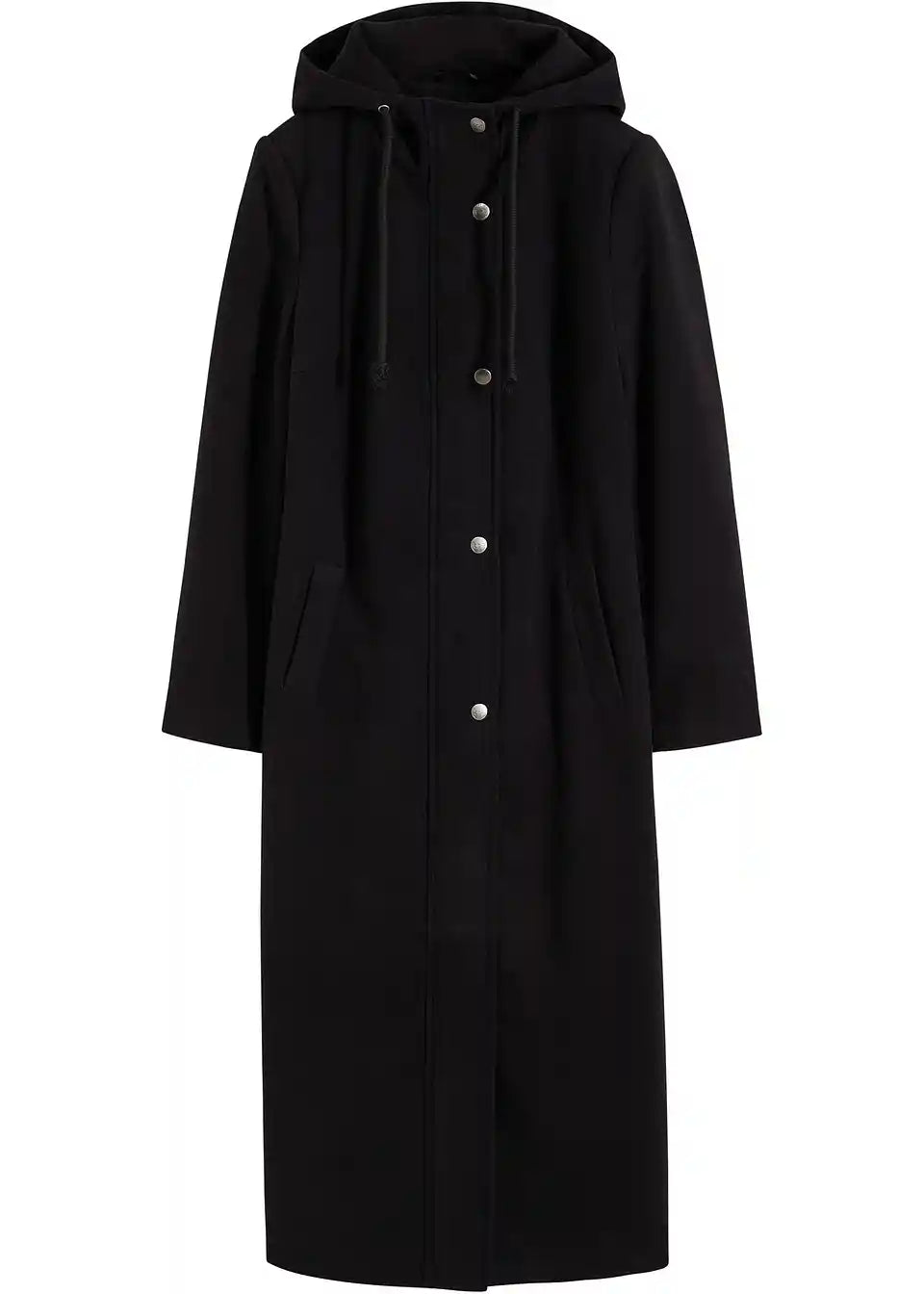 Ležeren dolg plašč v videzu volne s kapuco in vrvico, stranski žepi