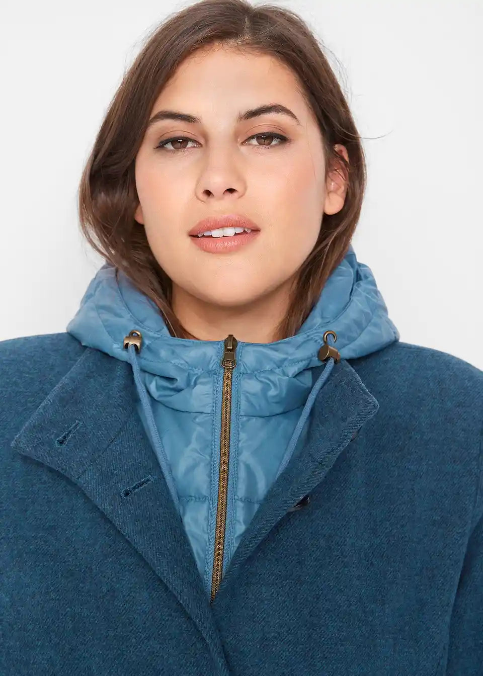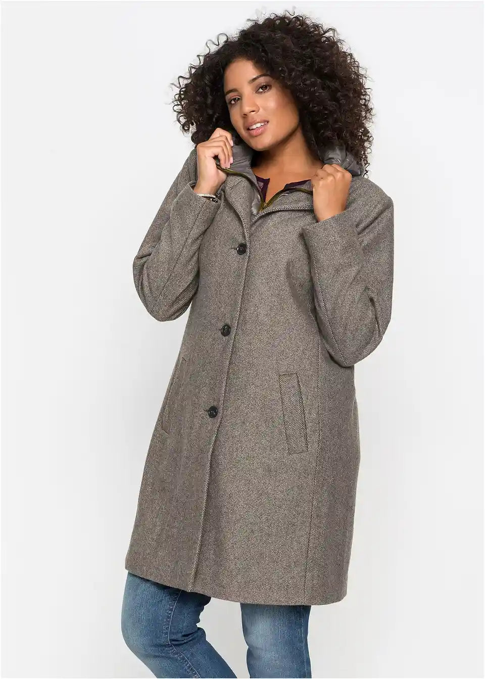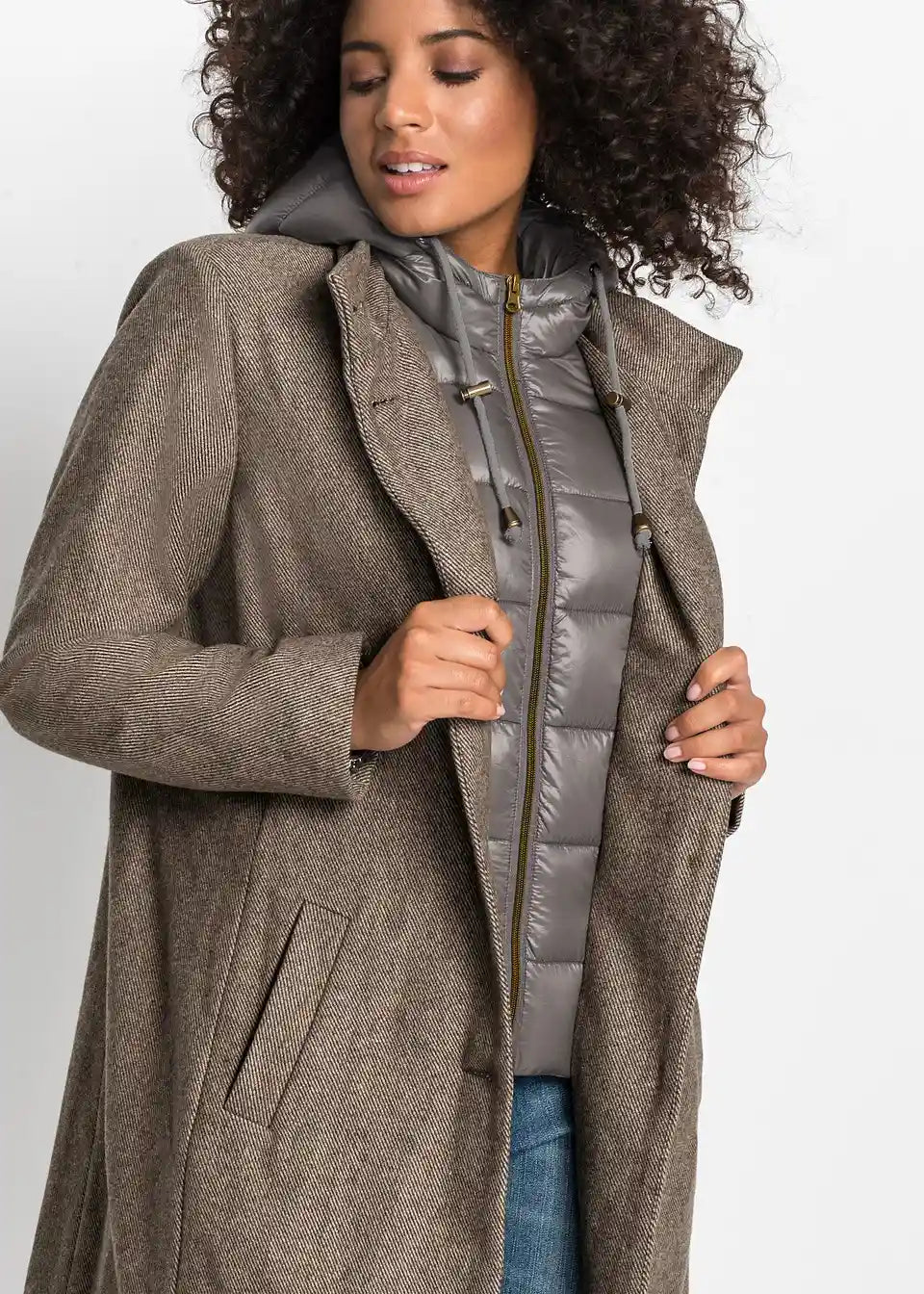 Ta modni zimski plašč v 2-v-1 videzu združuje klasično krojen plašč z dodanim prešitim vložkom. Zgornji plašč prepriča z jasnimi linijami in se zapenja z dekorativnimi gumbi.