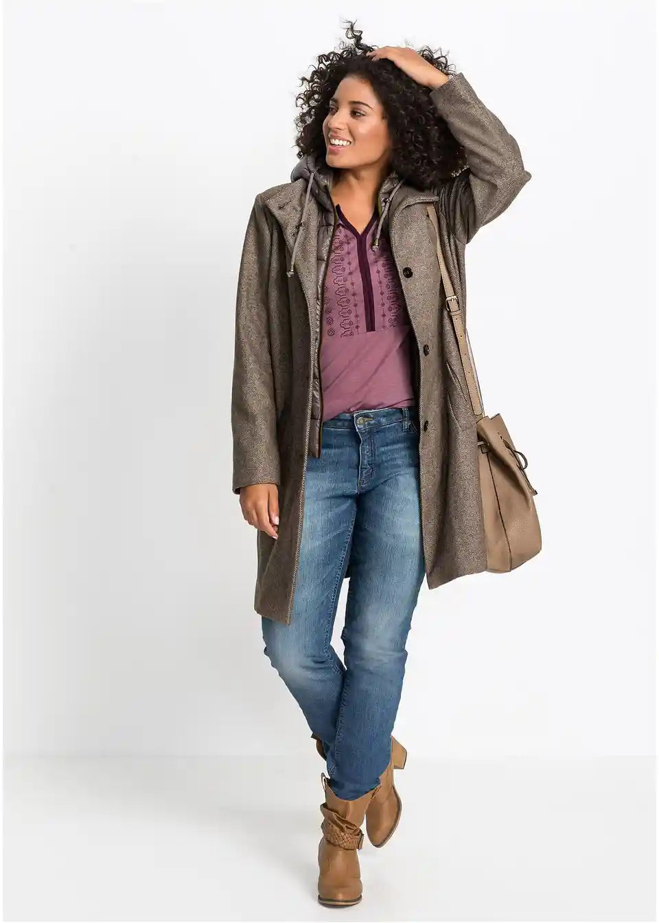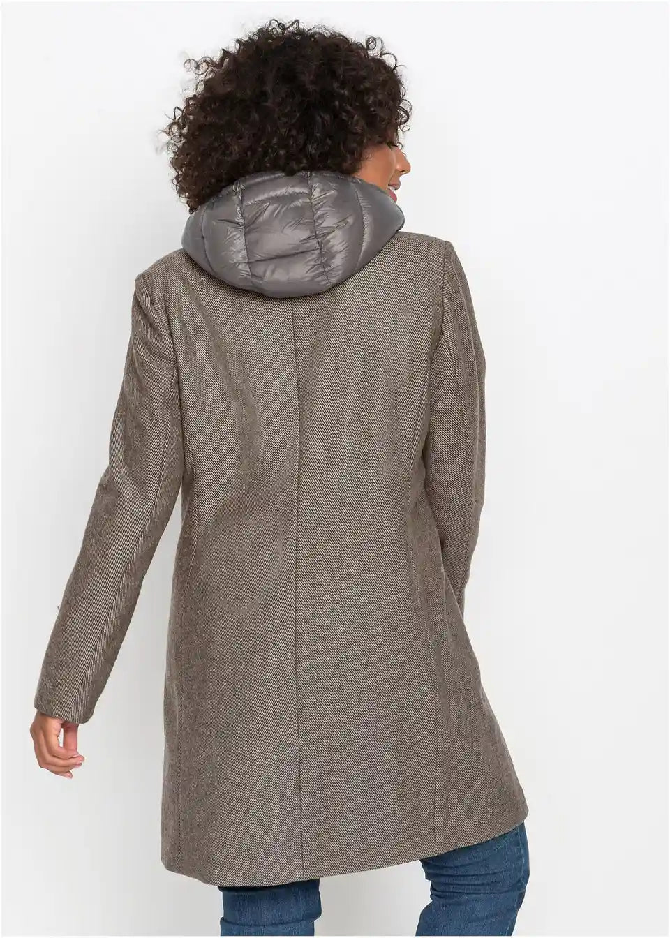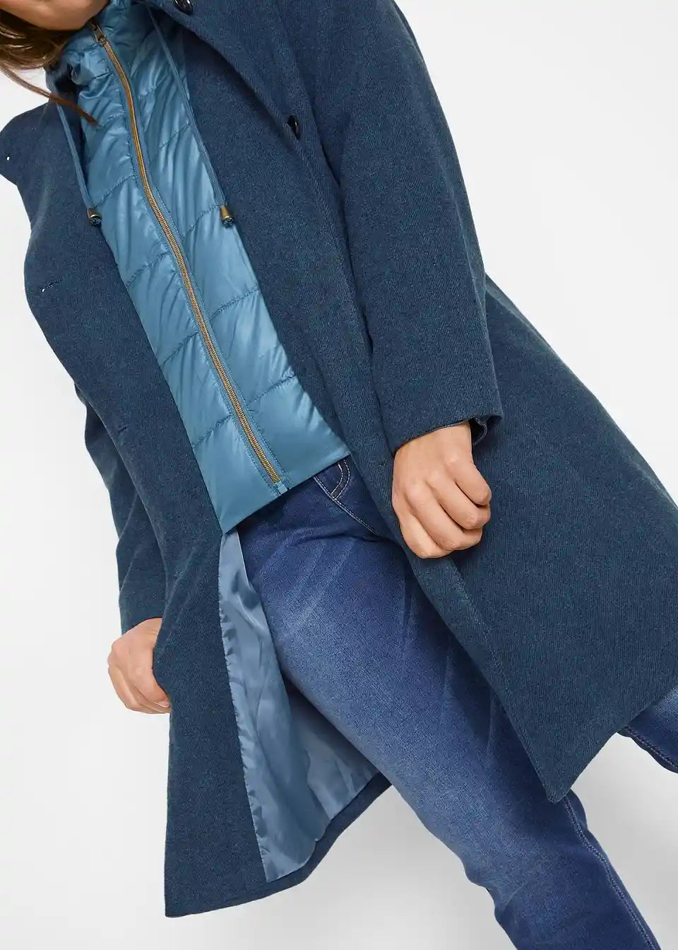Ta modni zimski plašč v 2-v-1 videzu združuje klasično krojen plašč z dodanim prešitim vložkom. Zgornji plašč prepriča z jasnimi linijami in se zapenja z dekorativnimi gumbi.