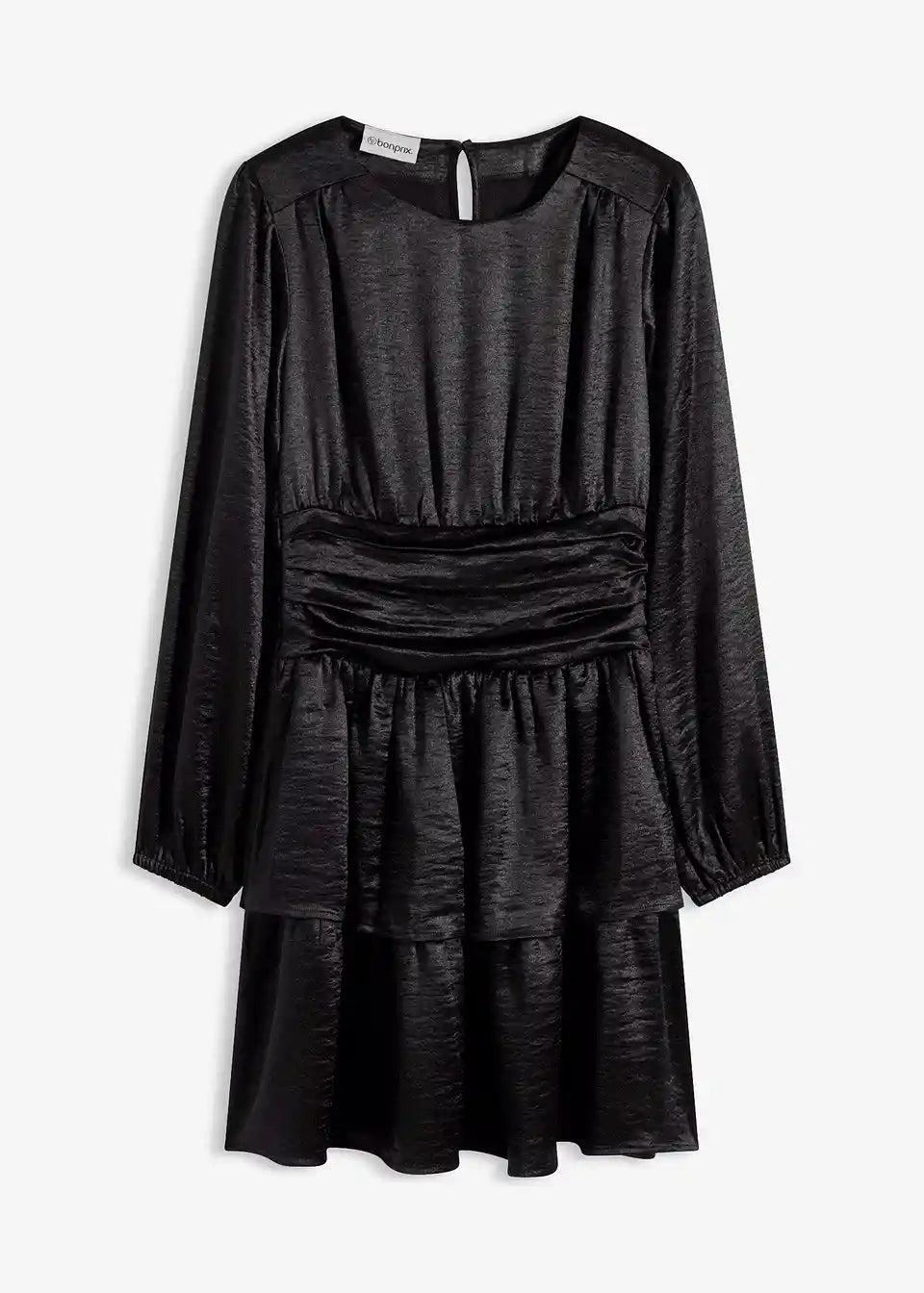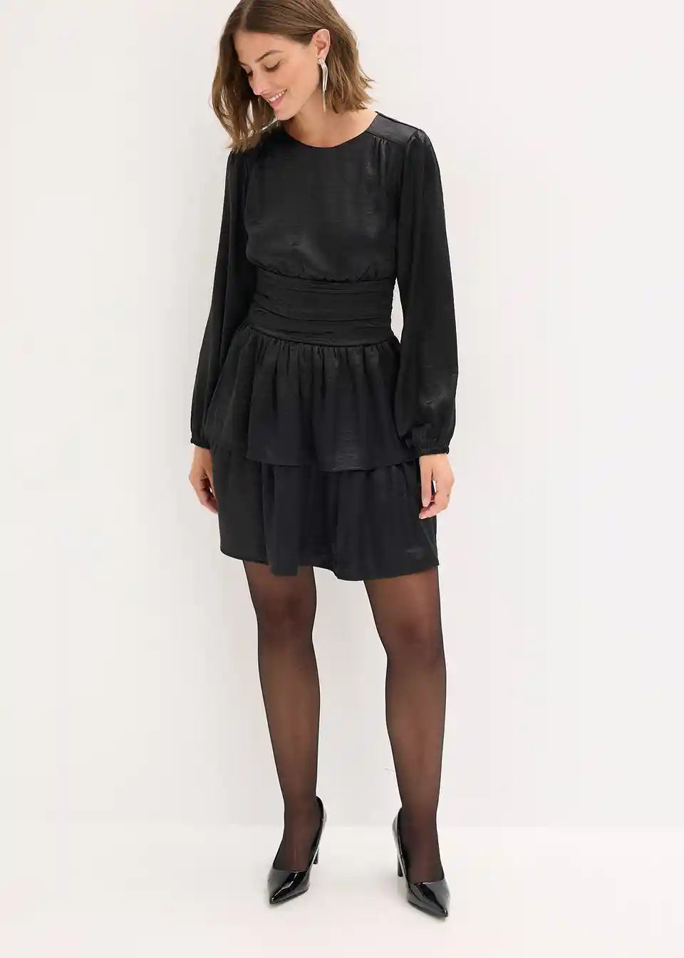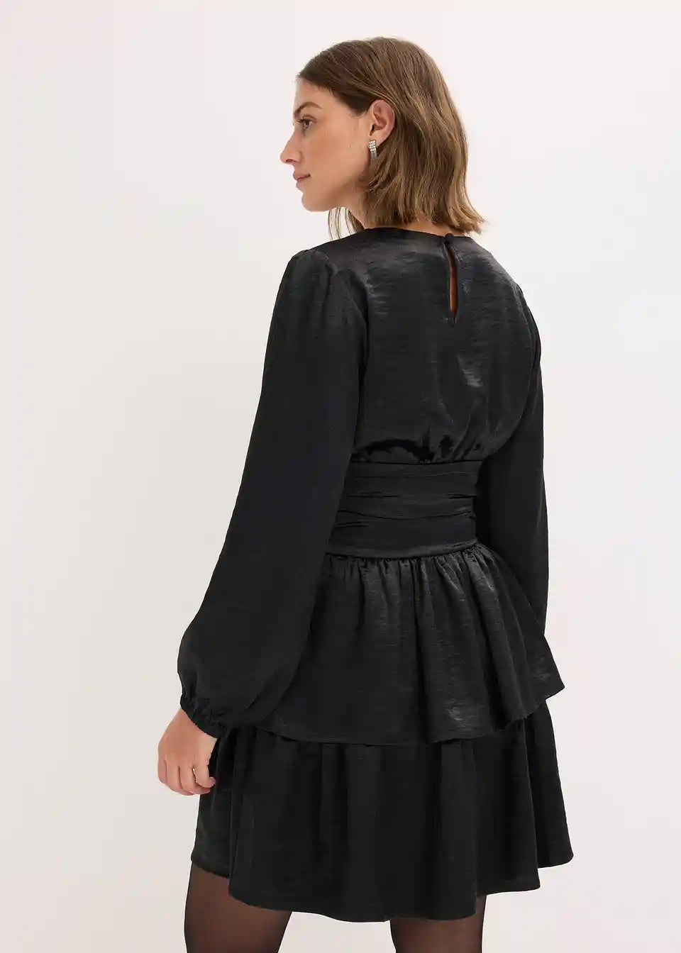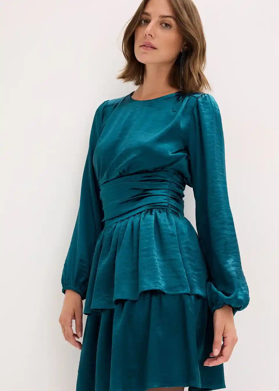 Kratka obleka z volani, balonastimi rokavi in nabranim pasom