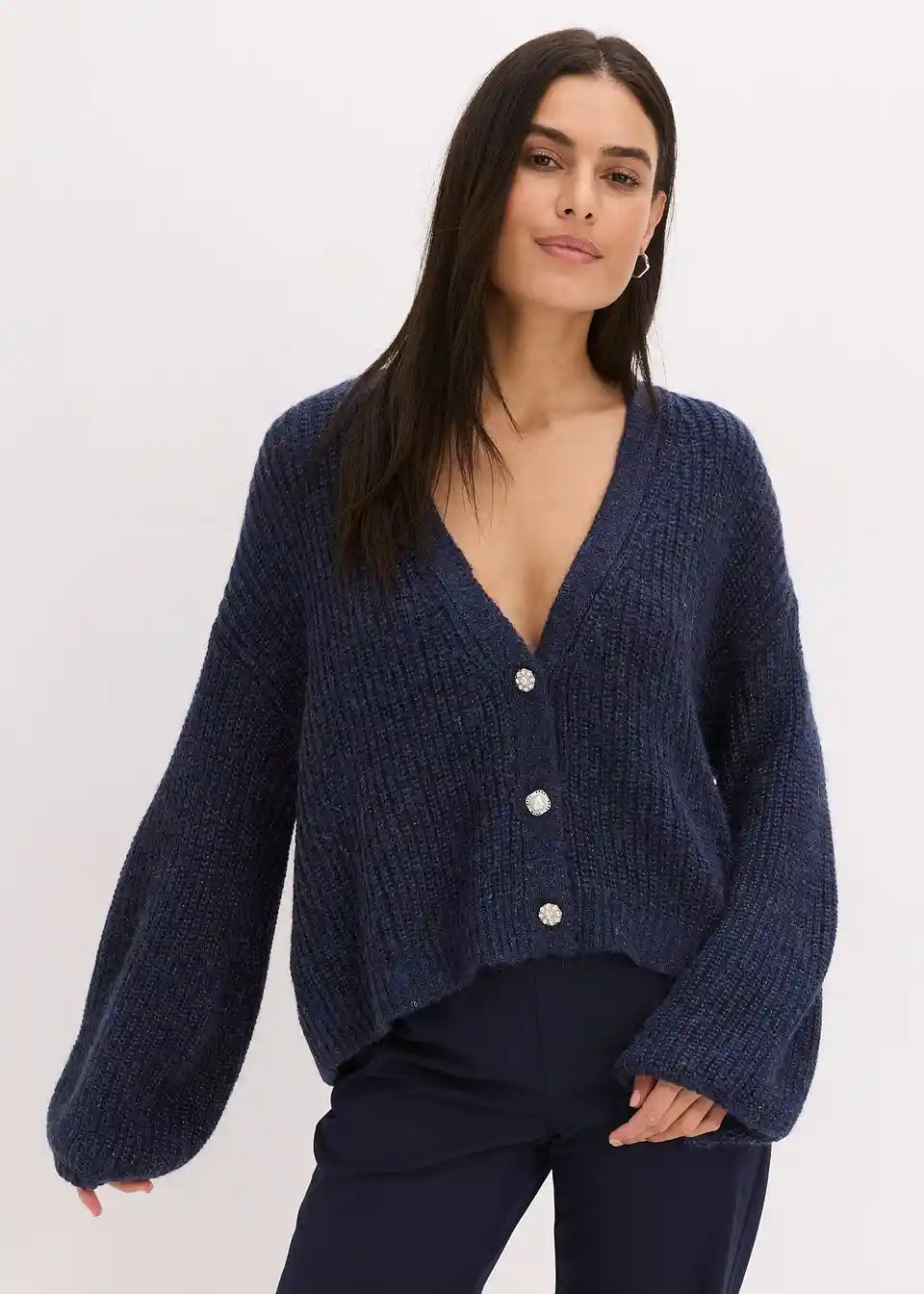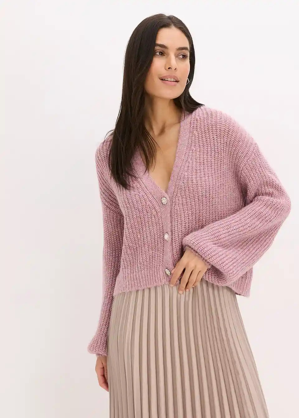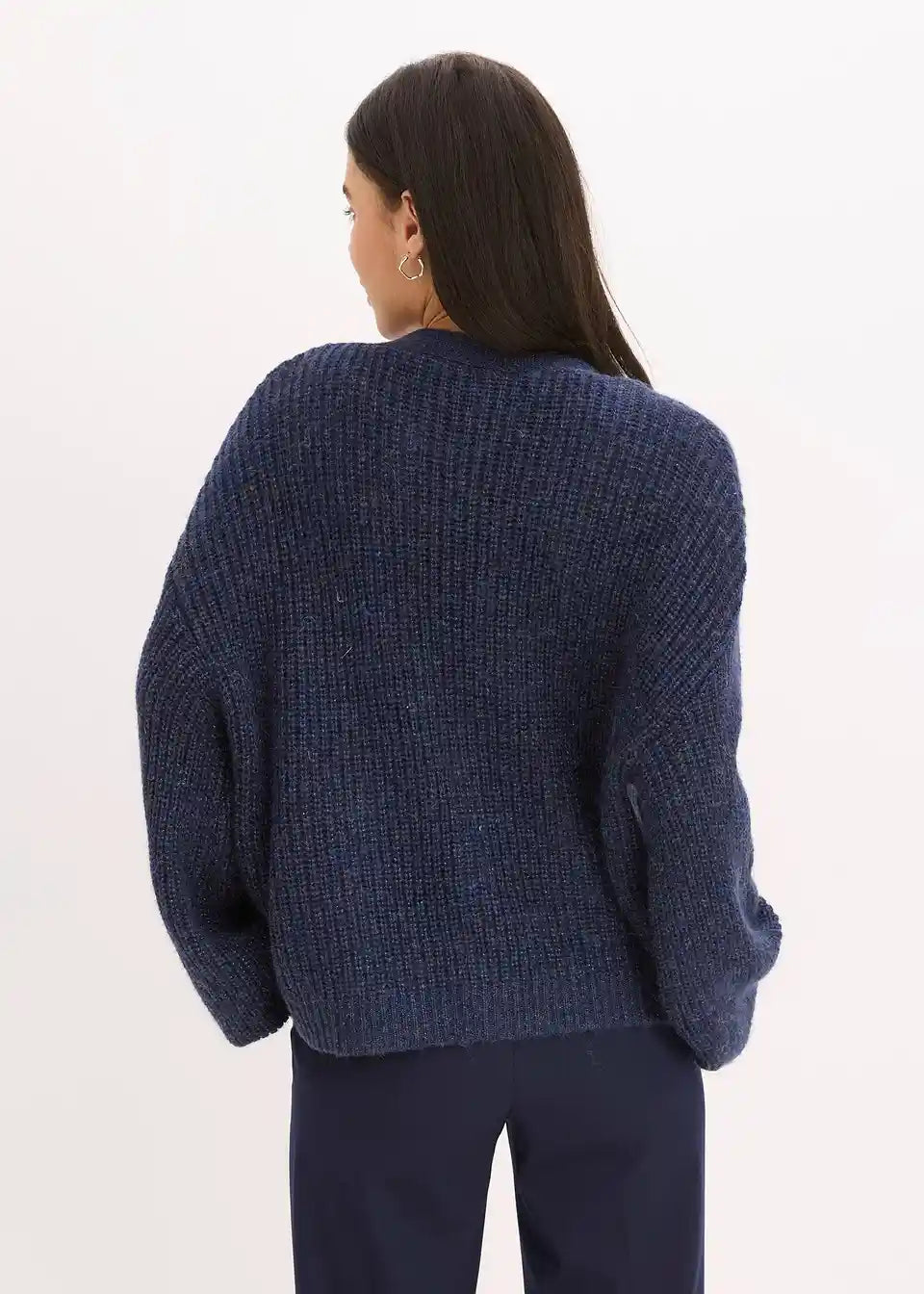 Stilna ohlapna pletena jopa s sijočimi vlakni in deležem volne