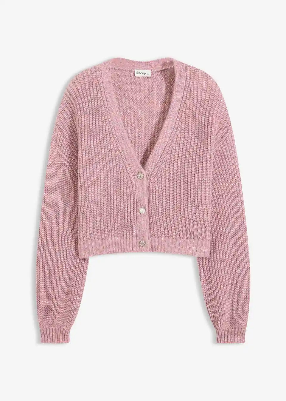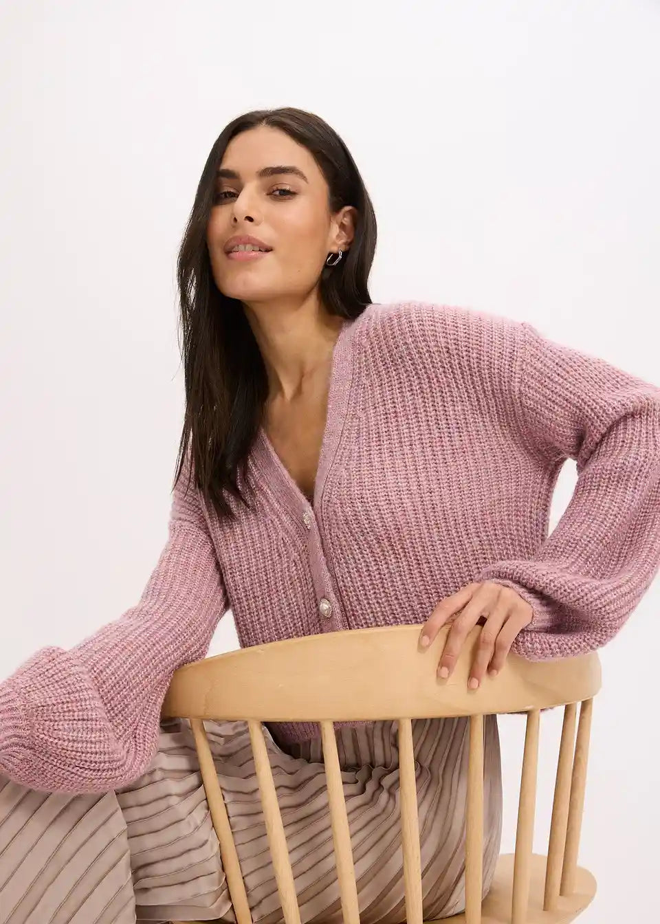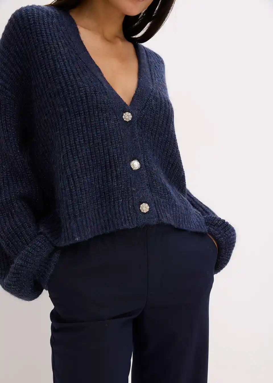 Stilna ohlapna pletena jopa s sijočimi vlakni in deležem volne