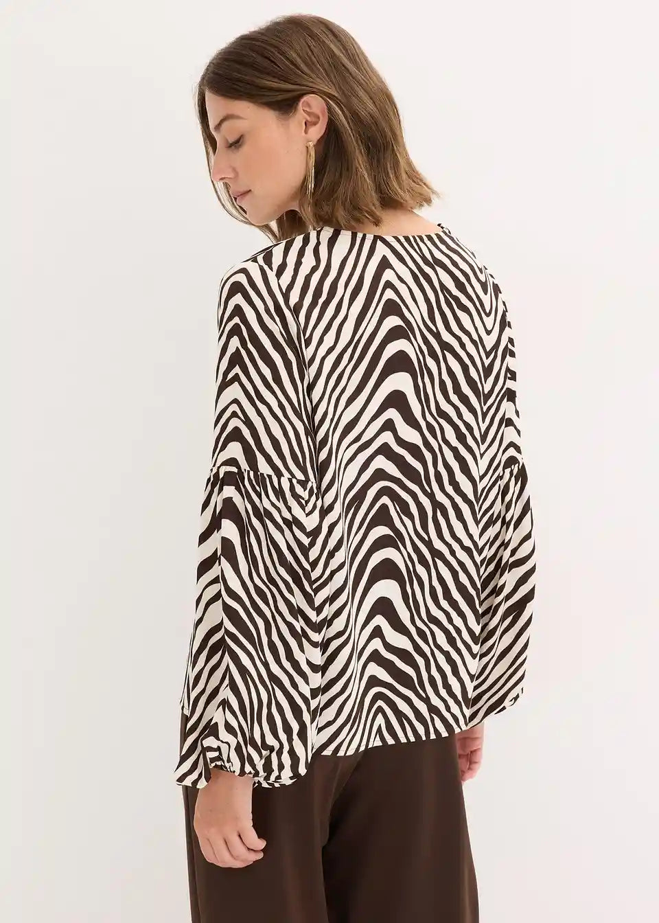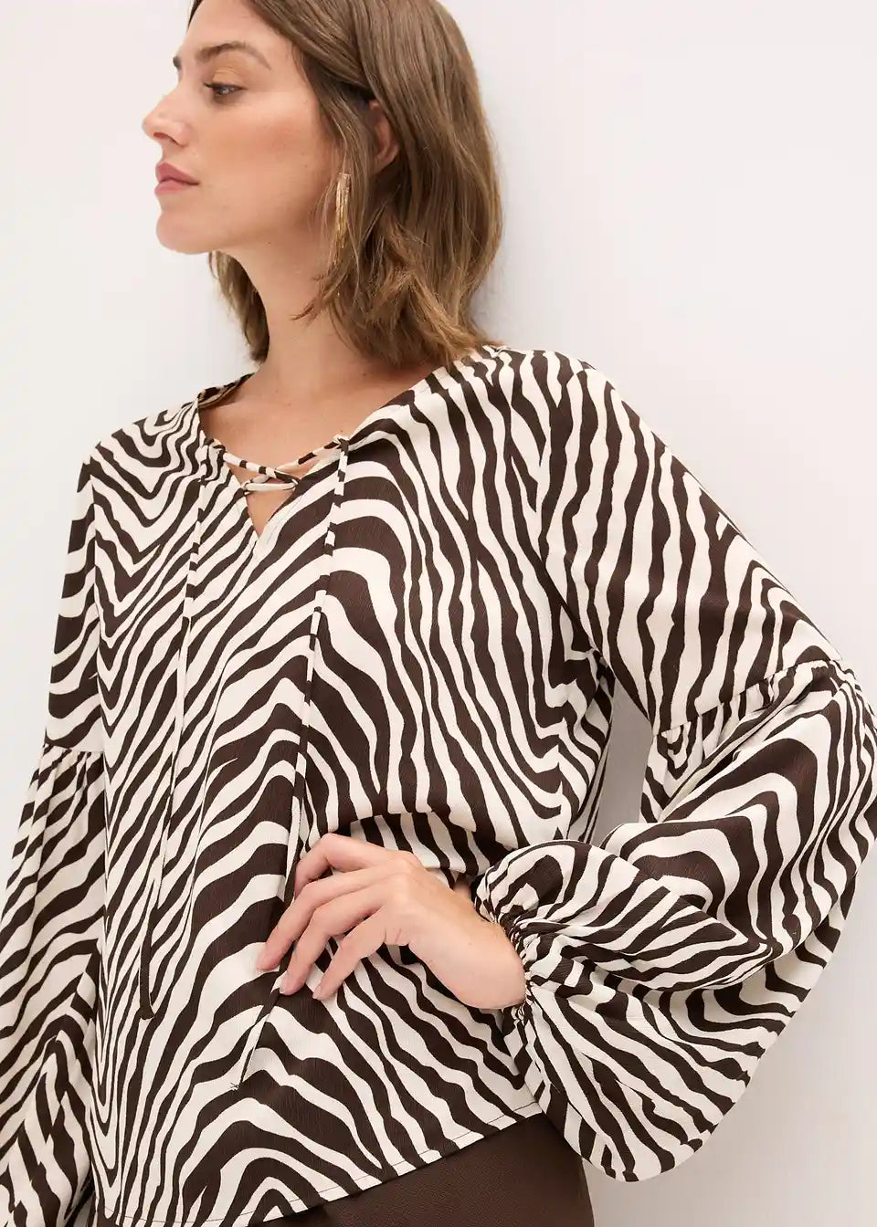 Modno potiskana bluzna tunika z voluminoznimi rokavi in trakom za zavezovanje spredaj na V-izrezu.