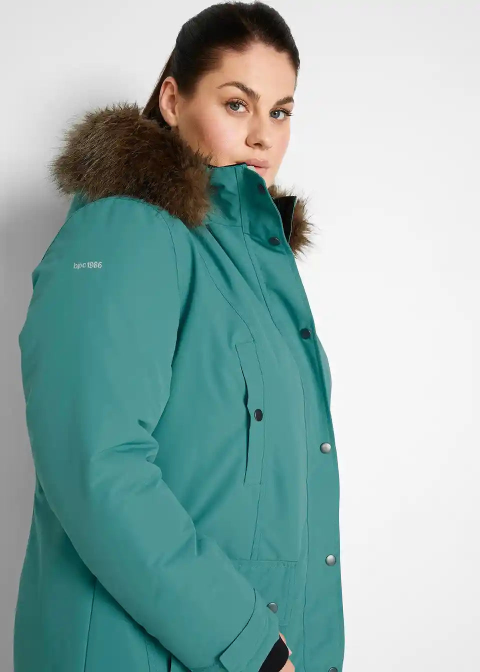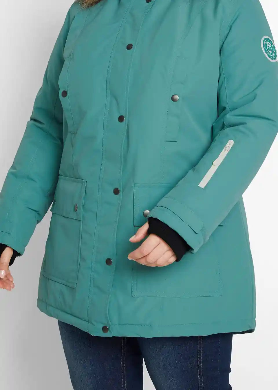 2-smerna zadrga z zaščito za brado, kapuca in umetno krzno sta odstranljiva, notranji žep z vodenjem kablov, odprtine za palce, črtasta notranja podloga, dolžina pri vel. 42 približno 86 cm.