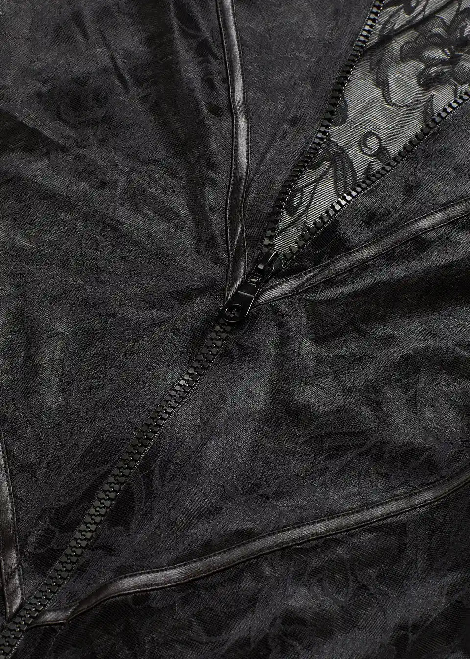 Obleka s čipko, zadrgo in okrasnimi šivi.