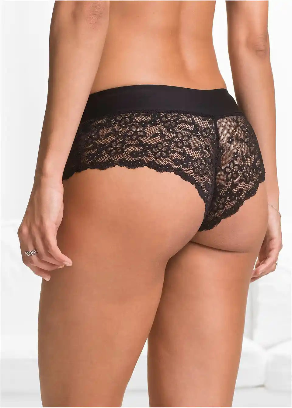 Popolnoma izdelane iz visokokakovostne, prosojne čipke, hlačke iz kolekcije BODYFLIRT delujejo zelo čutno. Širok pas v elegantni črni barvi ustvarja čudovit kontrast z delno prosojno čipko. Na zaključku hlačnic se čudovita čipka zaključi z zapeljivimi, drobnimi obrobami, ki poudarjajo ženstveni videz na zapeljiv način. Majhna pentlja krasi pas in zaokroži obetaven dizajn. Podloga na mednožju je iz bombaža.