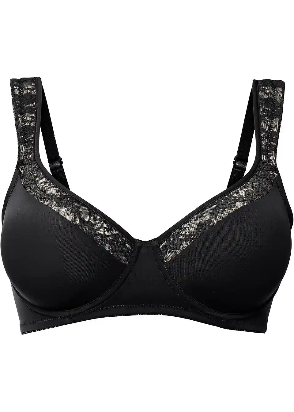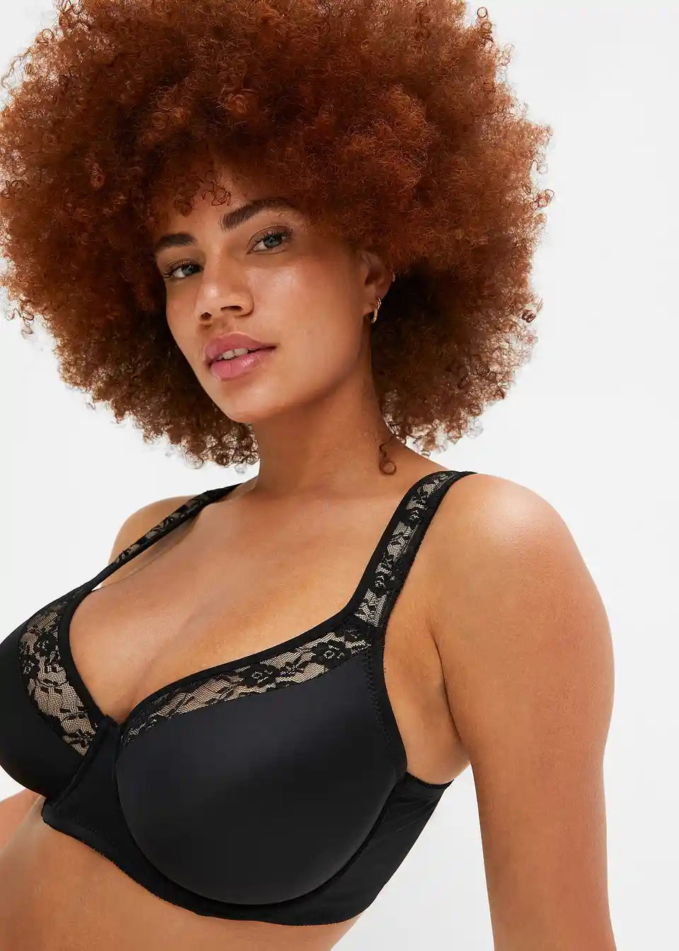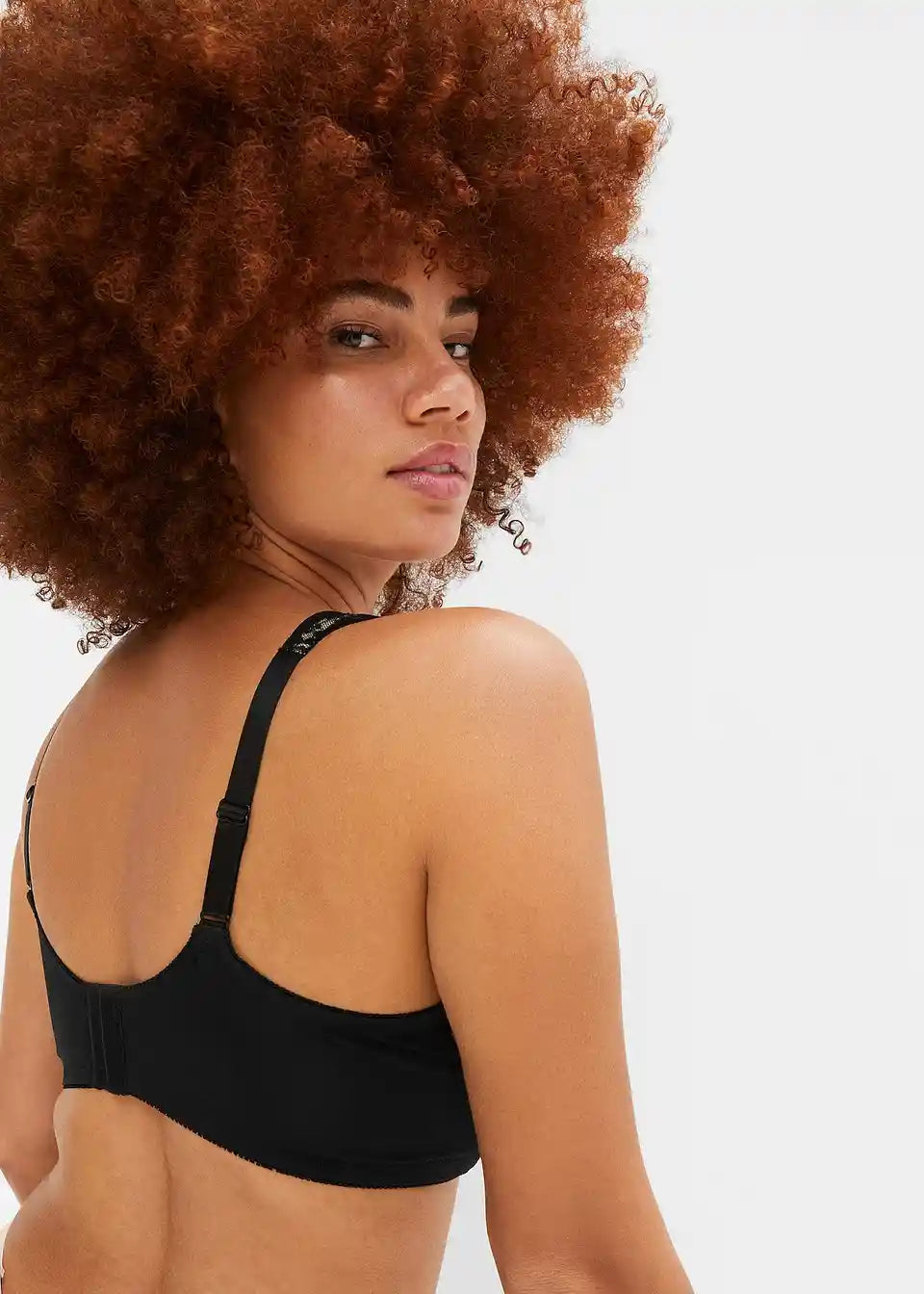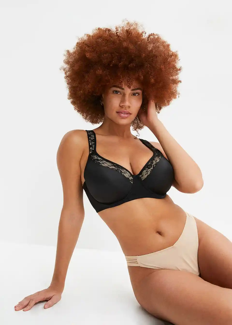 Enostavna eleganca sreča nežne detajle. Ta podložen nedrček znamke bpc selection poudari klasičen stil nosilke s čistimi linijami in brezčasnim dizajnom. Čipkasti rob na zgornjem delu košarice nežno obrobi dekolte. Rahlo podložene, brezšivno oblikovane košarice in mehke opore zagotavljajo oporo in visoko udobje. Nedrček se na hrbtni strani zapenja s kaveljčki in očesi ter omogoča prilagoditev v treh ravneh za popolno prileganje.
