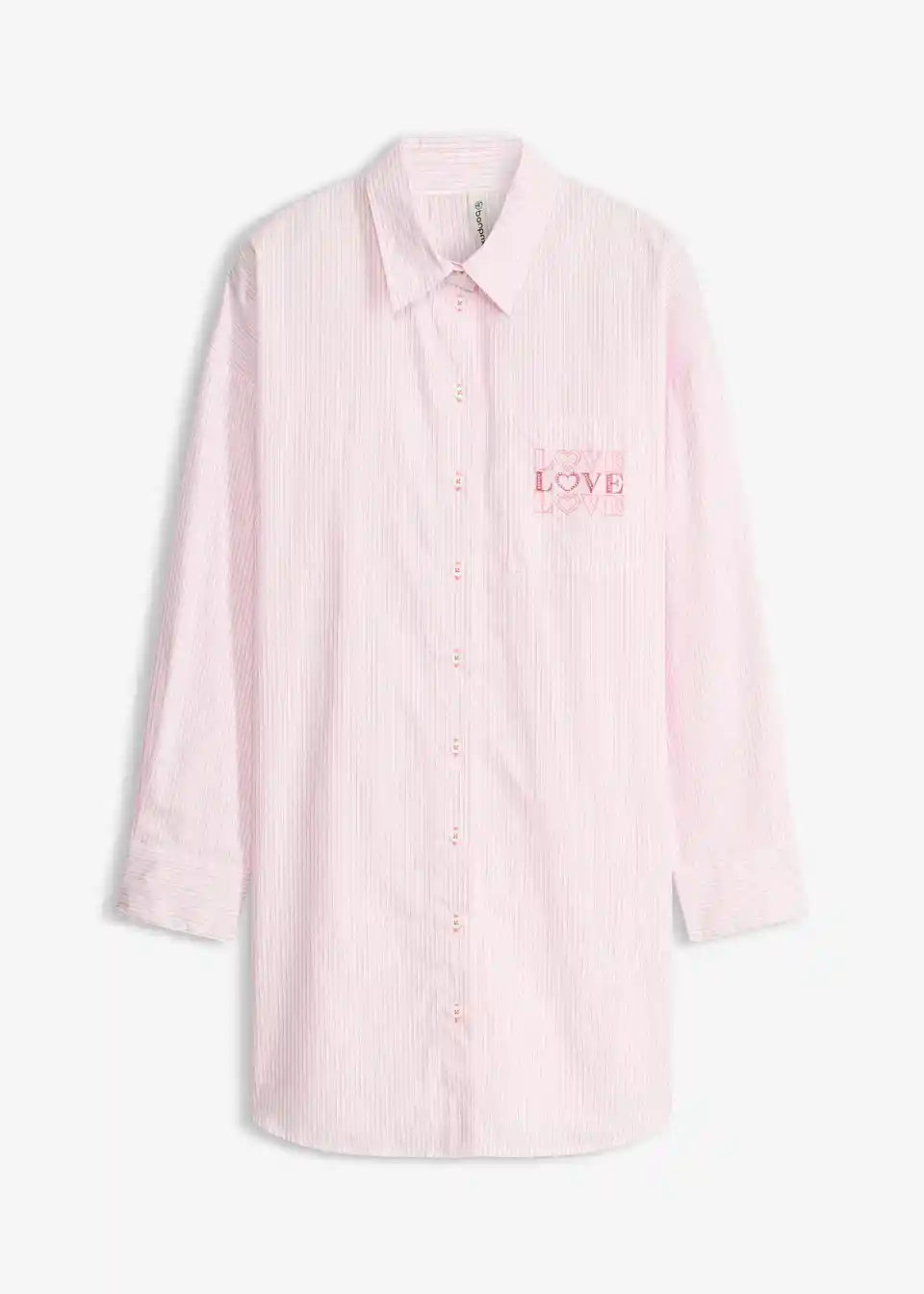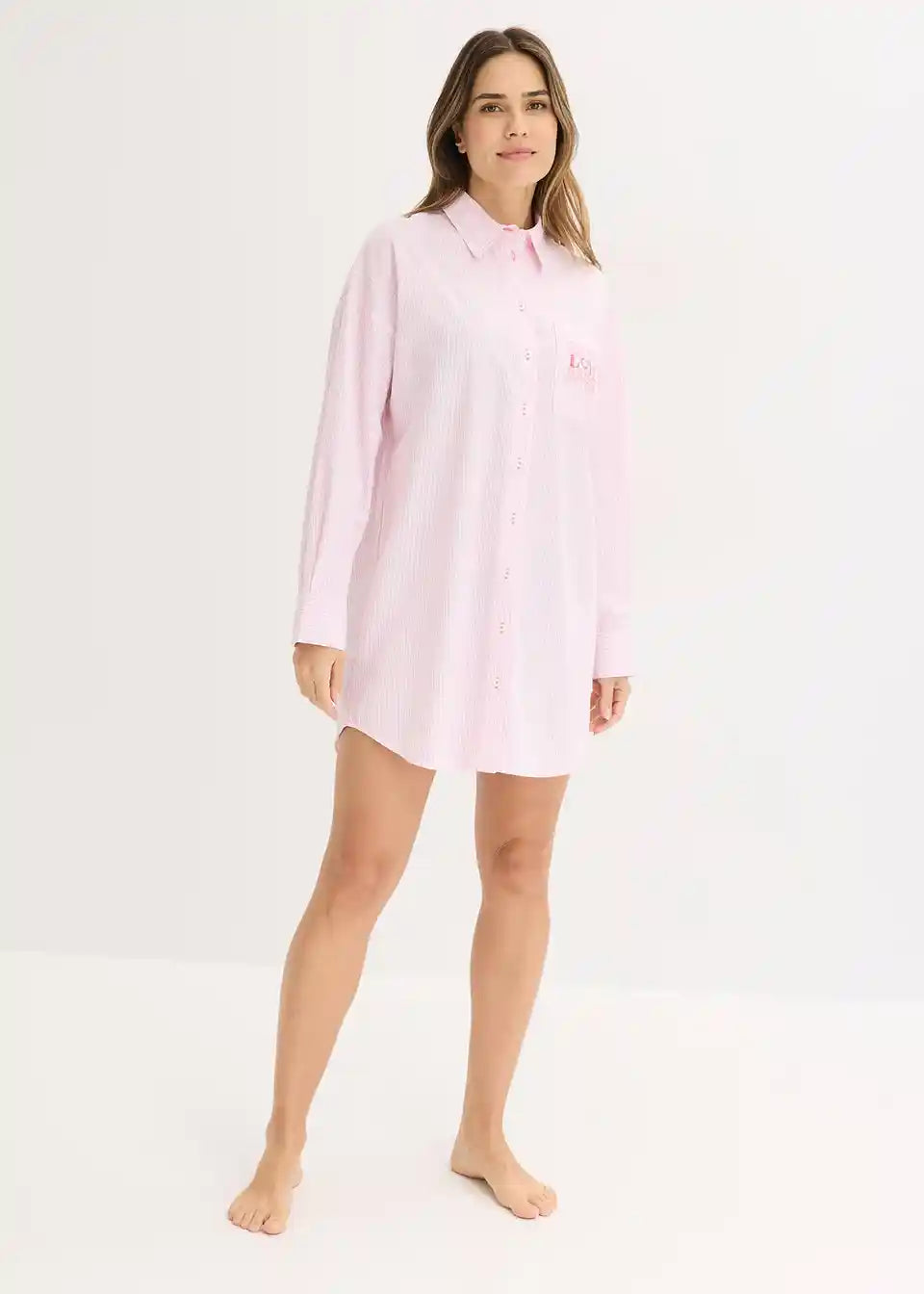 Tkana široko krojena spalna srajca v modnem v boyfriend kroju s srajčnim ovratnikom in naprsnim žepom z ljubkim potiskom