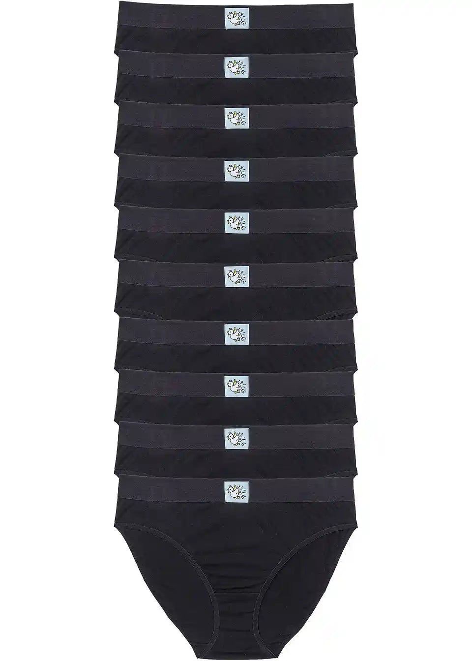 Udobne hlačke iz čistega bombaža so idealno vsakodnevno spodnje perilo. Privlačen našitek z logotipom krasi pas tega lepega osnovnega kosa znamke bpc. Tudi predel mednožja je iz bombaža. Na voljo so štiri barvne kombinacije v ugodnem desetdelnem paketu. Obstaja paket z 10 belimi in paket z 10 črnimi hlačkami. Za popestritev poskrbijo živahni barviti kompleti.