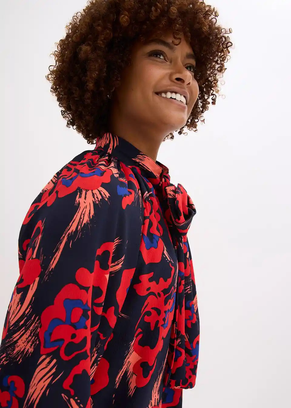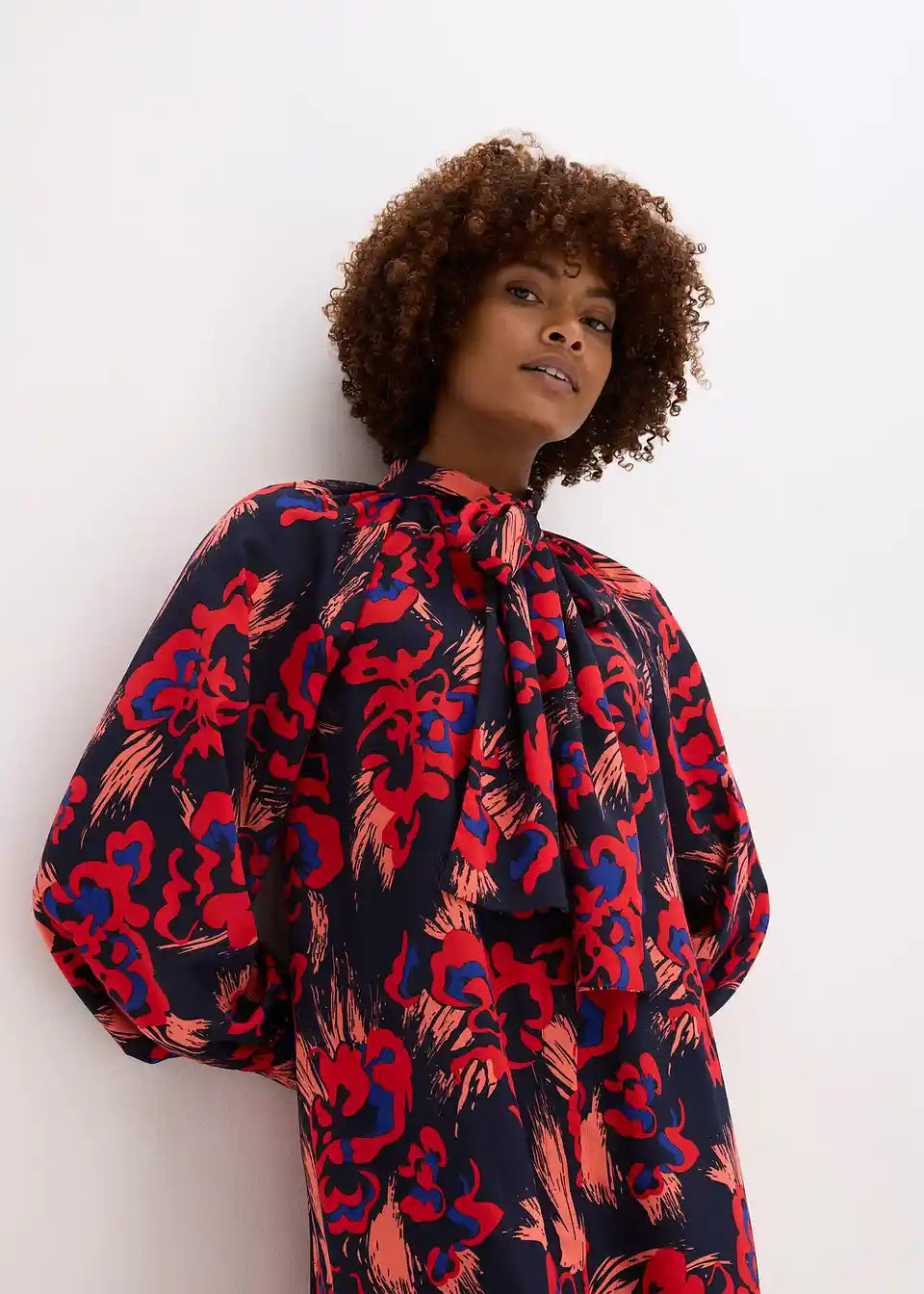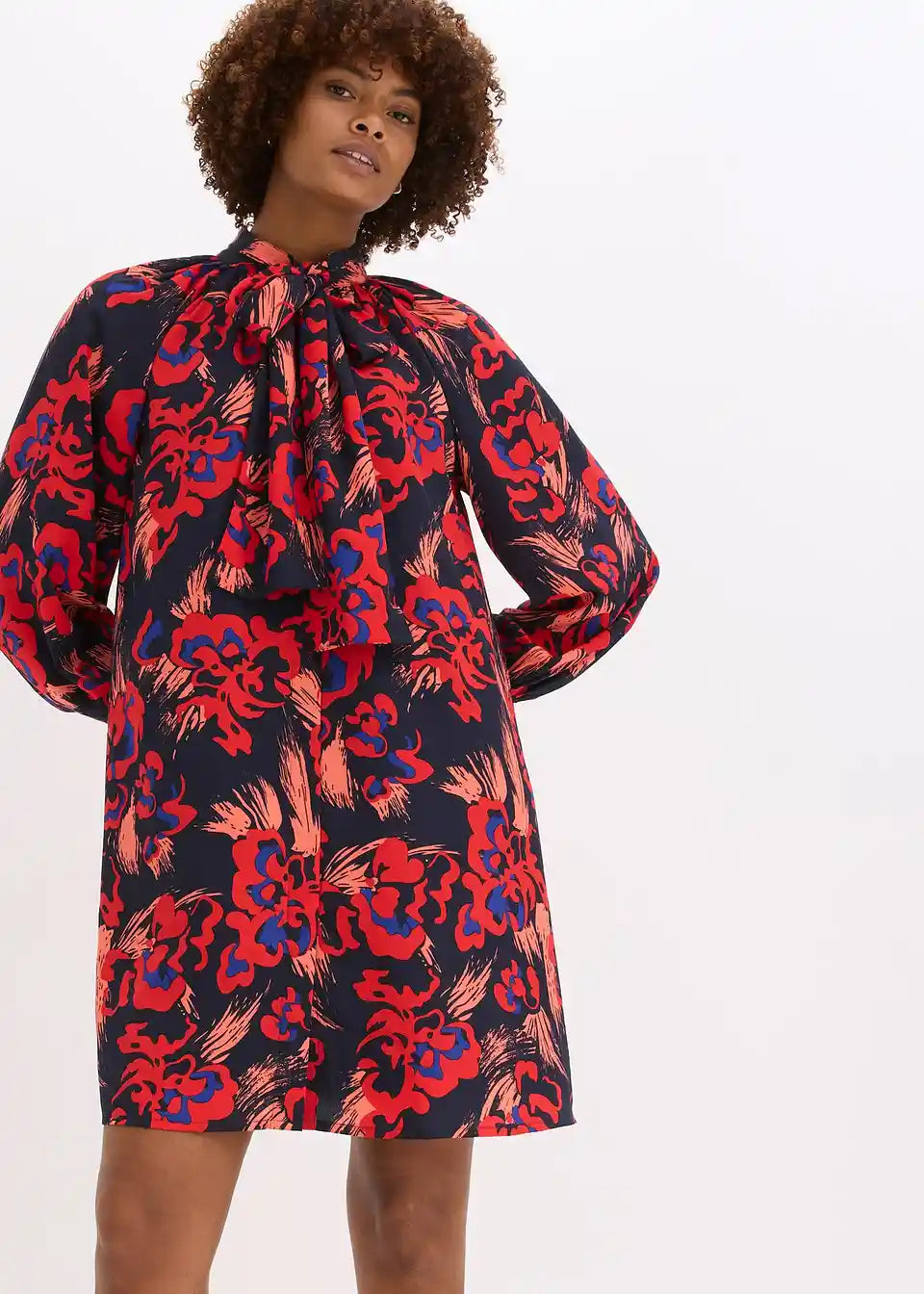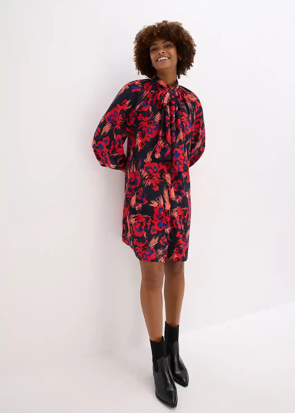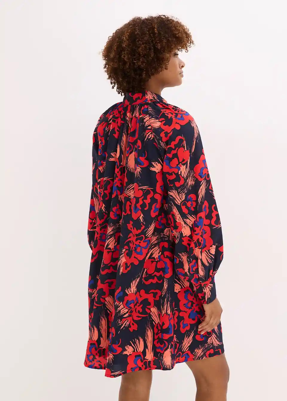 Kratka široka obleka s širokimi rokavi in pentljo na ovratniku