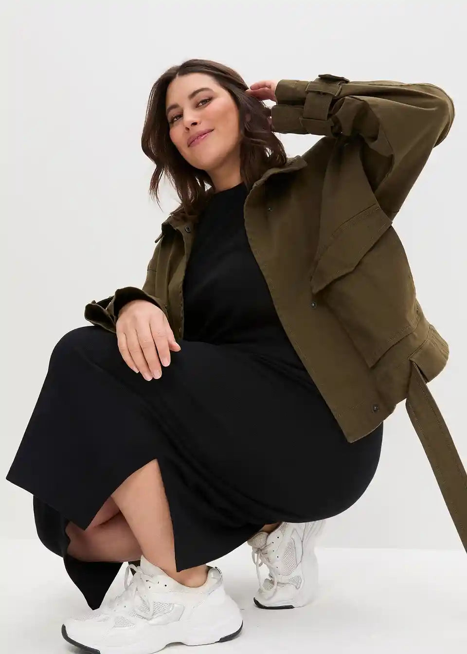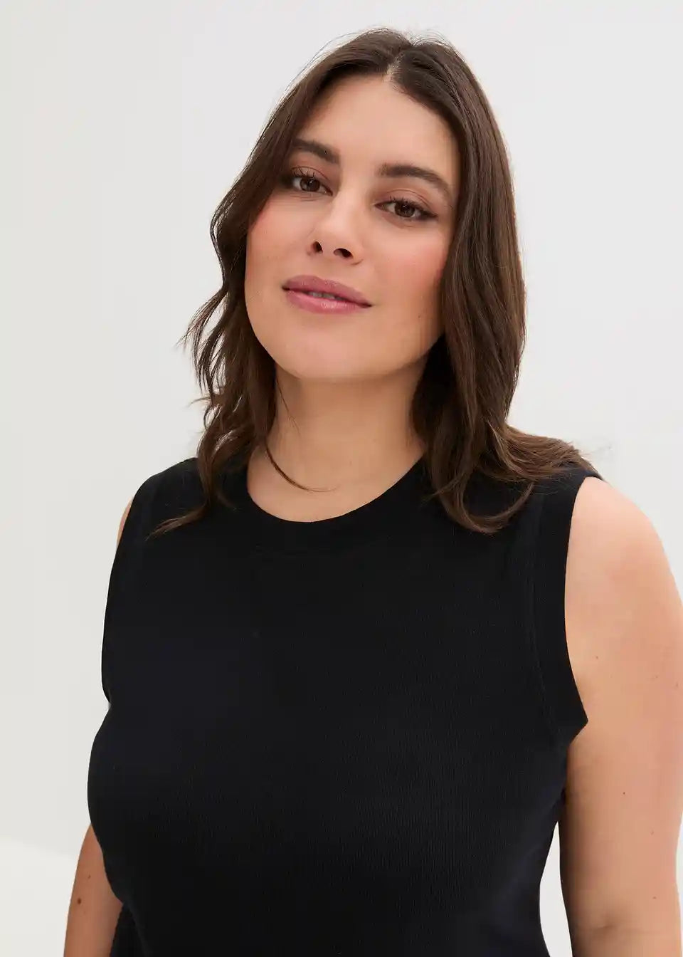Obleka iz rebrastega džersija z okroglim rebrastim izrezom in razporkom