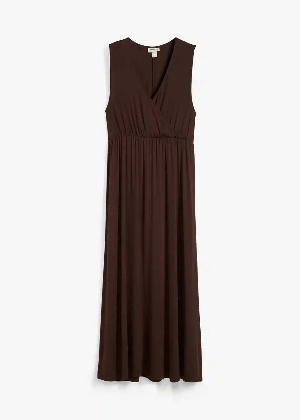 Dolga obleka iz mehke viskoze z dodatkom elastana za udobno nošenje. V-izrez v preklopnem kroju s funkcijo za dojenje omogoča praktično uporabo. Nabrana tkanina pod prsno linijo in na krilu zagotavlja dodatno širino in udobje. Snemljiv trak za zavezovanje omogoča individualno prilagoditev kroja.