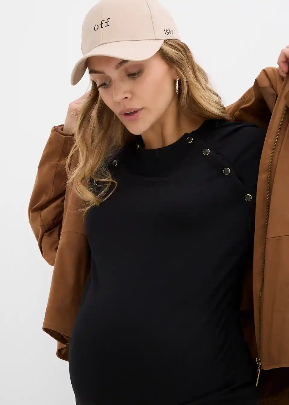 Mehka nosečniška majica iz jerseya iz bio bombaža. S kvadratnim izrezom in raglanskimi rokavi. Okrasni pritiskači na ramenih omogočajo enostavno dojenje.
