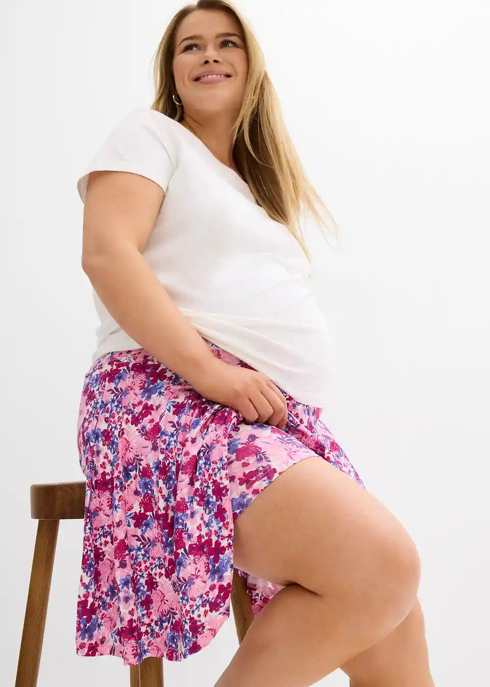 Nosečniško hlačno-krilo iz jerseya z viskozo in dodatkom raztegljivosti ponuja visoko udobje pri nošenju. Skort izgleda na prvi pogled kot krilo, vendar združuje praktično udobje hlač. Elastičen smock pas se prilagodi rastočemu trebuščku in hkrati omogoča fleksibilnost po porodu.