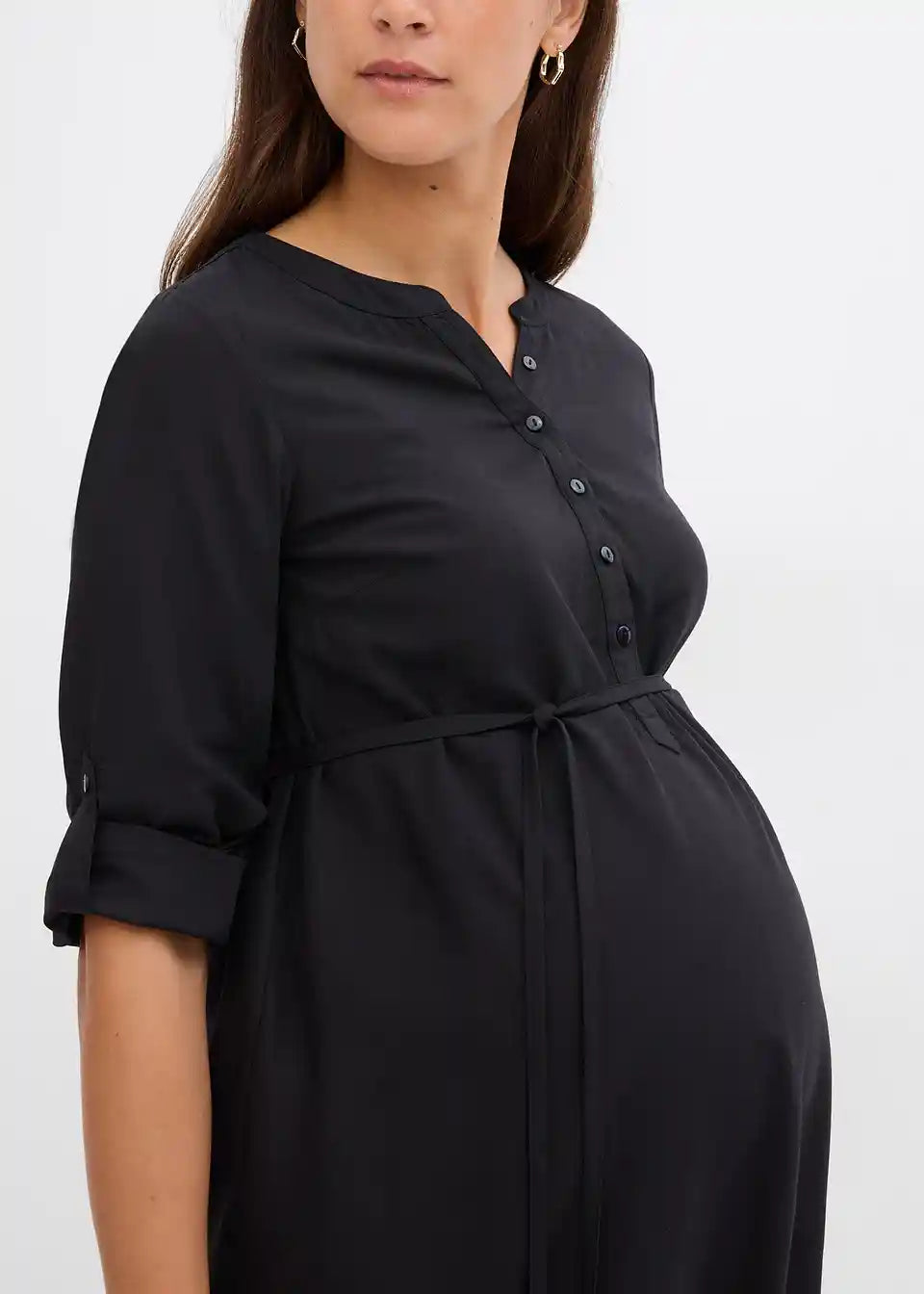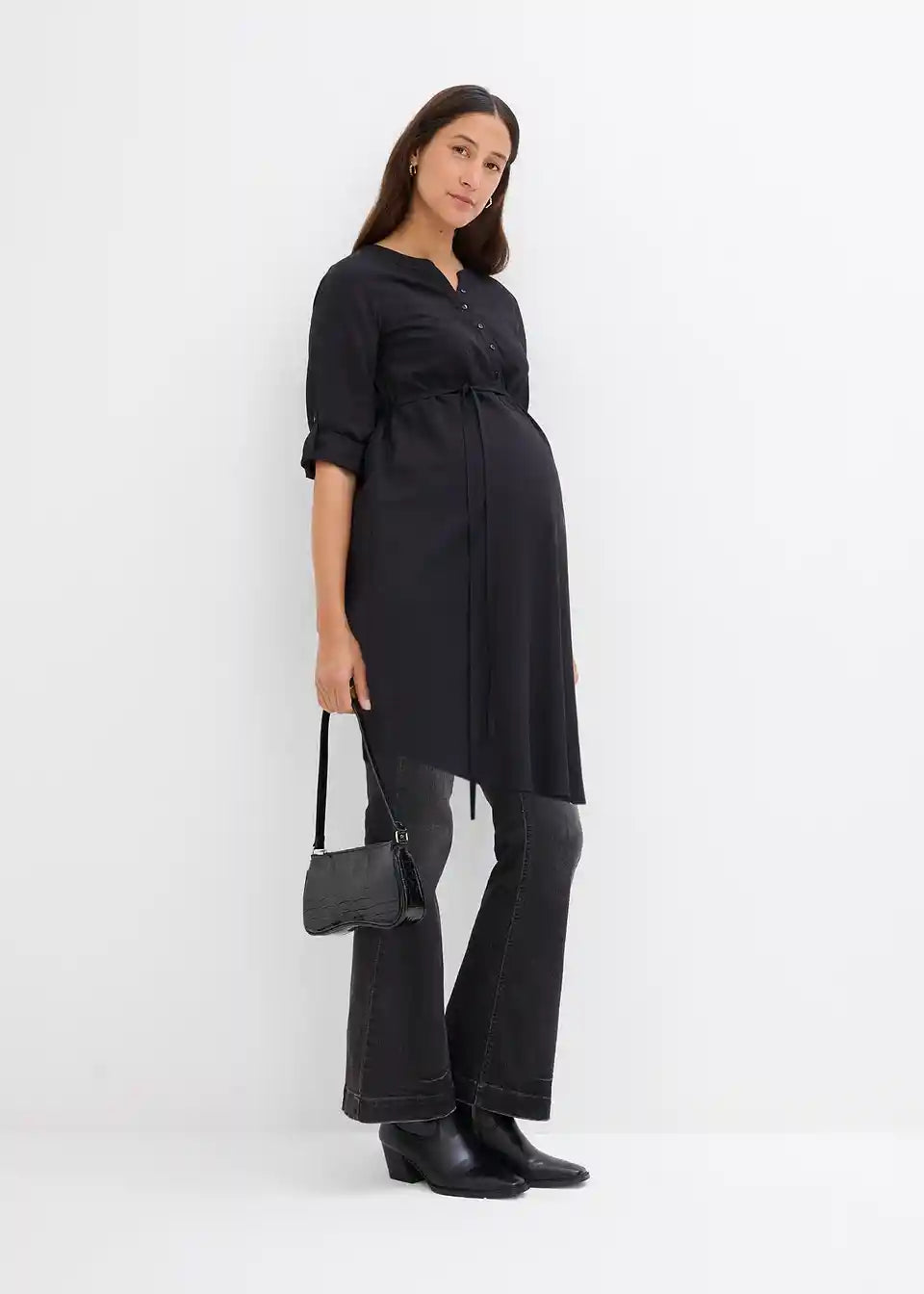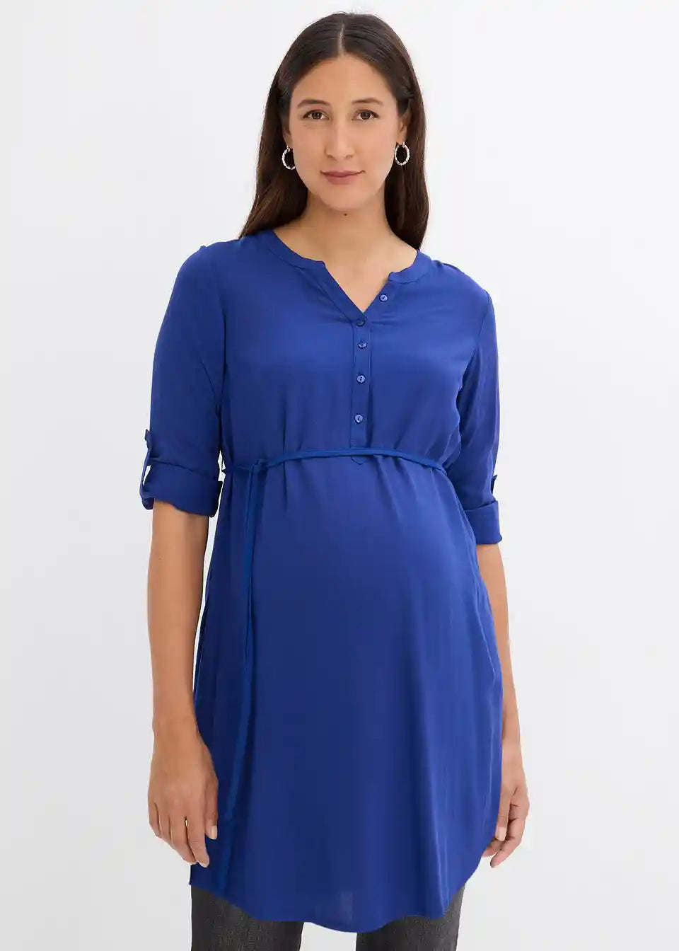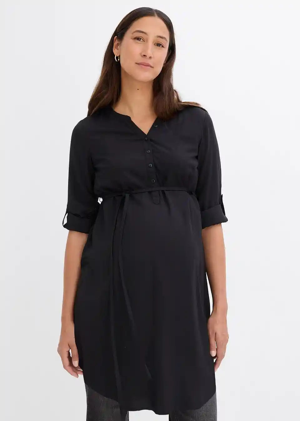 Šik dolga bluza iz tekoče viskoze, ki poudari postavo. Lahko se nosi kot obleka ali bluza. Odstranljivi pas poudari rastoči nosečniški trebušček. Dolžino rokavov lahko prilagodite z naramničkami in gumbi. Po nosečnosti omogoča enostavno dojenje z uporabo gumijaste vrste.