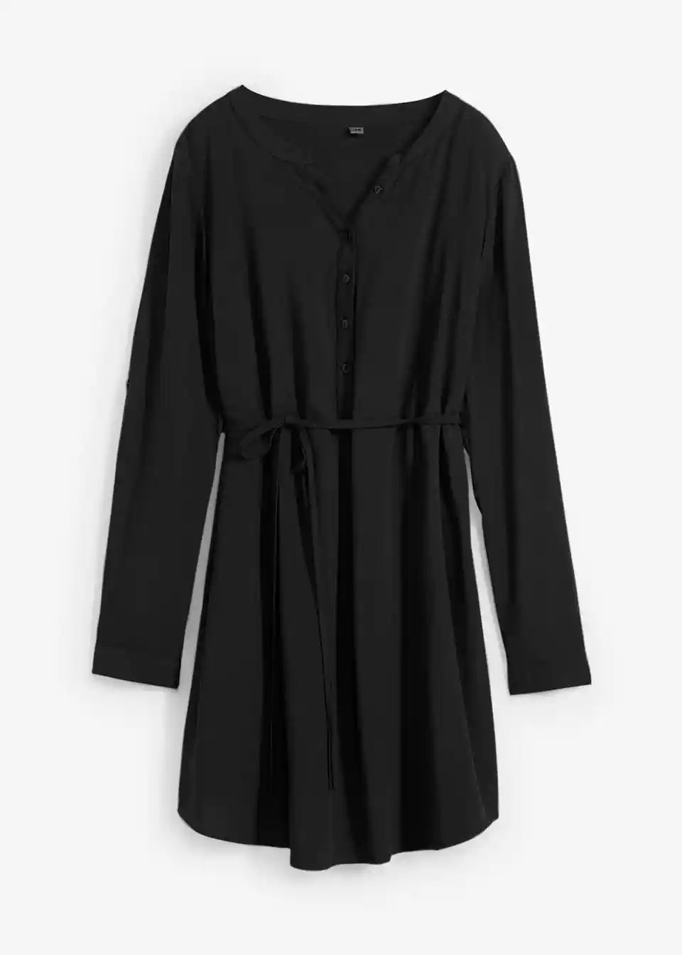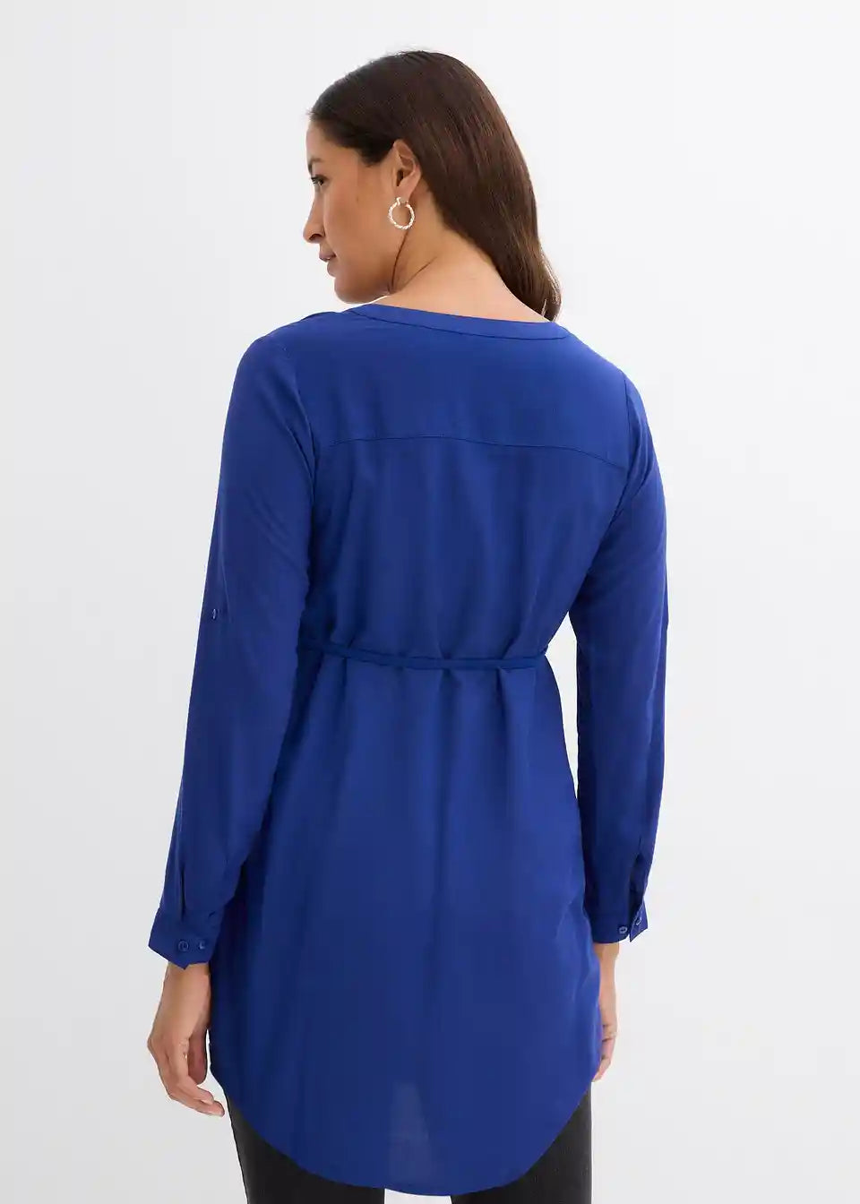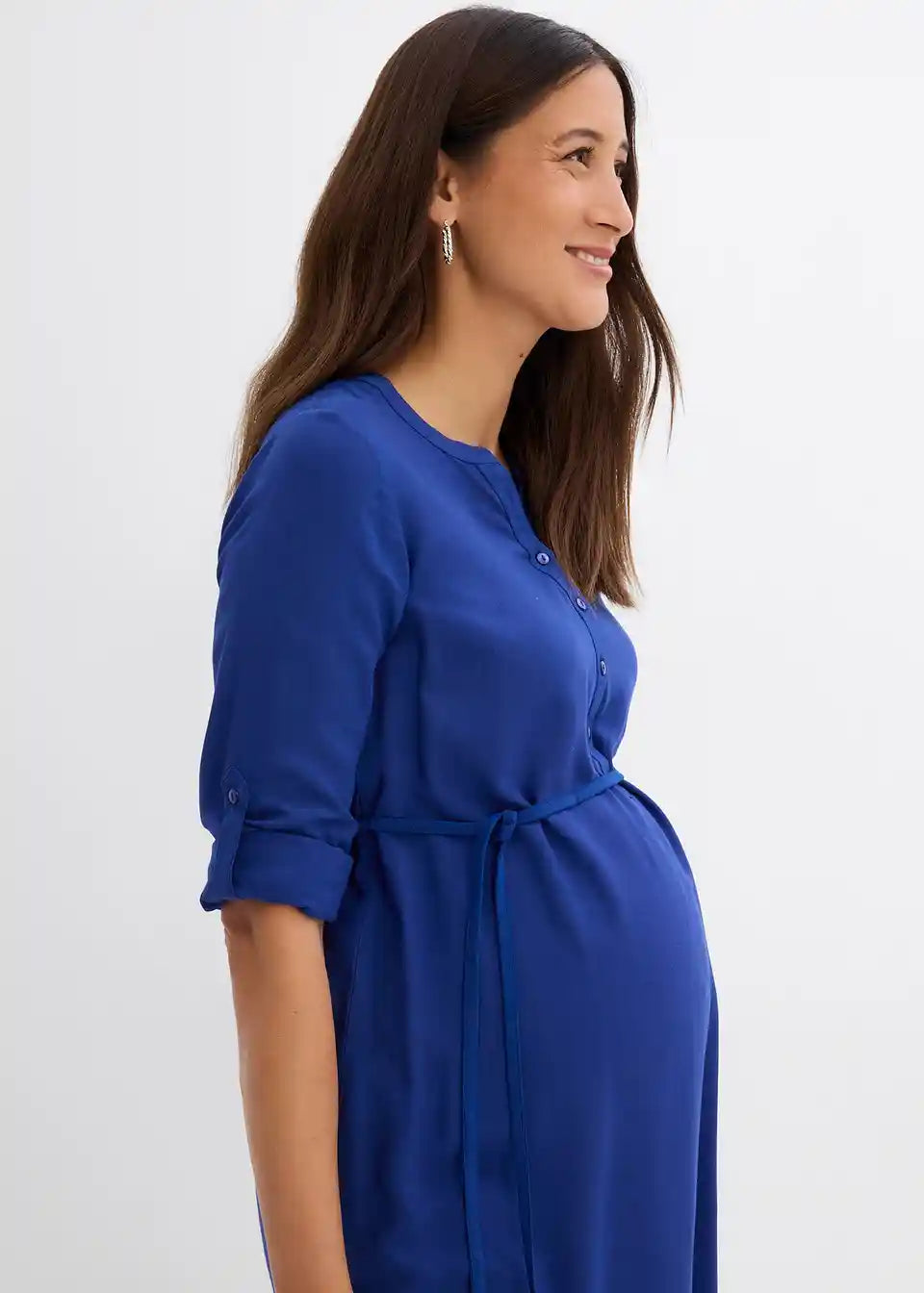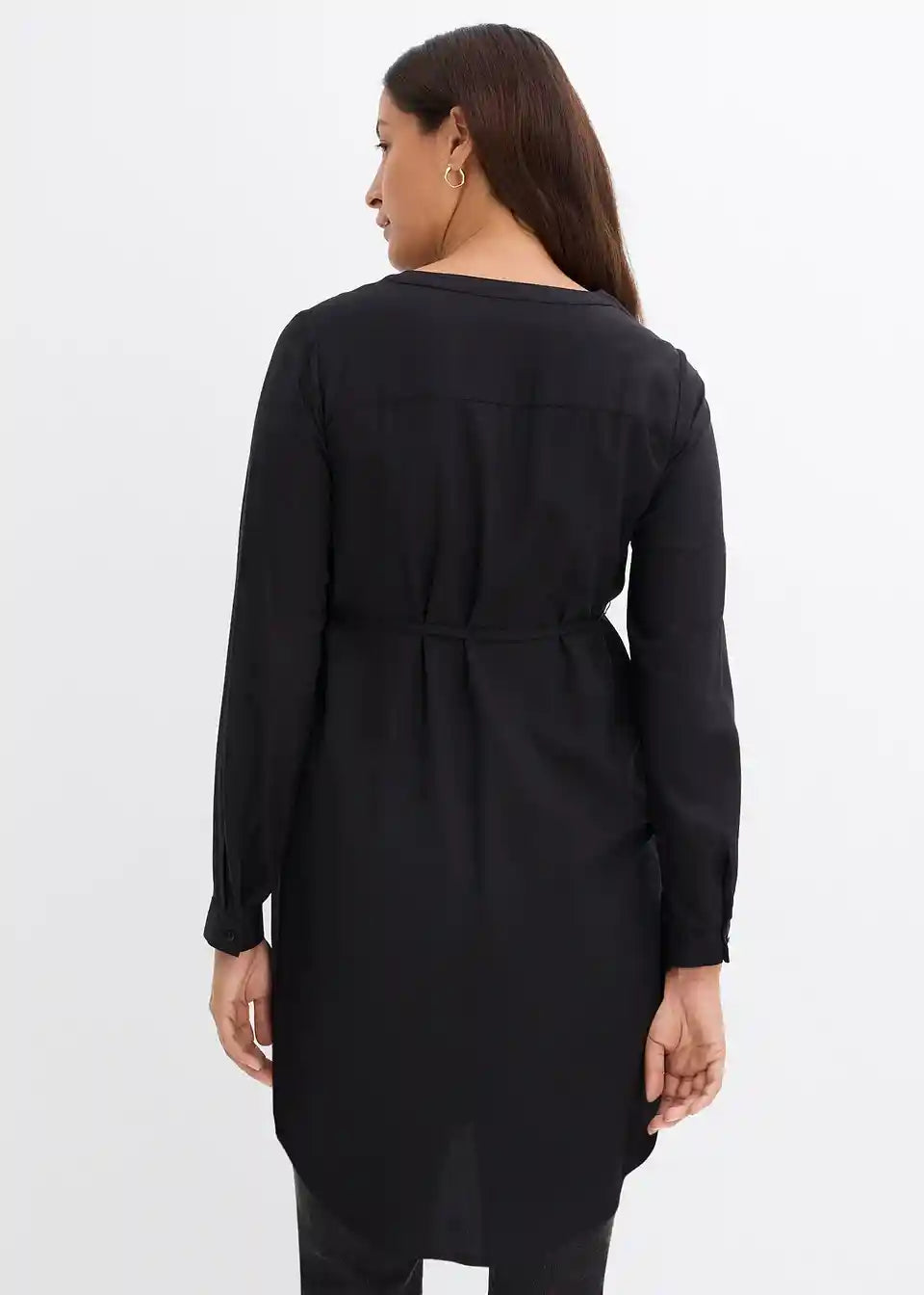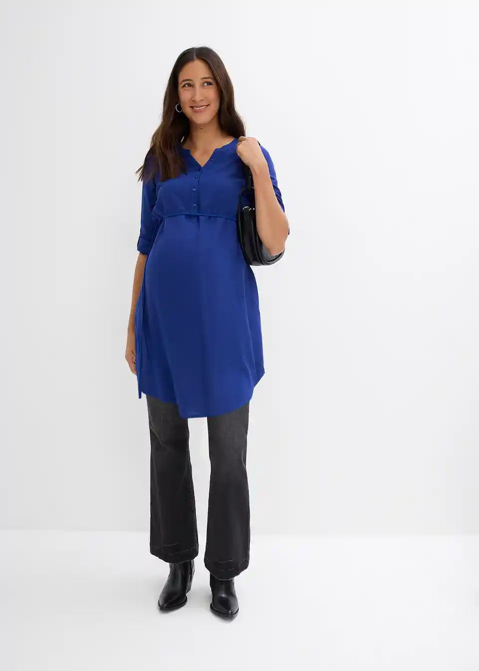 Šik dolga bluza iz tekoče viskoze, ki poudari postavo. Lahko se nosi kot obleka ali bluza. Odstranljivi pas poudari rastoči nosečniški trebušček. Dolžino rokavov lahko prilagodite z naramničkami in gumbi. Po nosečnosti omogoča enostavno dojenje z uporabo gumijaste vrste.