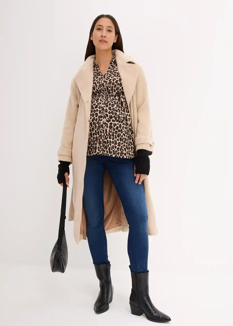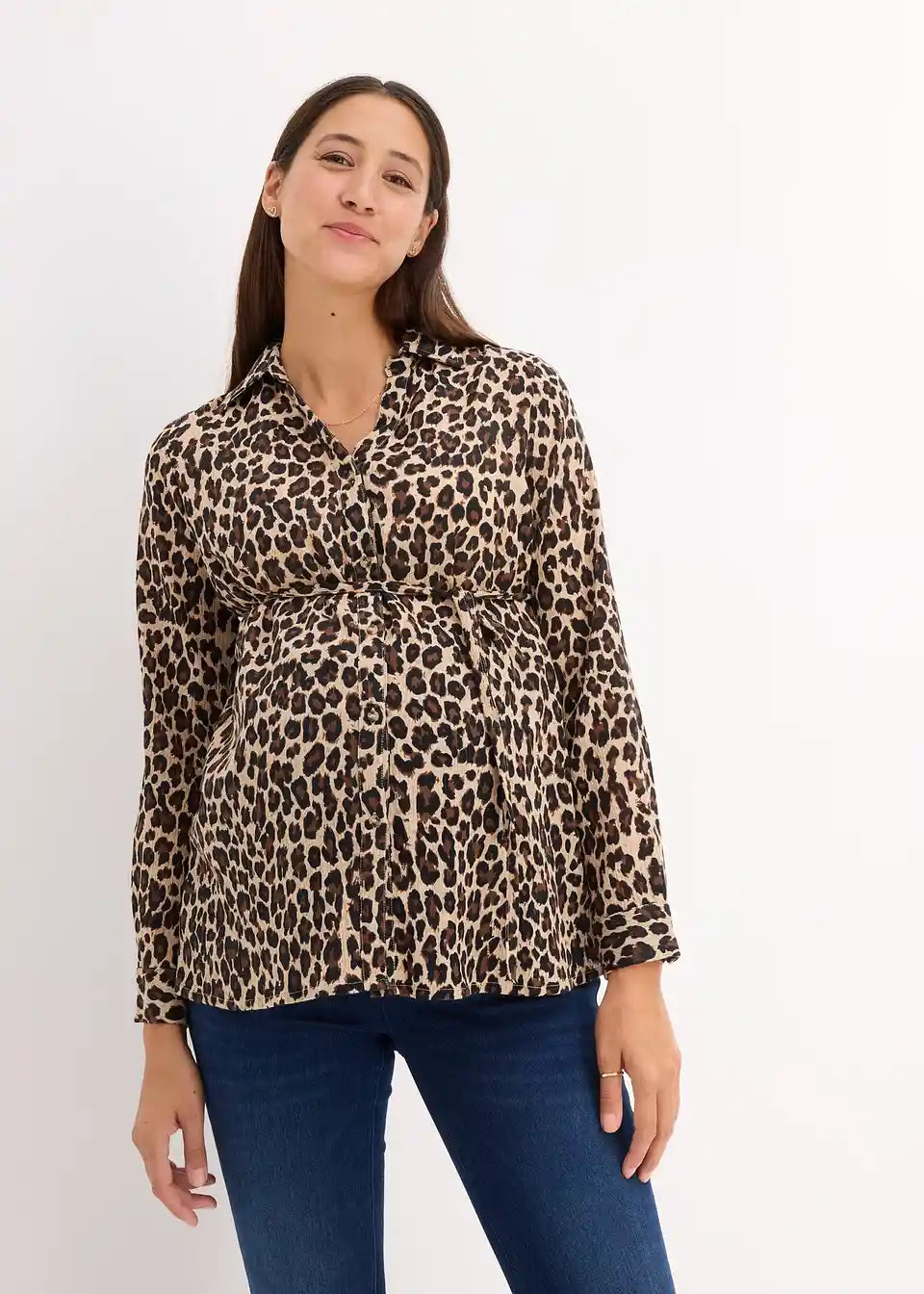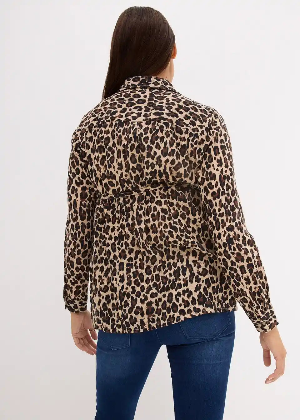 Nosečniška bluzna majica z leopardjim potiskom za nosečnost in po njej