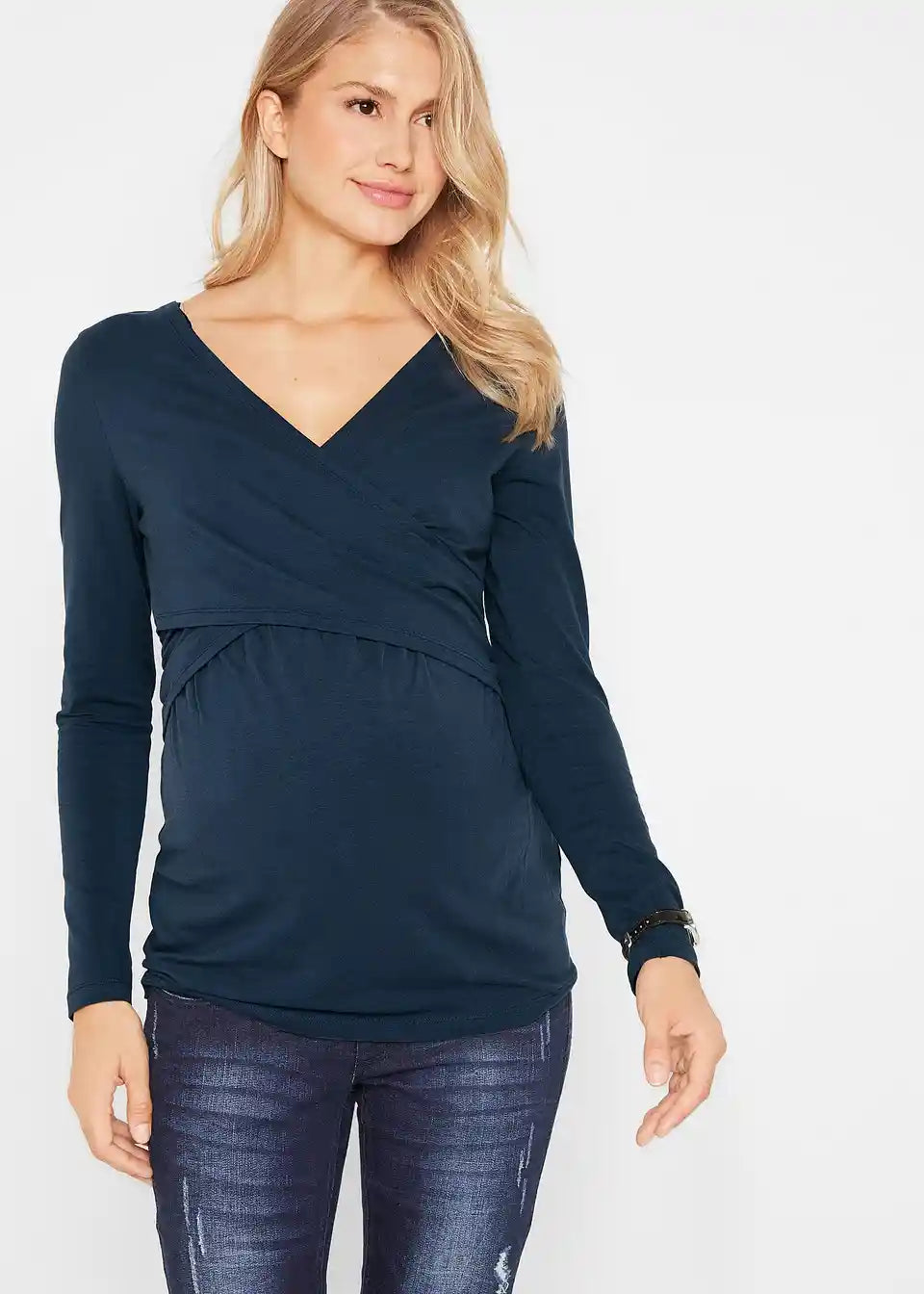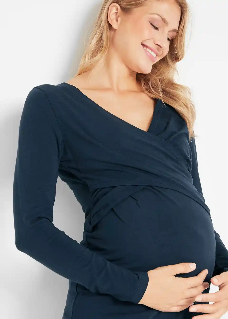 Jersey nosečniška majica iz organskega bombaža z doječo funkcijo. Z dolgimi rokavi in globokim V-izrezom. Prekrižan izrez omogoča enostavno dojenje.