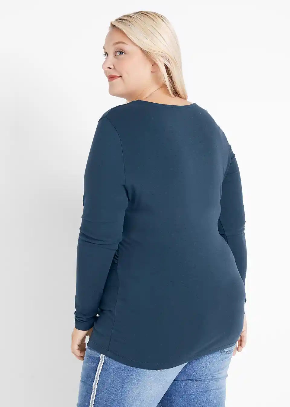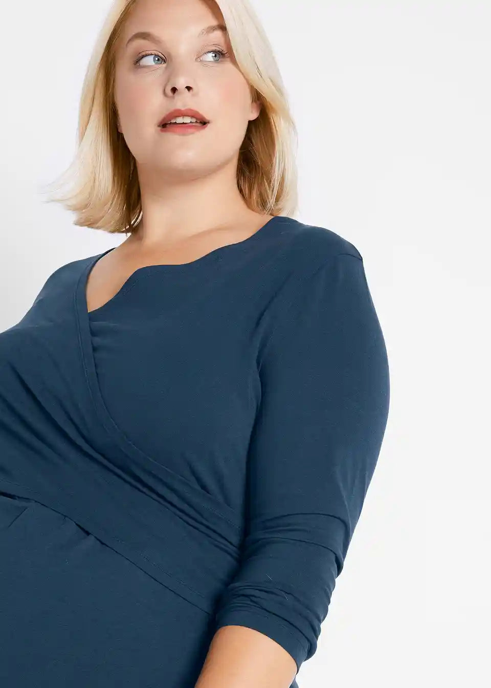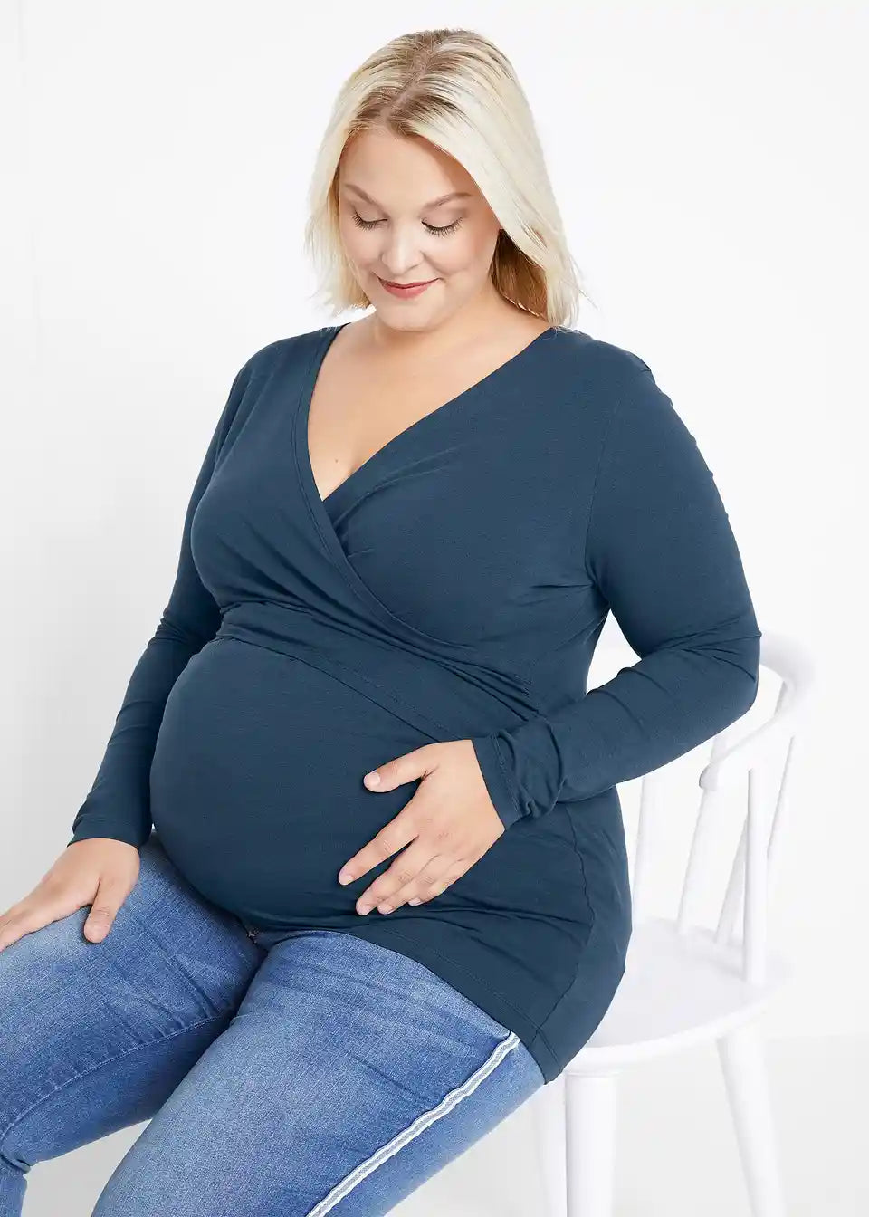 Jersey nosečniška majica iz organskega bombaža s funkcijo za dojenje. Z dolgimi rokavi in globokim V-izrezom. Prekrivajoči se izrez omogoča dojenje.