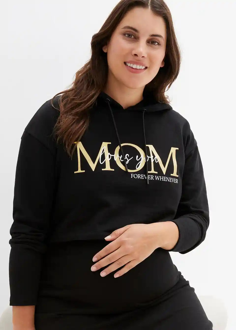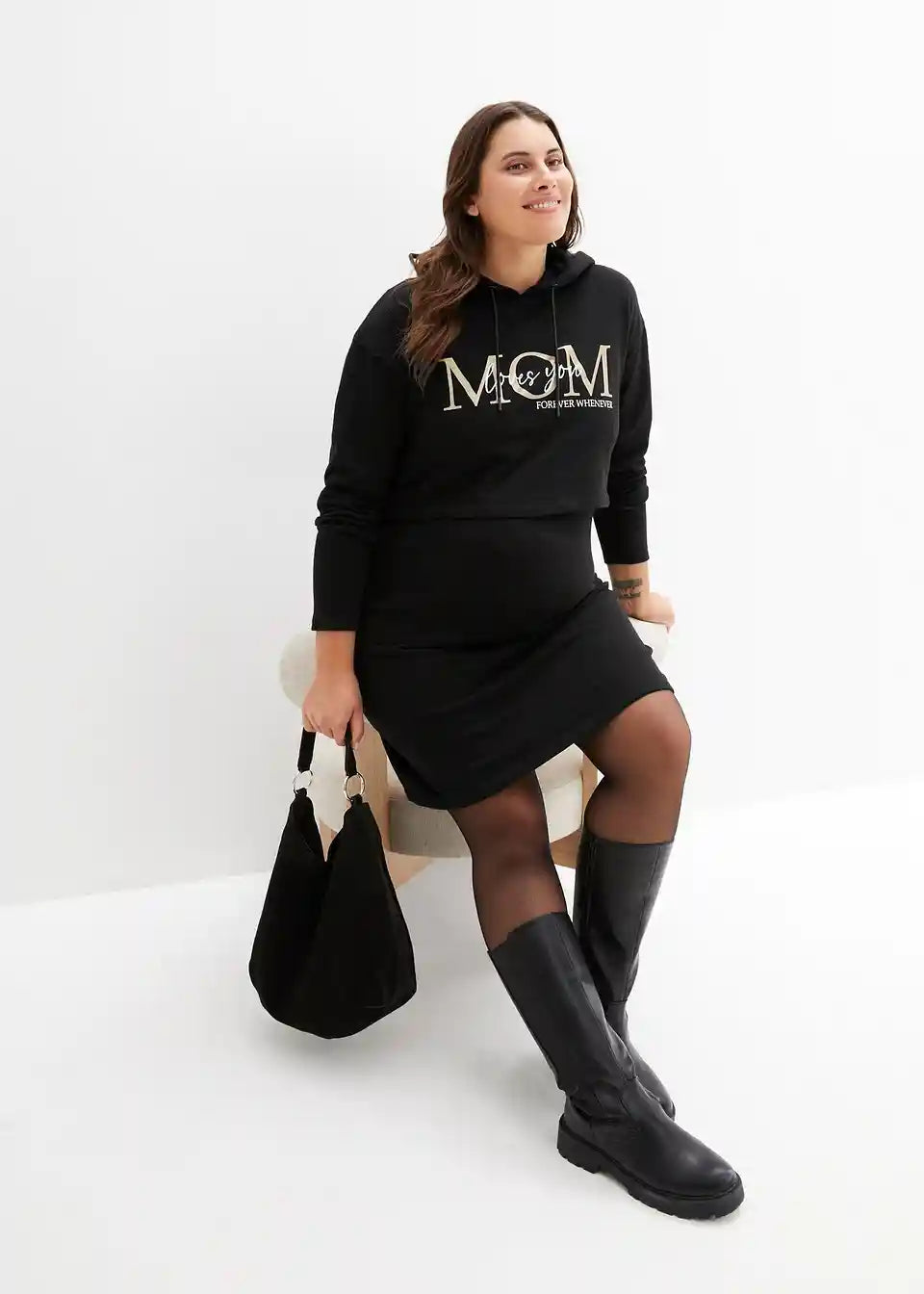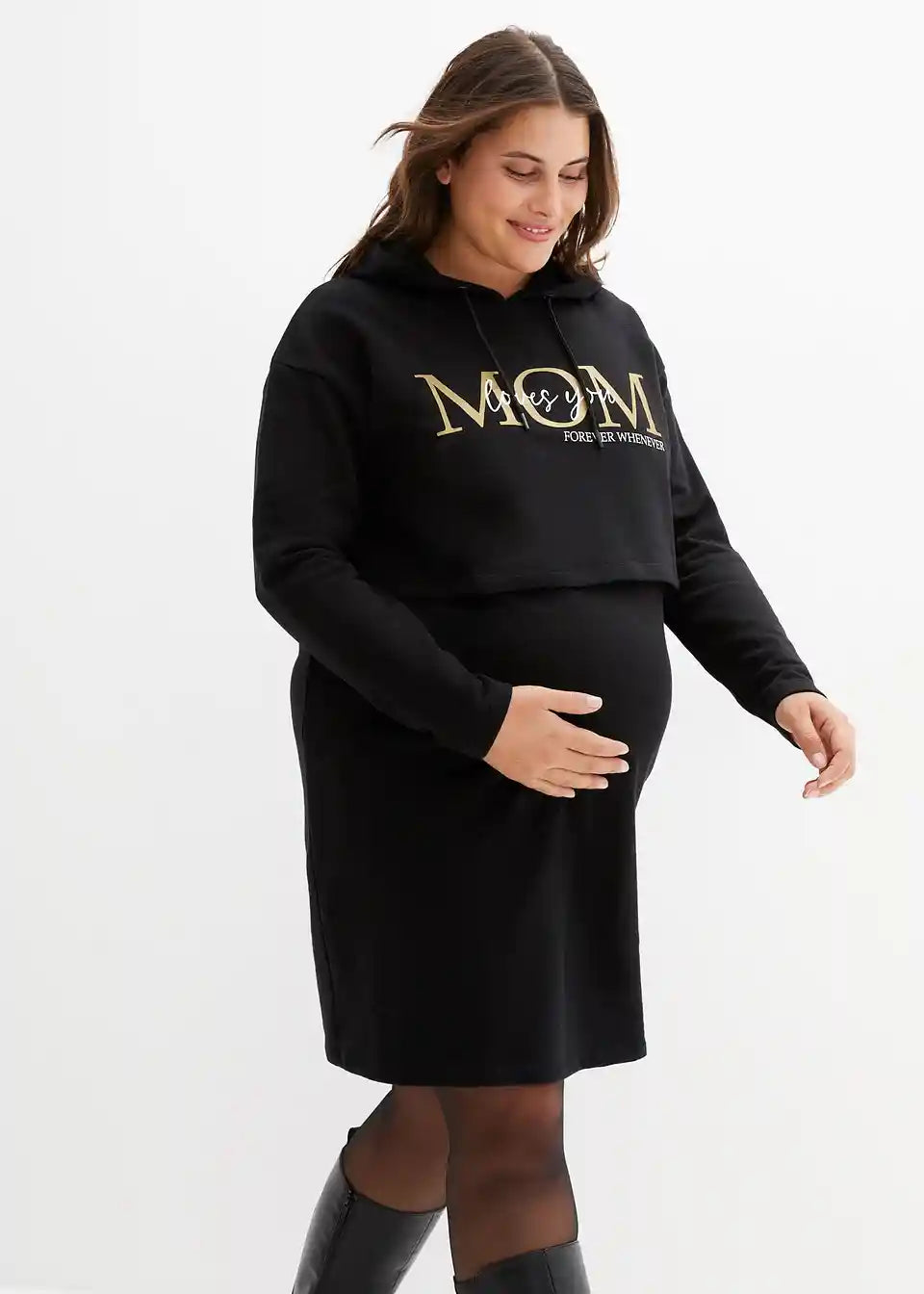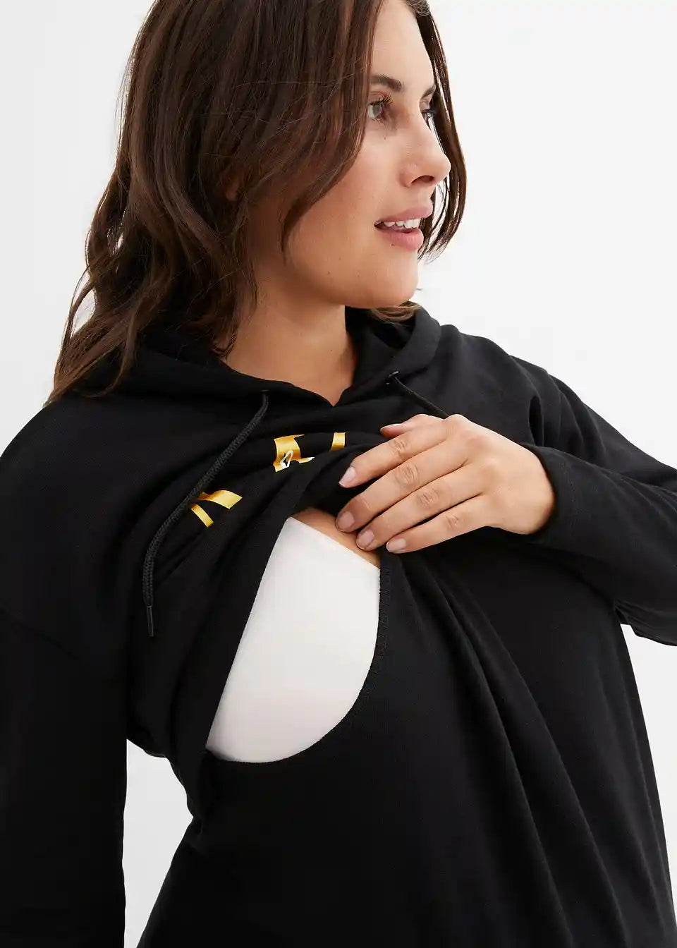 Obleka iz sweat materiala z mehko brušeno notranjo stranjo. S kapuco z vrvico in dolgimi rokavi. Pod potiskanim zgornjim delom je dodatna plast s špranjo za dojenje. Dizajn z dvojno plastjo pomaga preprečevati izgubo toplote in omogoča udobno dojenje za mamo in otroka.