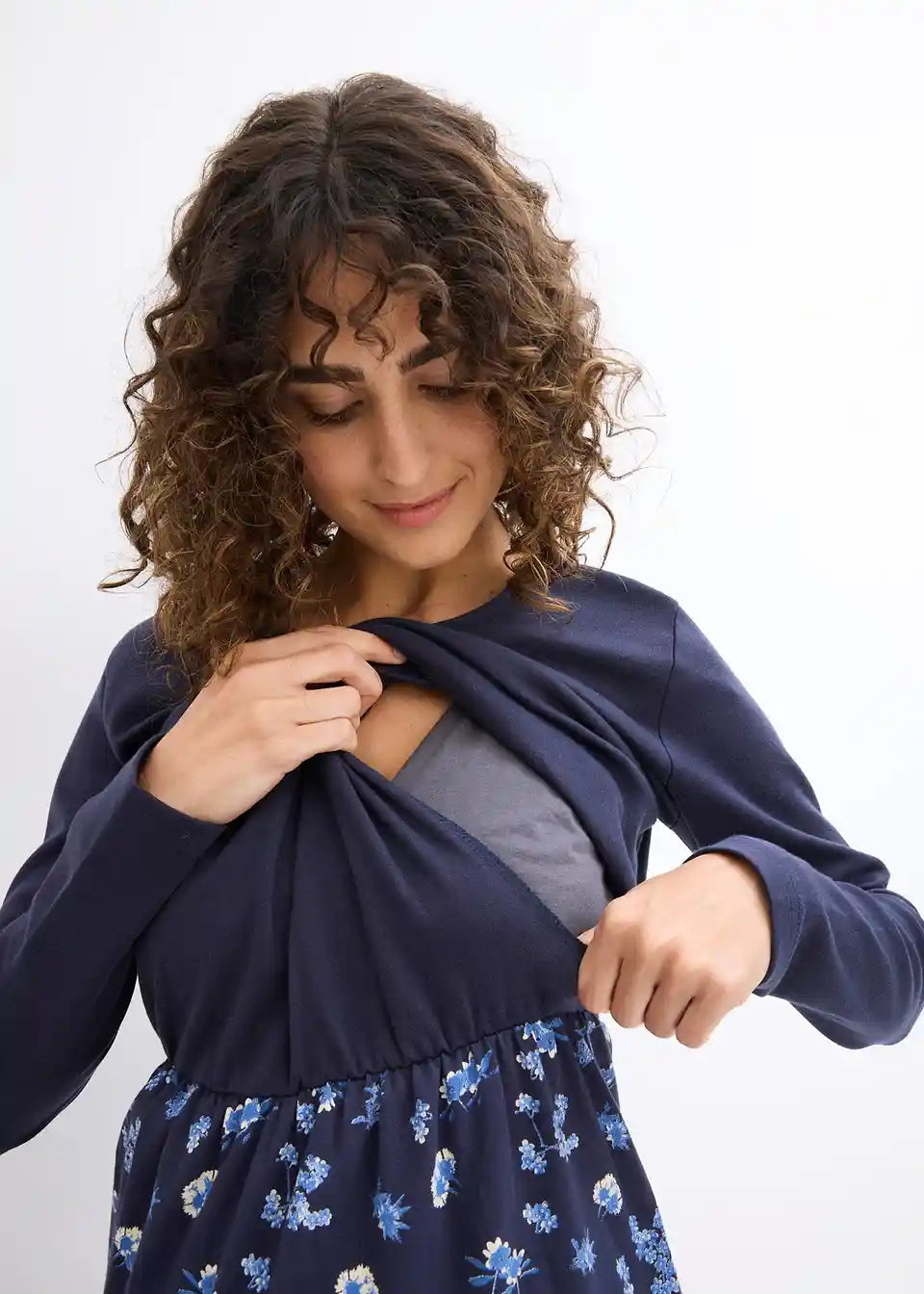 Iz mehkega jerseya iz ekološkega bombaža s praktično funkcijo dojenja. Dizajn z dvojnimi plastmi pomaga preprečiti izgubo toplote in ščiti otroka, kar omogoča mirno vzdušje med dojenjem. To obleko lahko nosite tako med nosečnostjo kot tudi v obdobju dojenja.