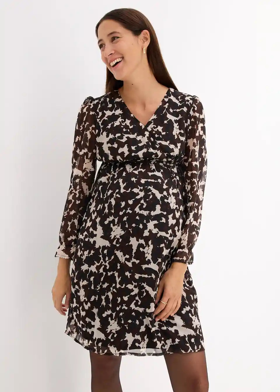 potiskana nosečniška obleka z diskretno funkcijo za dojenje