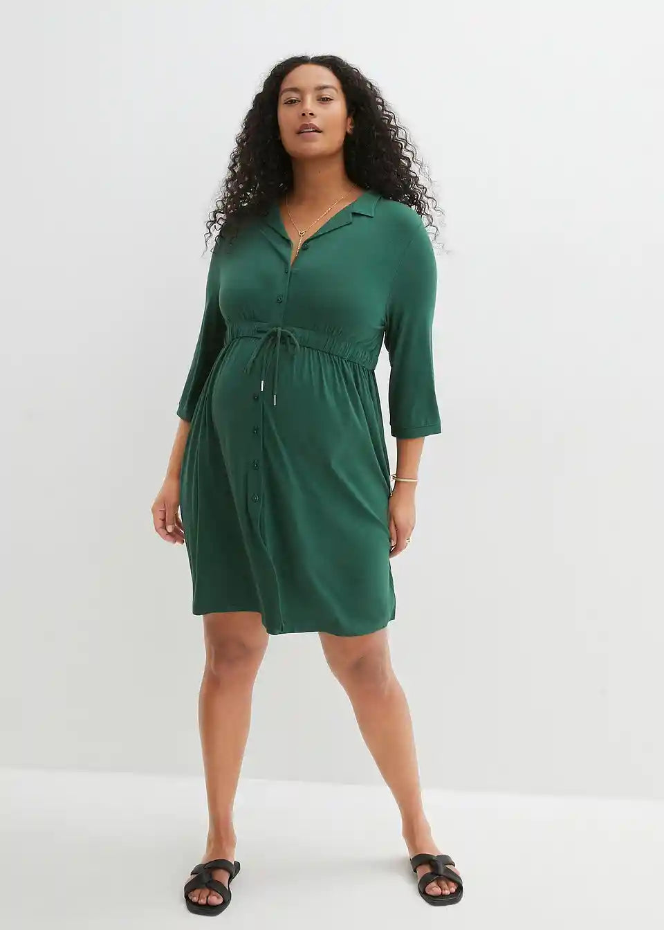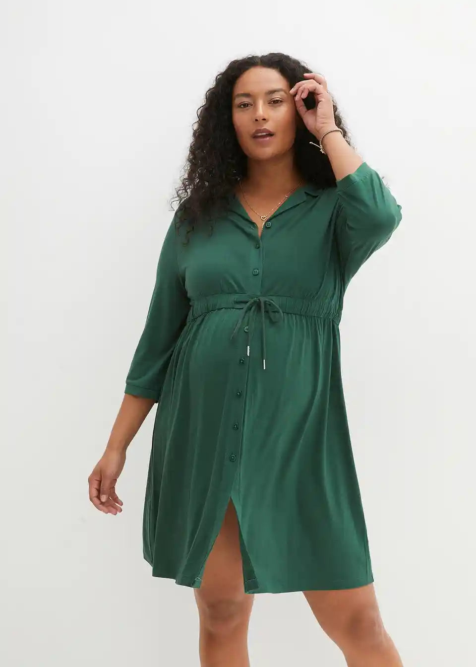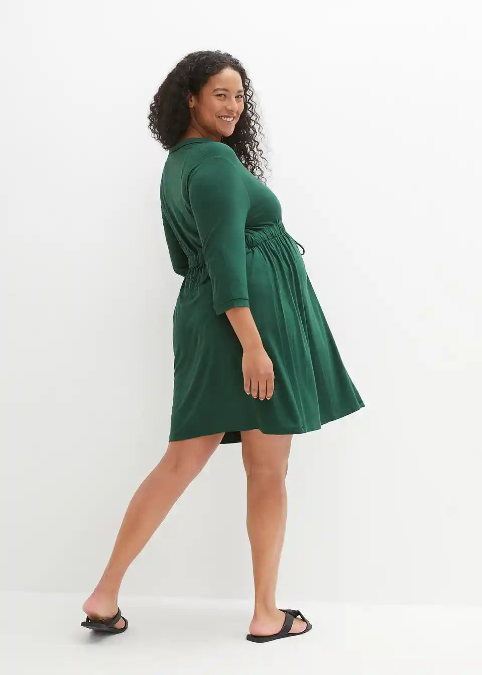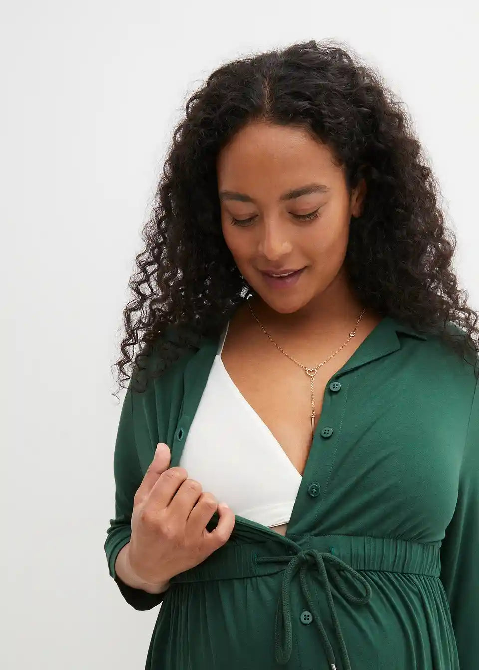 Bluzasta obleka iz mehkega viskoza-jerseya iz trajnostne pridelave. S stoječim ovratnikom in 3/4 rokavi. Celoten gumbnica omogoča enostavno dojenje in olajša oblačenje ter slačenje. Z elastičnim trakom za zavezovanje pod prsmi.
