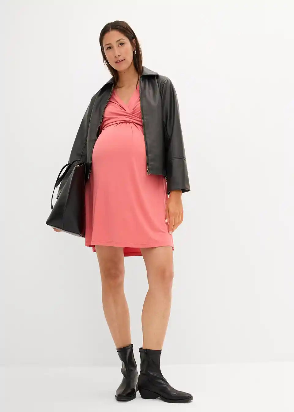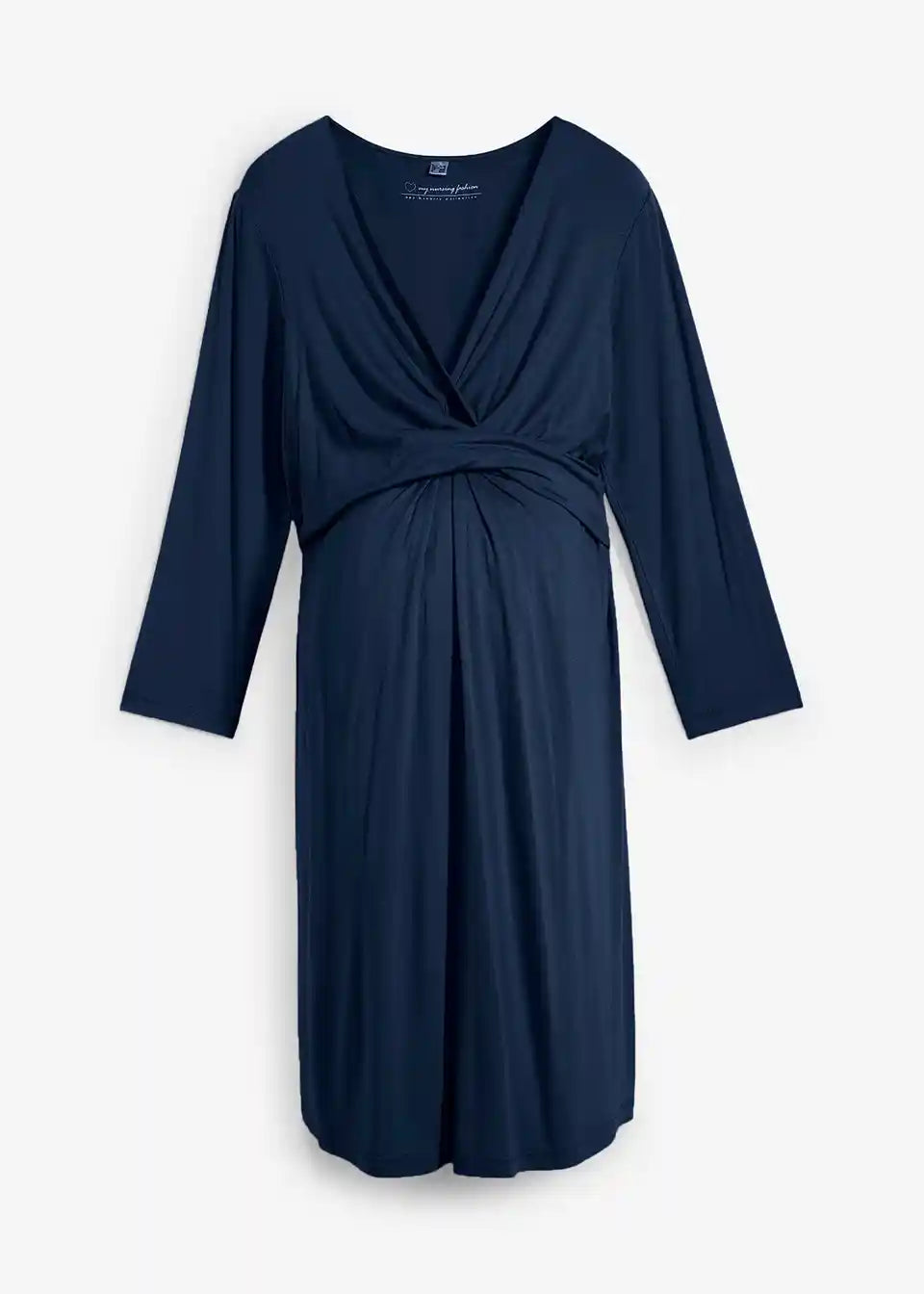 Obleka s 3/4 rokavi iz mehkega viskozne tkanine iz trajnostnega izvora. Globok prekrivajoč se V-izrez s poudarkom na vozlu omogoča enostavno dojenje. Z dekorativnim šivom in naborki na hrbtni strani.