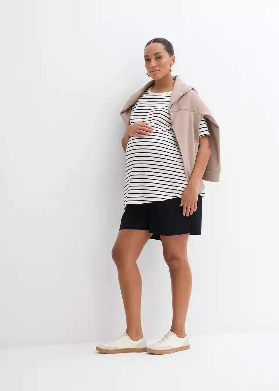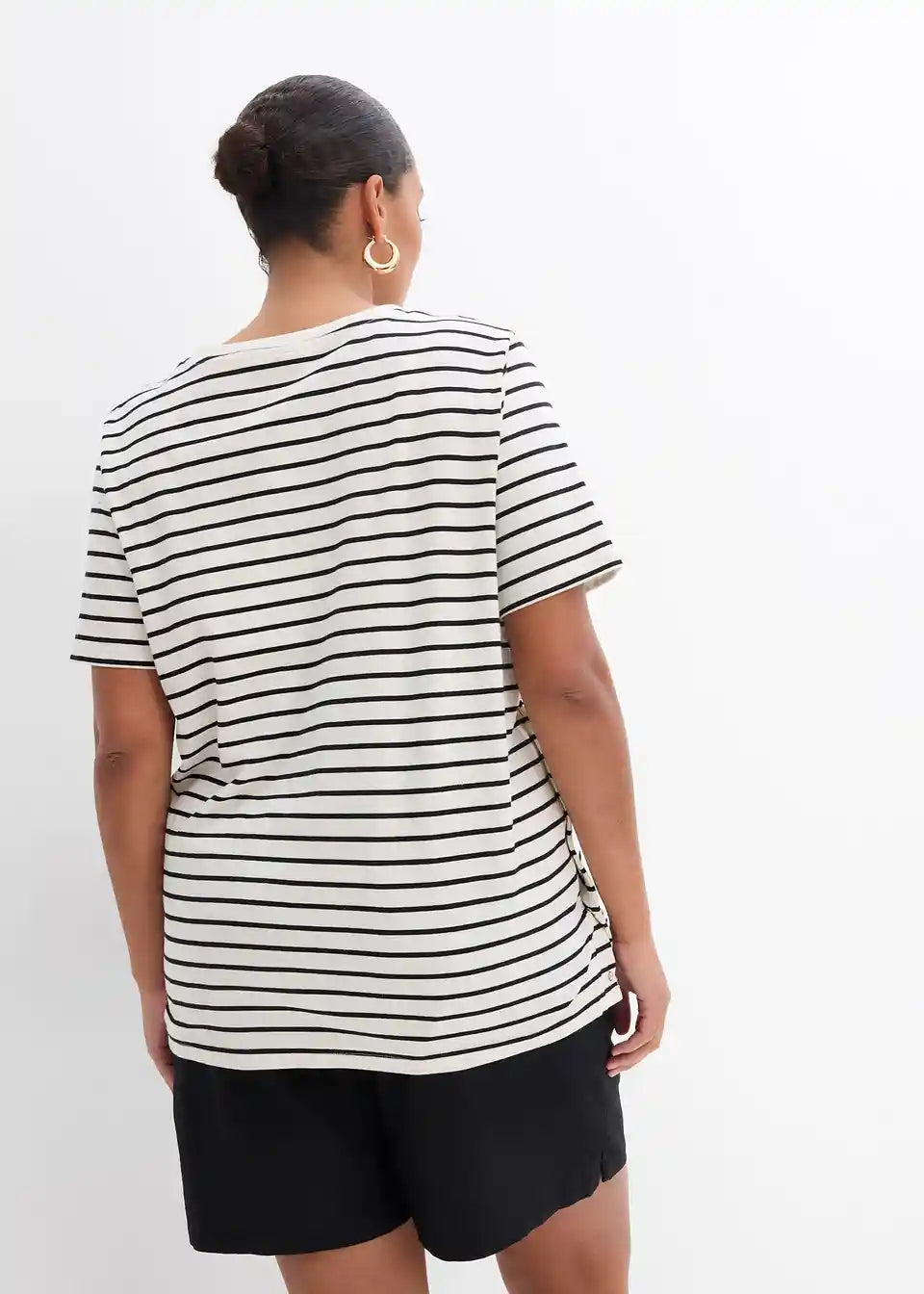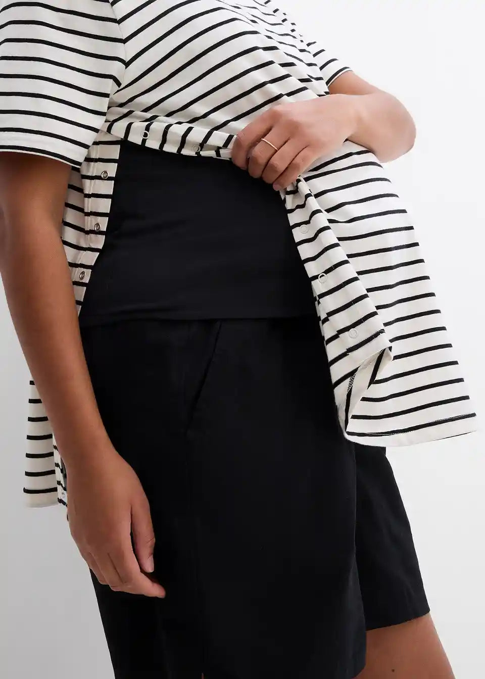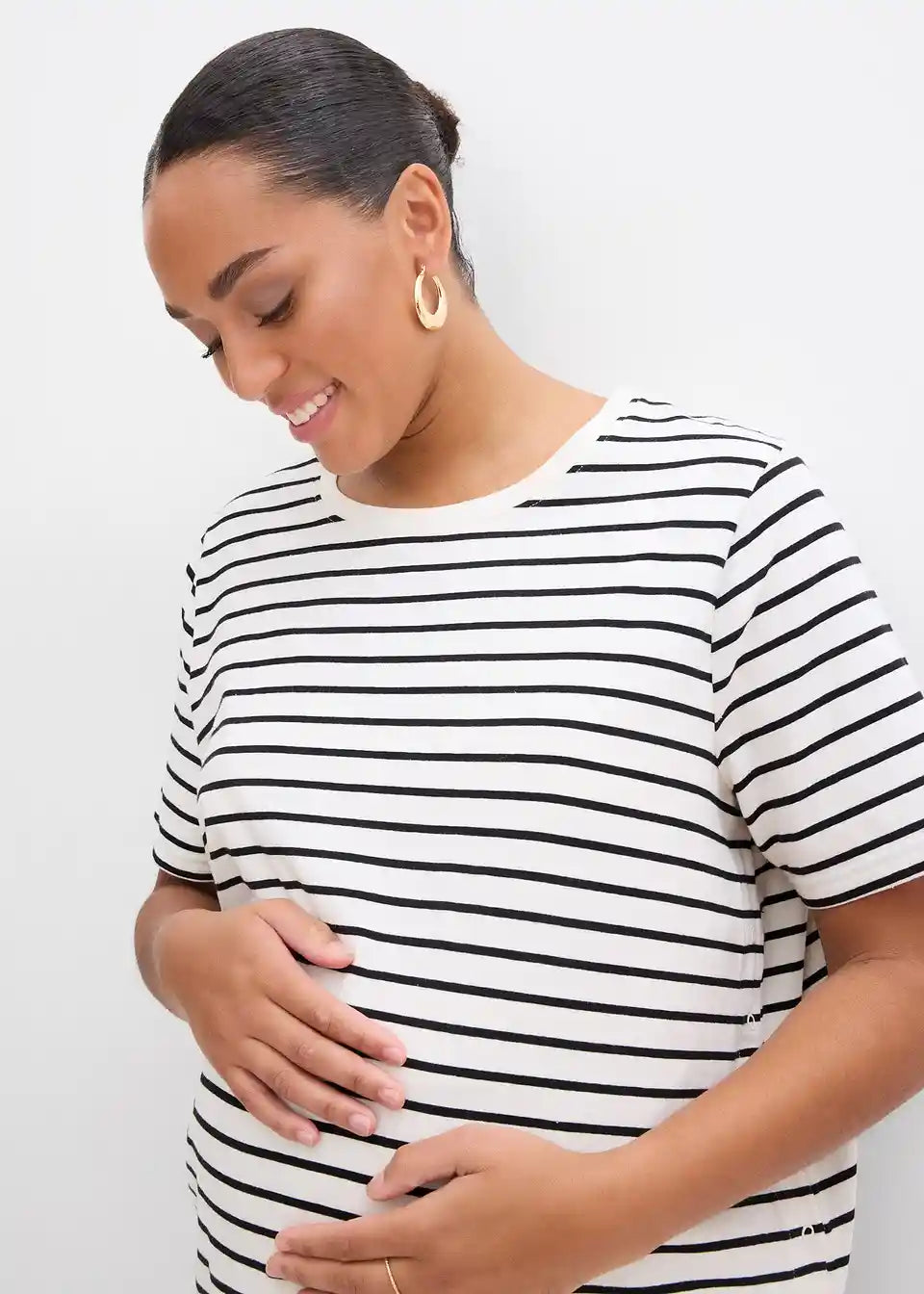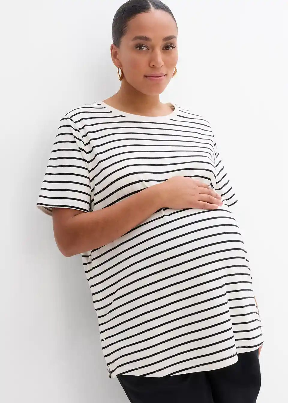 Mehka nosečniška majica iz jerseya iz organskega bombaža z dodatkom elastana za udobno nošenje. Z okroglim izrezom in kratkimi rokavi prijetne dolžine. Na straneh ima dva razporka, ki ju je mogoče zapreti z zakritimi pritiskači. Ti zagotavljajo dodaten prostor za rastoči nosečniški trebuh in hkrati omogočajo priročno funkcijo dojenja.