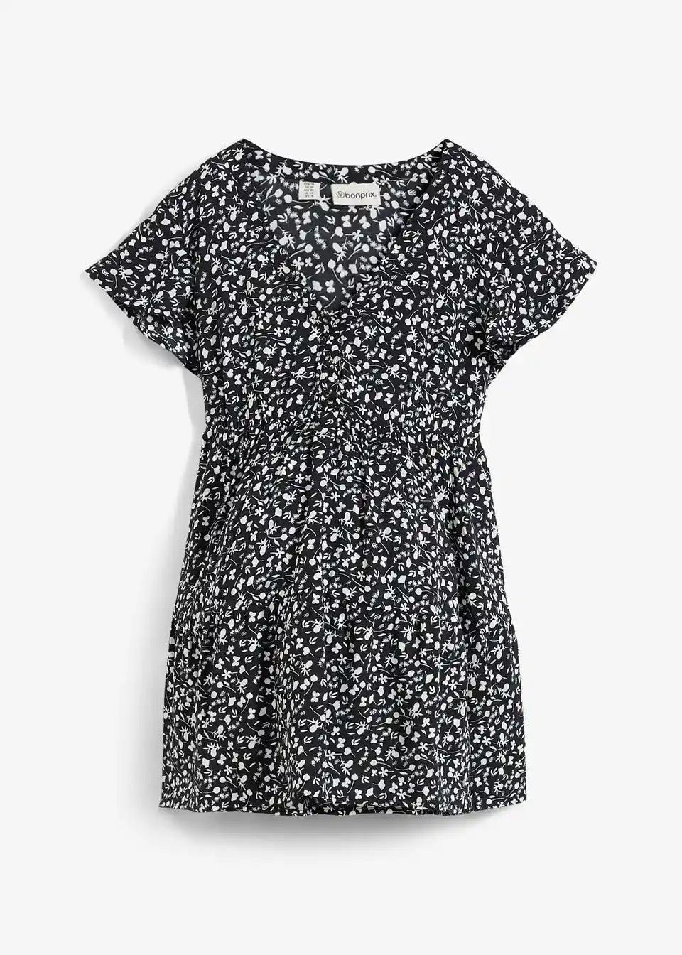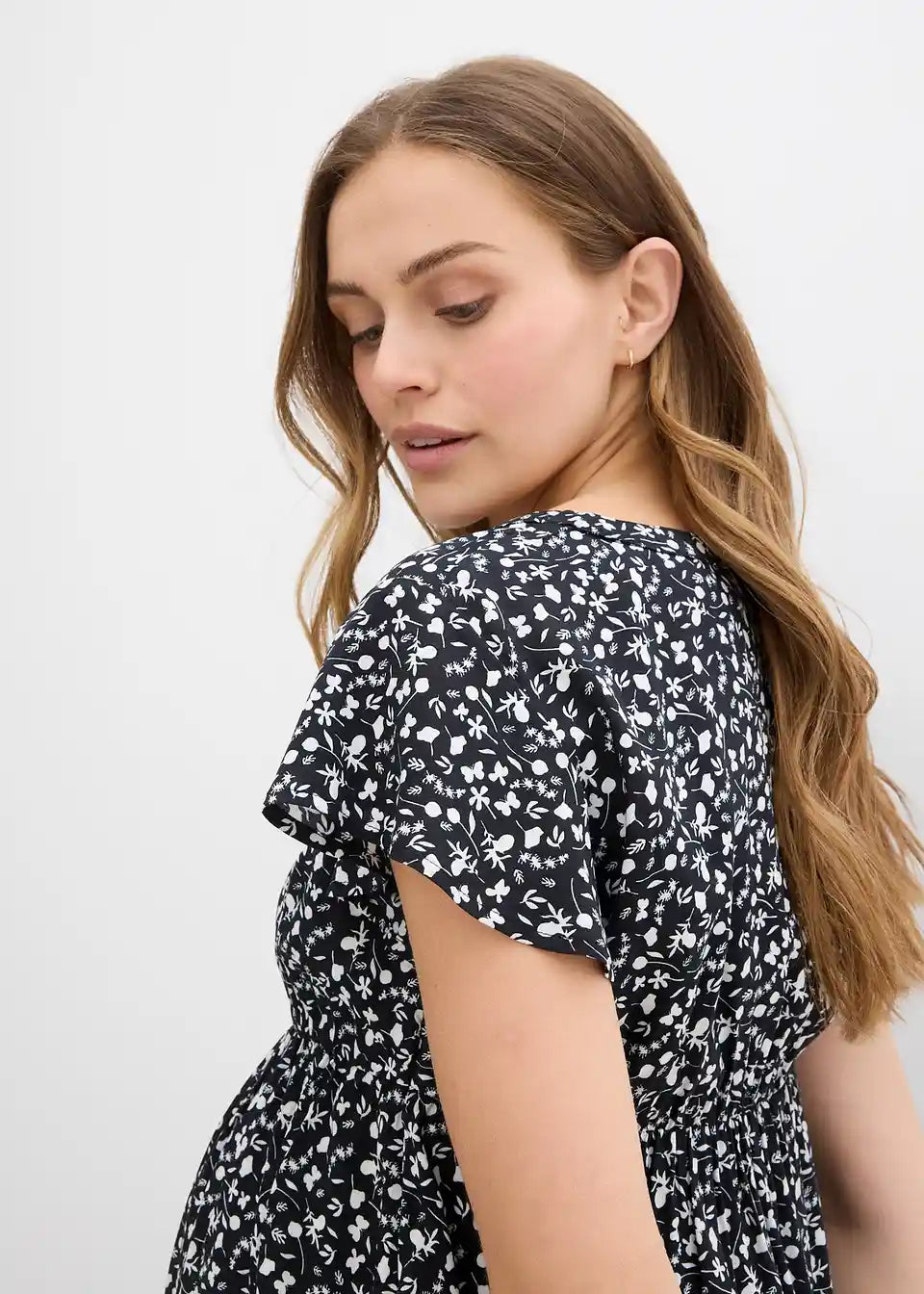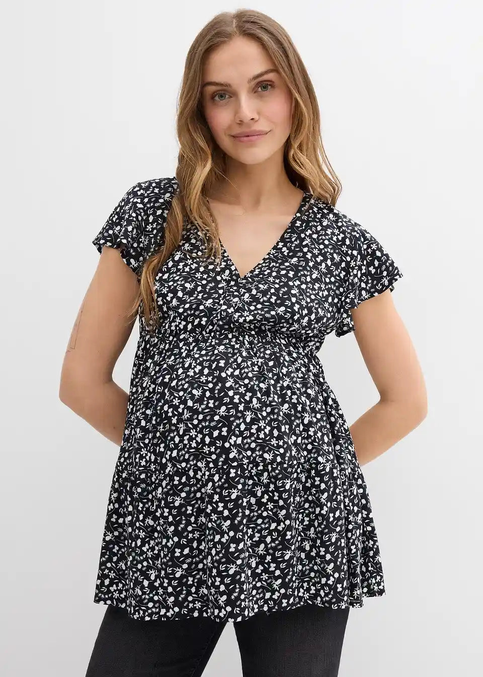 Nosečniška bluza iz tkane viskoze z V-izrezom in ženstvenimi krilnimi rokavi. Šiv pod prsmi z elastiko zagotavlja udobno prileganje, A-kroj pa poskrbi, da bluza lepo pade in laskavo poudari postavo. Po nosečnosti omogoča enostavno dojenje zahvaljujoč gumbnici.