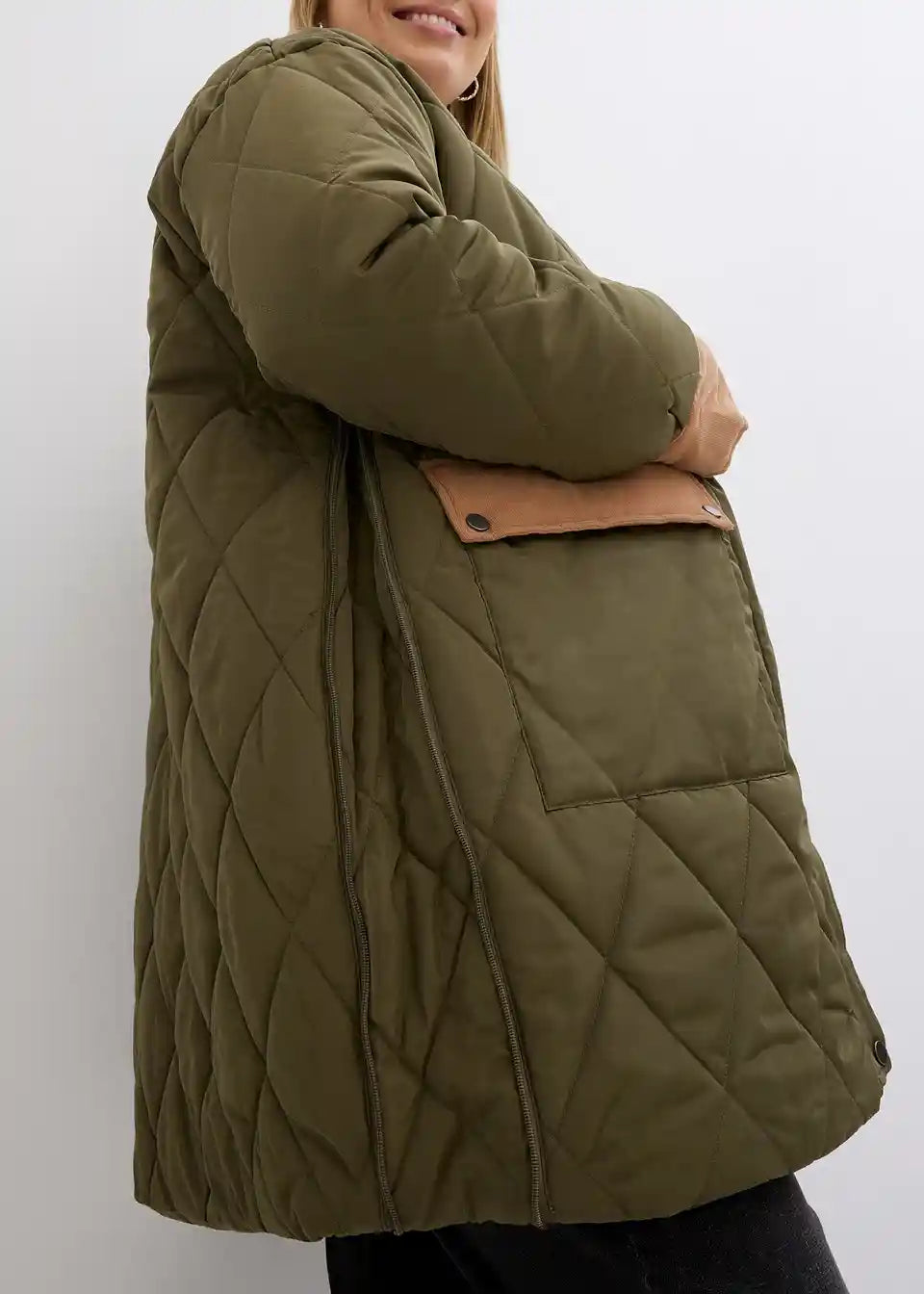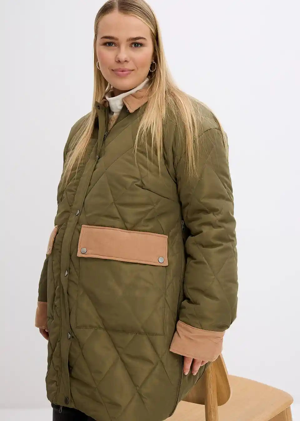 Lahka nosečniška jakna s stranskimi zadrgami za prilagoditev širine, ki omogočajo nošenje med nosečnostjo in po njej, ter s sodobnimi aplikacijami iz žameta. Z zadrgo spredaj, trakovi za zaščito pred vetrom s pritiskači in nastavljivimi zaključki rokavov. Sprednji žepi z zavihkom in pritiskači. Lahko podložena.