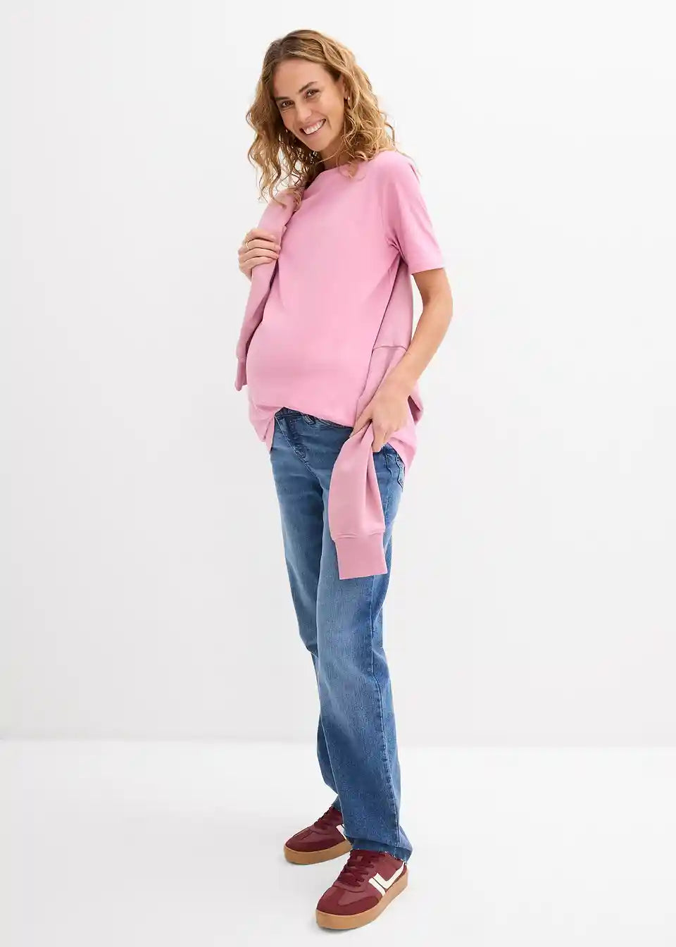 Elastične 5-žepne jeans hlače iz mešanice organskega bombaža z nekaj elastana za visoko udobje nošenja med nosečnostjo in tudi po njej. Nizko nameščen pas ima skrit, nastavljiv elastični trak, tako da se prileganje lahko individualno prilagodi. Z ohlapnim krojem in ravnim potekom hlačnic. Jeans hlače imajo odprte robove na spodnjem robu, na notranji strani hlačnice pa so označene linije reza, tako da jih je mogoče individualno prirezati na želeno dolžino. Majhni zatiči preprečujejo cefranje na izbranih linijah reza.