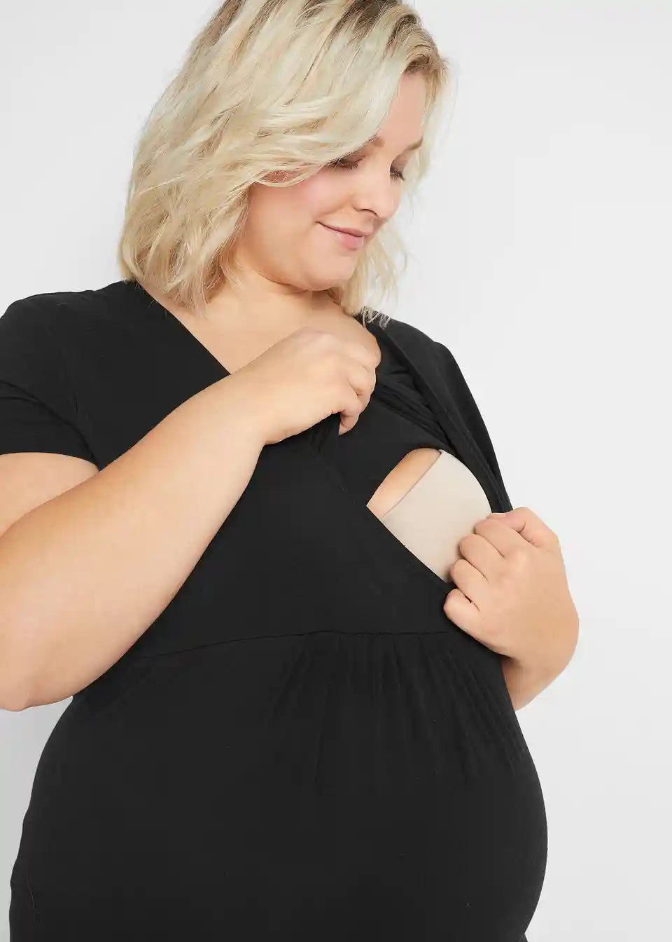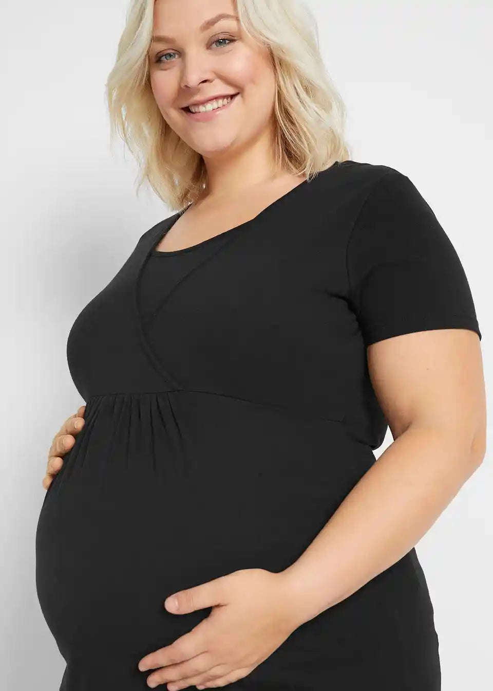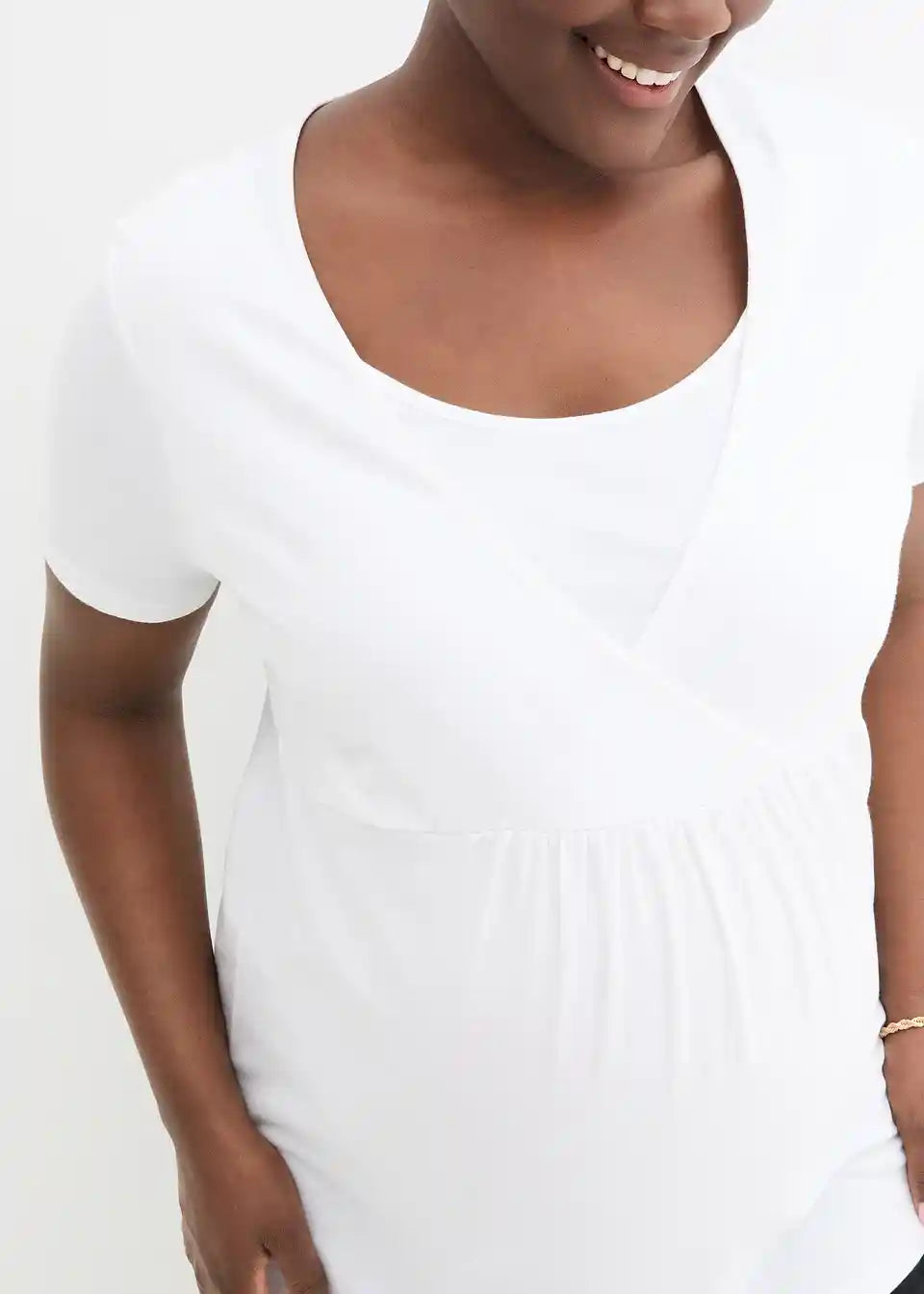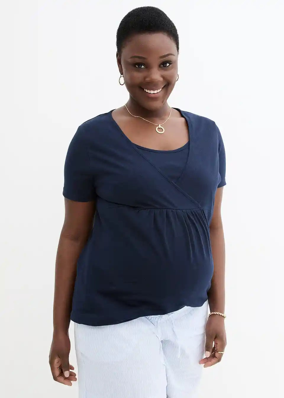 Mehke nosečniške majice iz jerseya v zavitem kroju z diskretno funkcijo za dojenje. Praktičen notranji top pomaga preprečevati izgubo toplote in olajša prijetno dojenje za mamo in otroka.