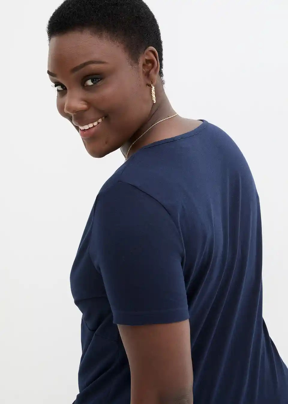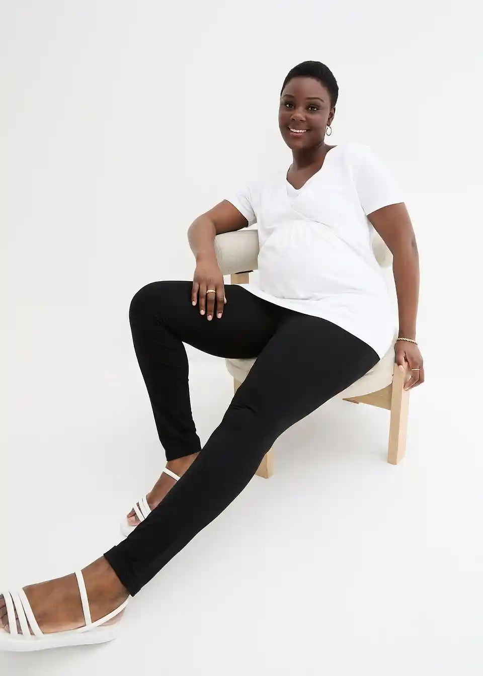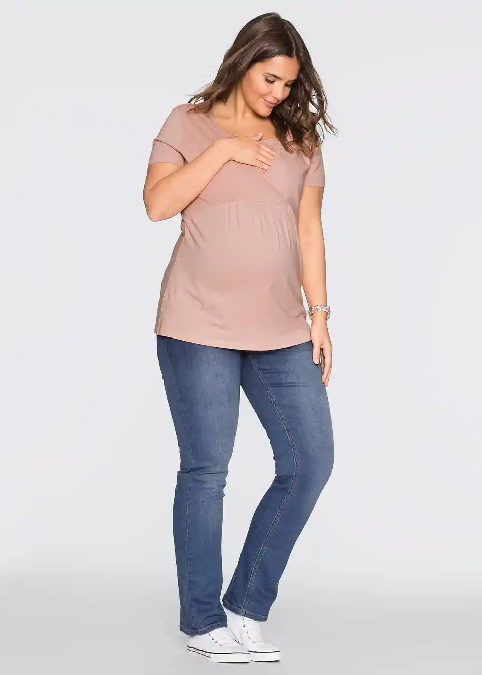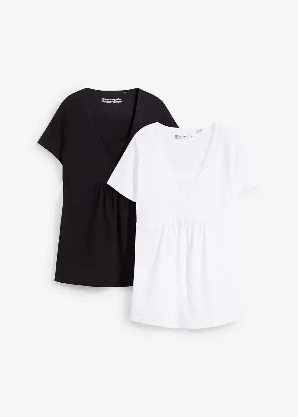 Mehke nosečniške majice iz jerseya v zavitem kroju z diskretno funkcijo za dojenje. Praktičen notranji top pomaga preprečevati izgubo toplote in olajša prijetno dojenje za mamo in otroka.
