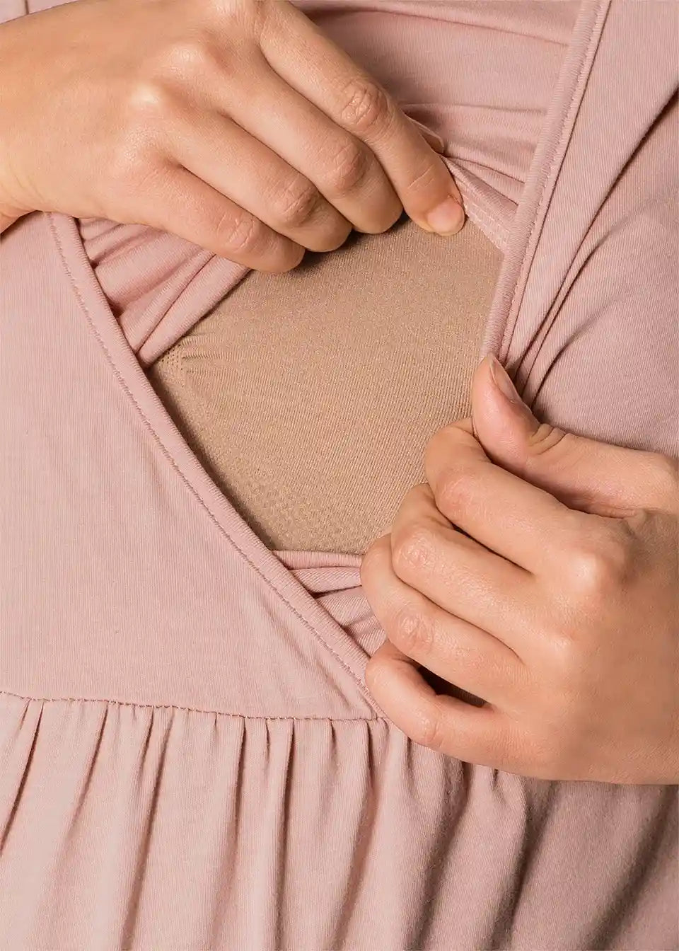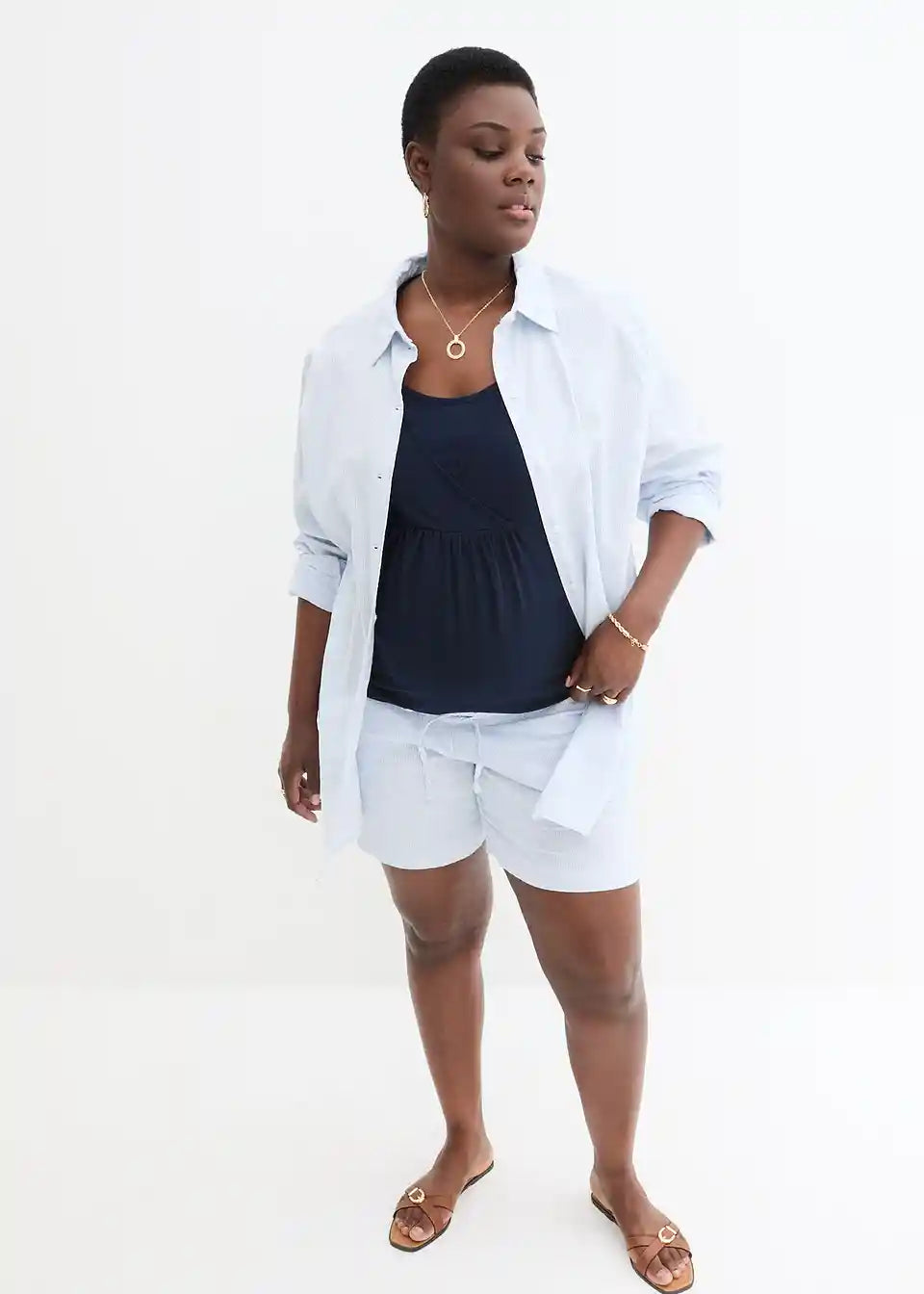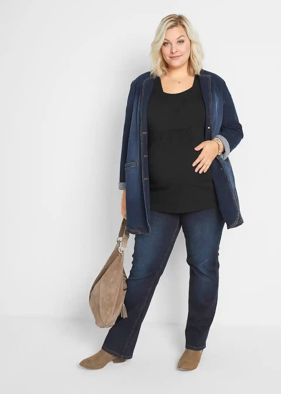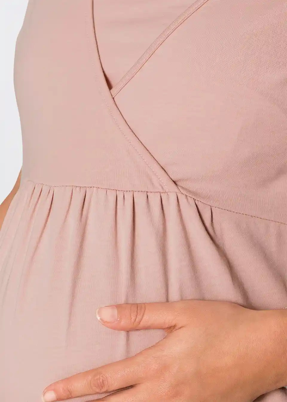 Mehke nosečniške majice iz jerseya v zavitem kroju z diskretno funkcijo za dojenje. Praktičen notranji top pomaga preprečevati izgubo toplote in olajša prijetno dojenje za mamo in otroka.