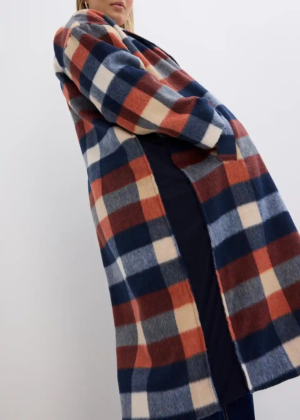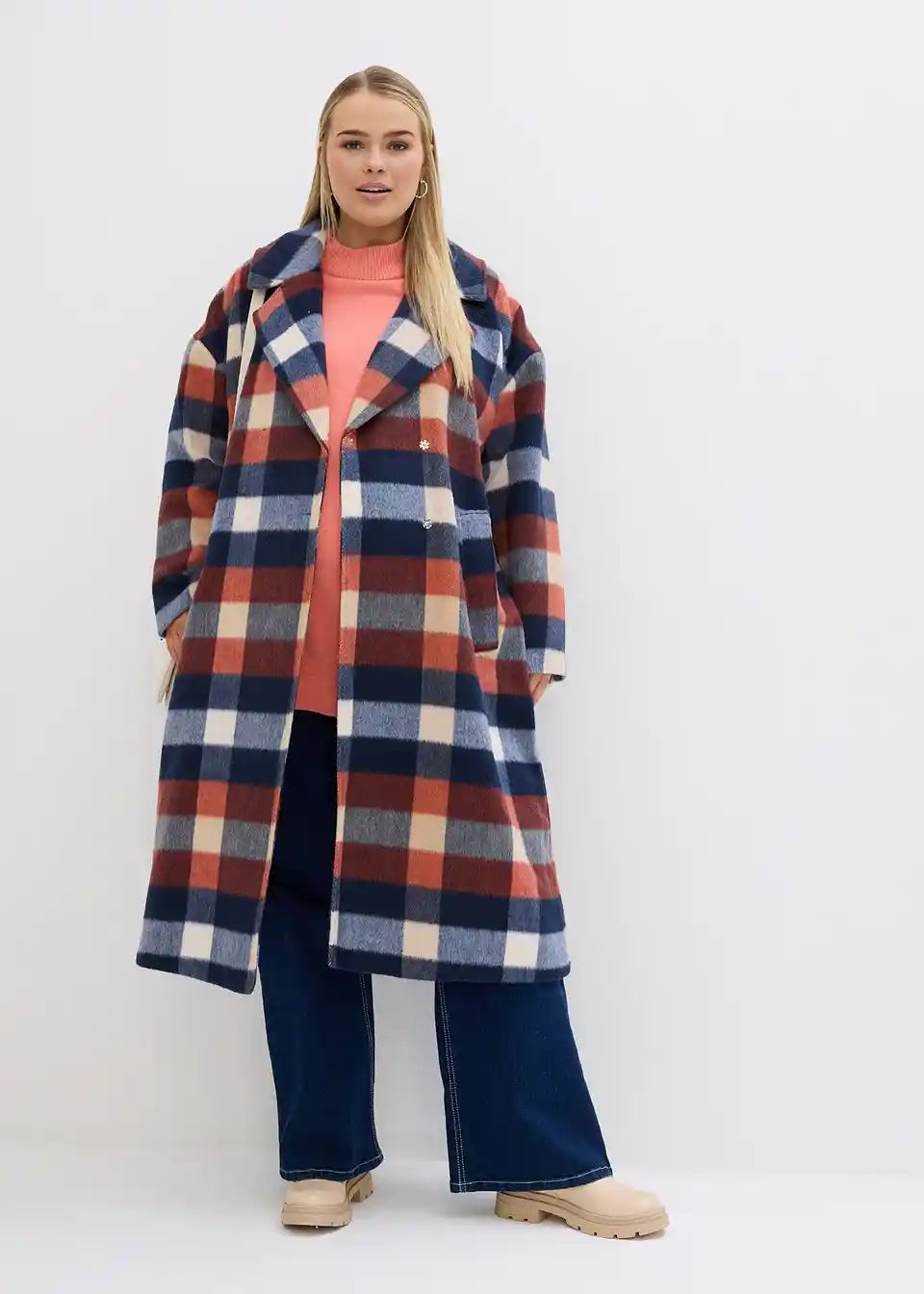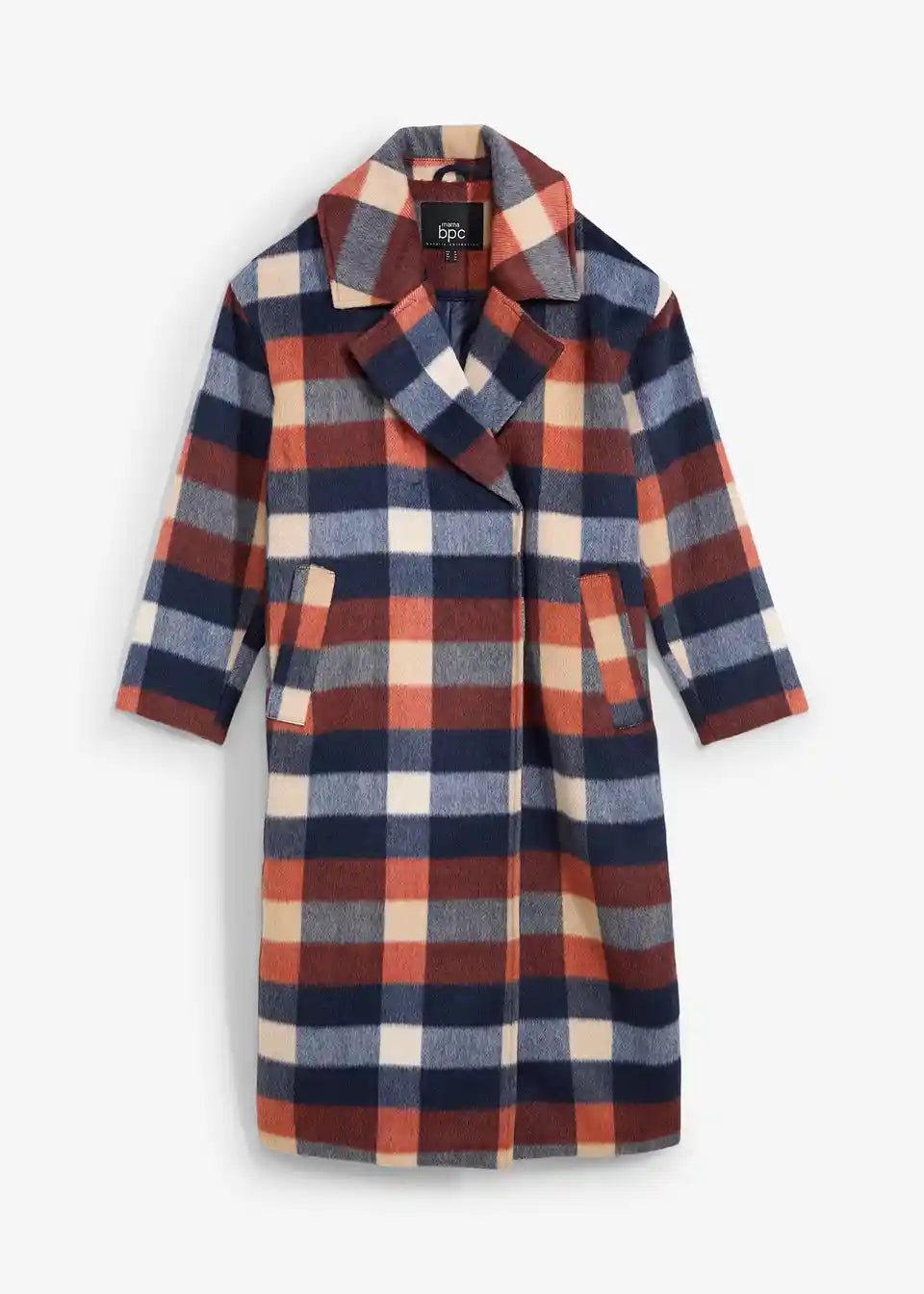 Dolg, karo plašč iz puhastega tkanega blaga s stopničastim reverjem in skritimi pritiskači spredaj. S stranskimi zadrgami za uravnavanje širine, ki omogočajo nošenje med nosečnostjo in po njej. Z vezenimi žepi. Podložen.