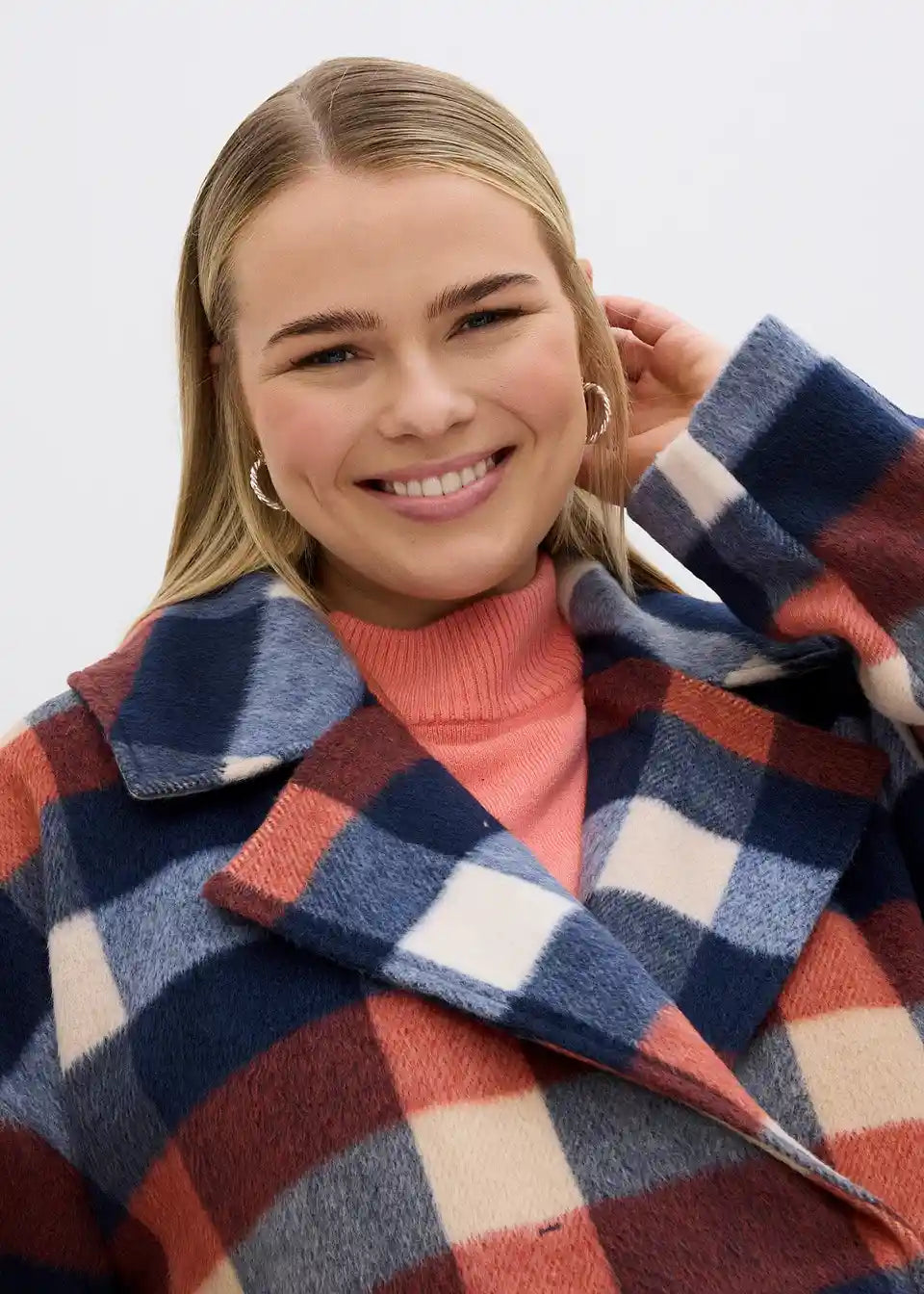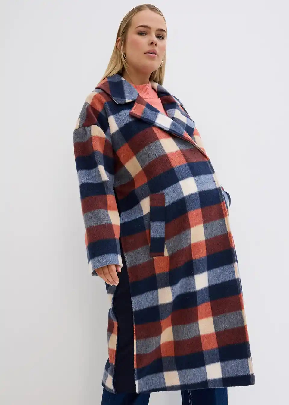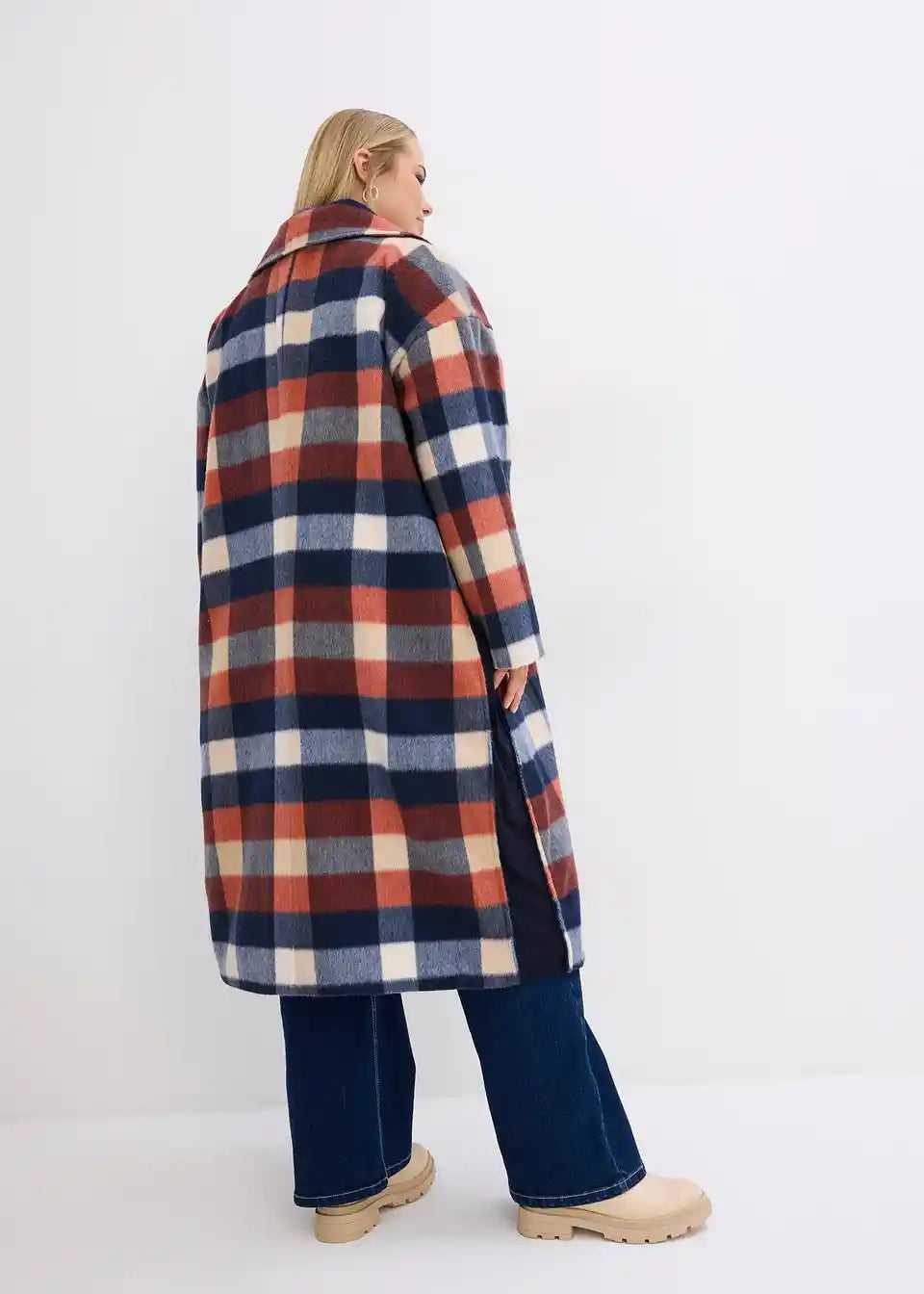 Dolg, karo plašč iz puhastega tkanega blaga s stopničastim reverjem in skritimi pritiskači spredaj. S stranskimi zadrgami za uravnavanje širine, ki omogočajo nošenje med nosečnostjo in po njej. Z vezenimi žepi. Podložen.