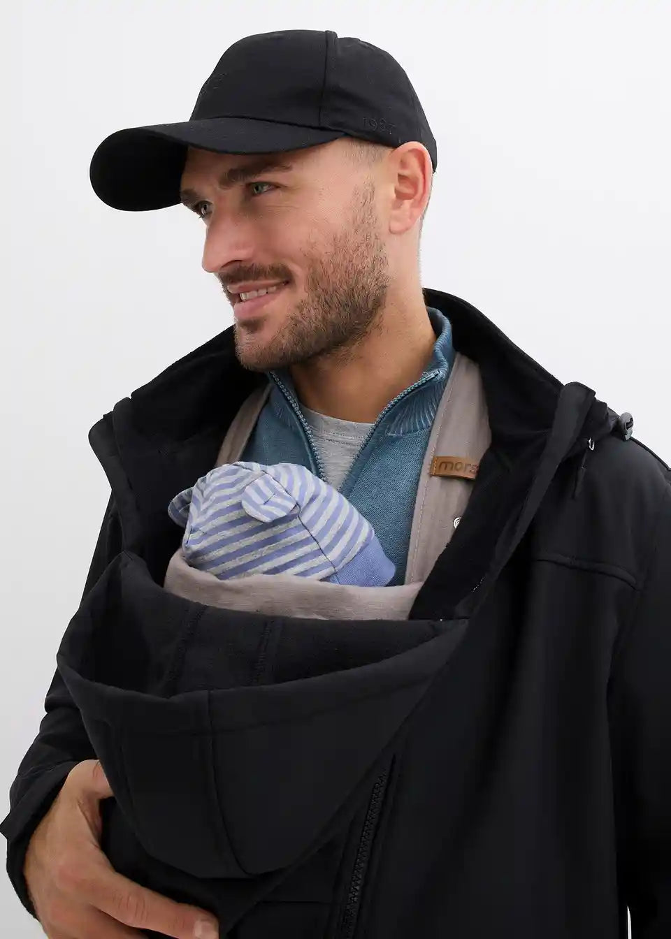 Dežju in vetru odporna funkcionalna jakna z nosilnim vložkom z majhno kapuco, ki ščiti otroka pred vetrom in vremenskimi vplivi. Notranja podloga je rahlo podložena, zato je jakna idealna za prehodno obdobje. Prostorne žepe je mogoče zapreti z zadrgo, kar omogoča veliko prostora za shranjevanje. Nosilna jakna ima kapuco z varnimi otroškimi vrvicami. Jakno je mogoče nositi tudi brez vložka kot običajno moško jakno.