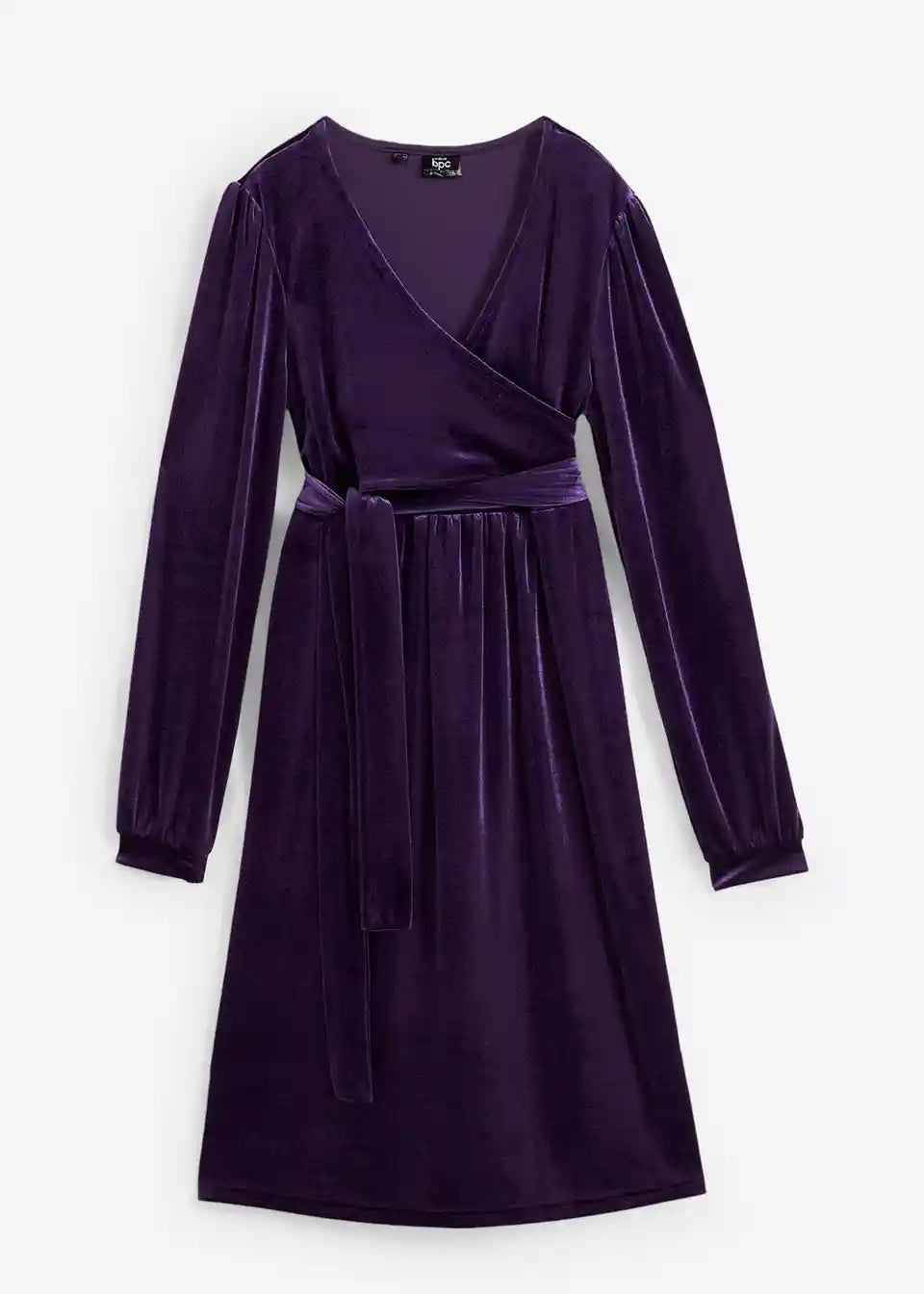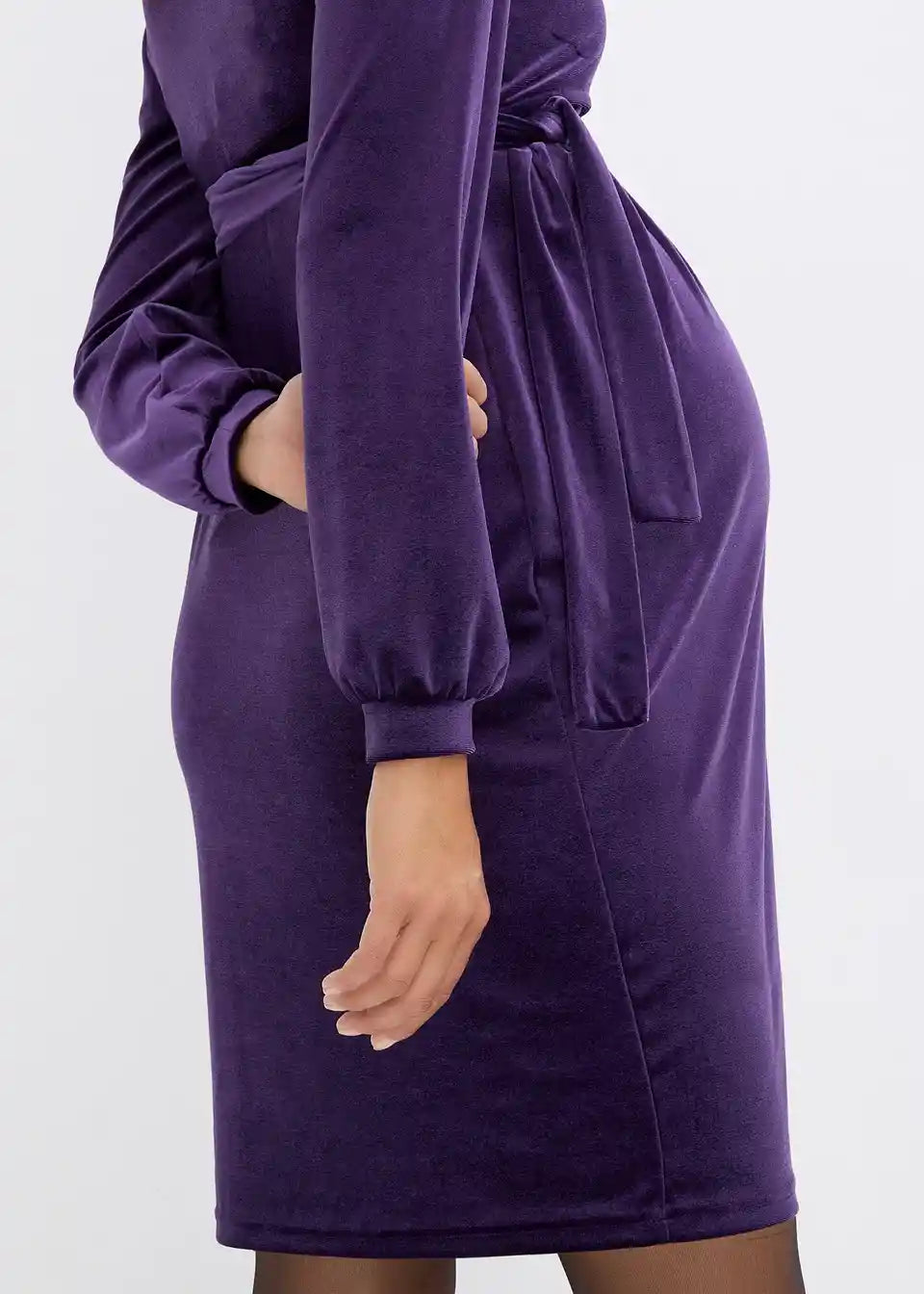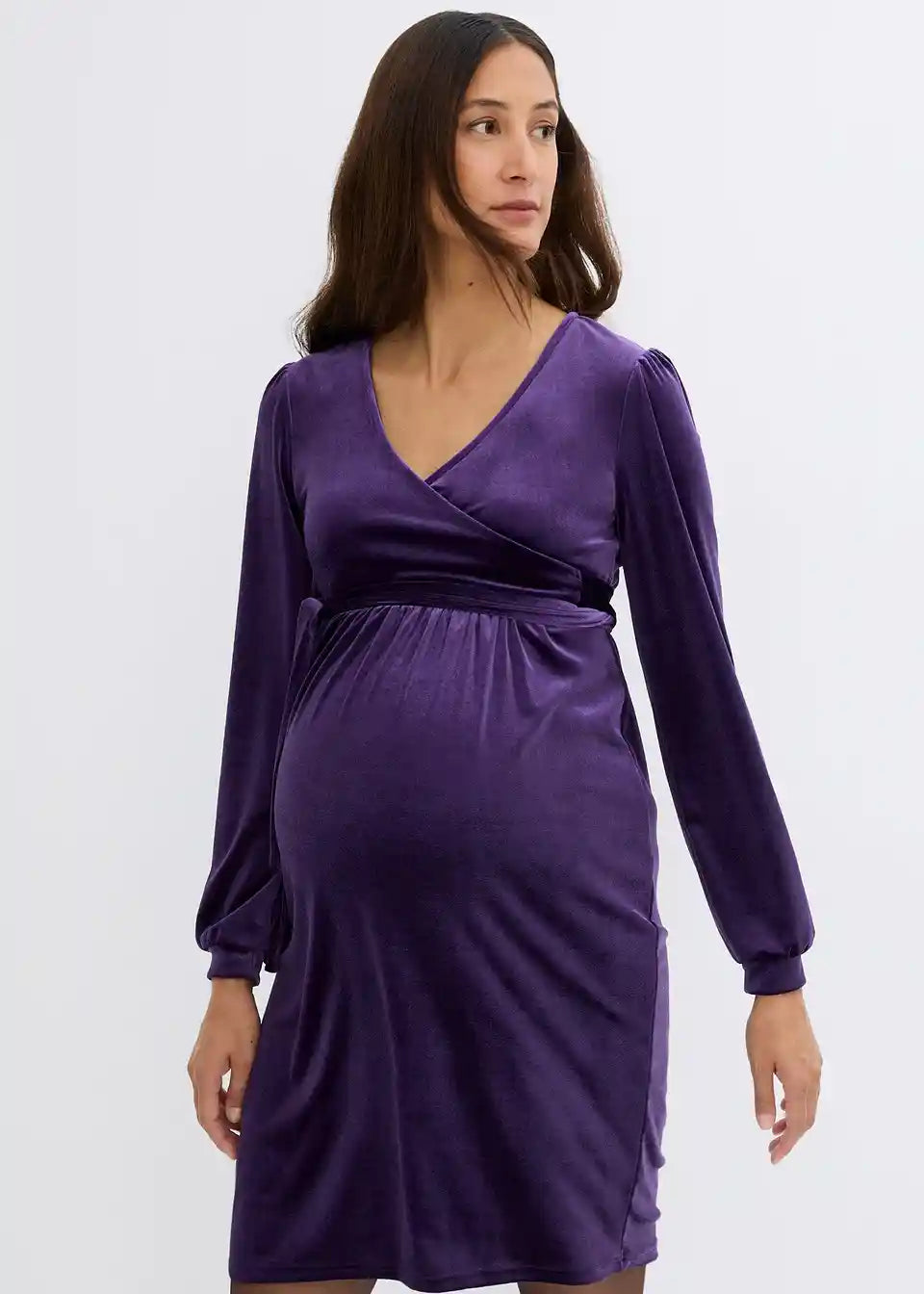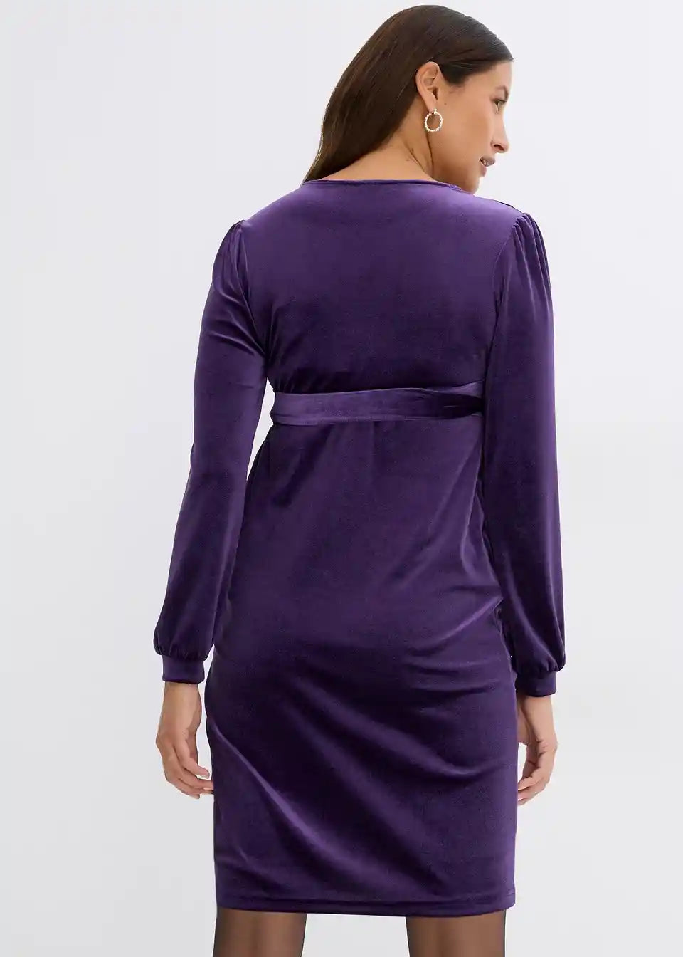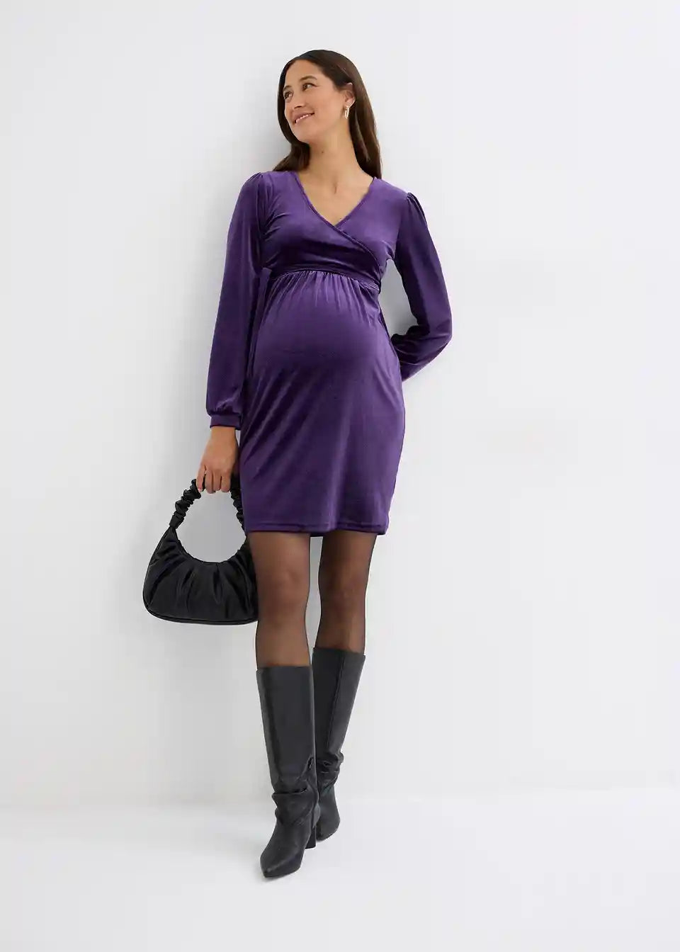 Žametna obleka z V-izrezom in dolgimi rokavi. Zgornji del v ovitnem kroju s praktičnim notranjim topom za lažje dojenje.