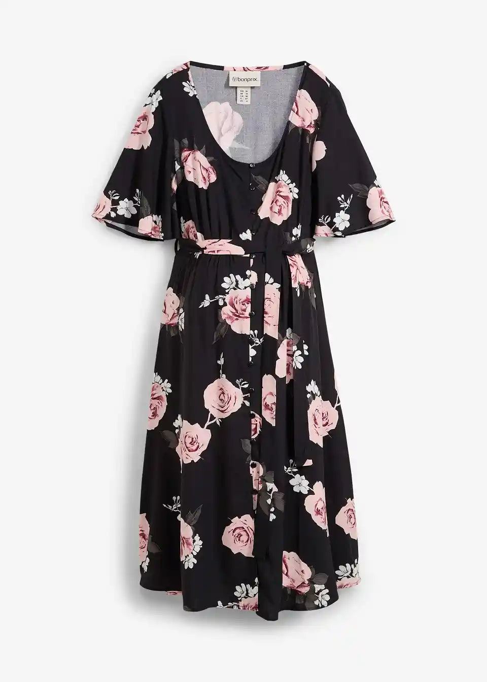 Do kolen segajoča obleka iz ležerno padajoče viskoze z ljubkim okroglim izrezom in širokimi rokavi. Neprekinjena vrstica gumbov omogoča enostavno dojenje in udobno oblačenje ter slačenje. Mehak elastičen pas in odstranljiv pas za zavezovanje poskrbita za individualno prileganje.