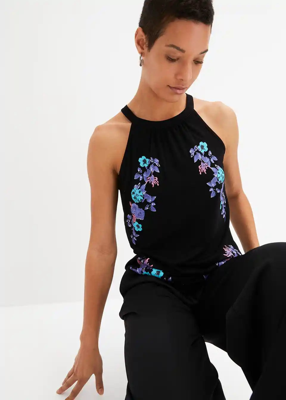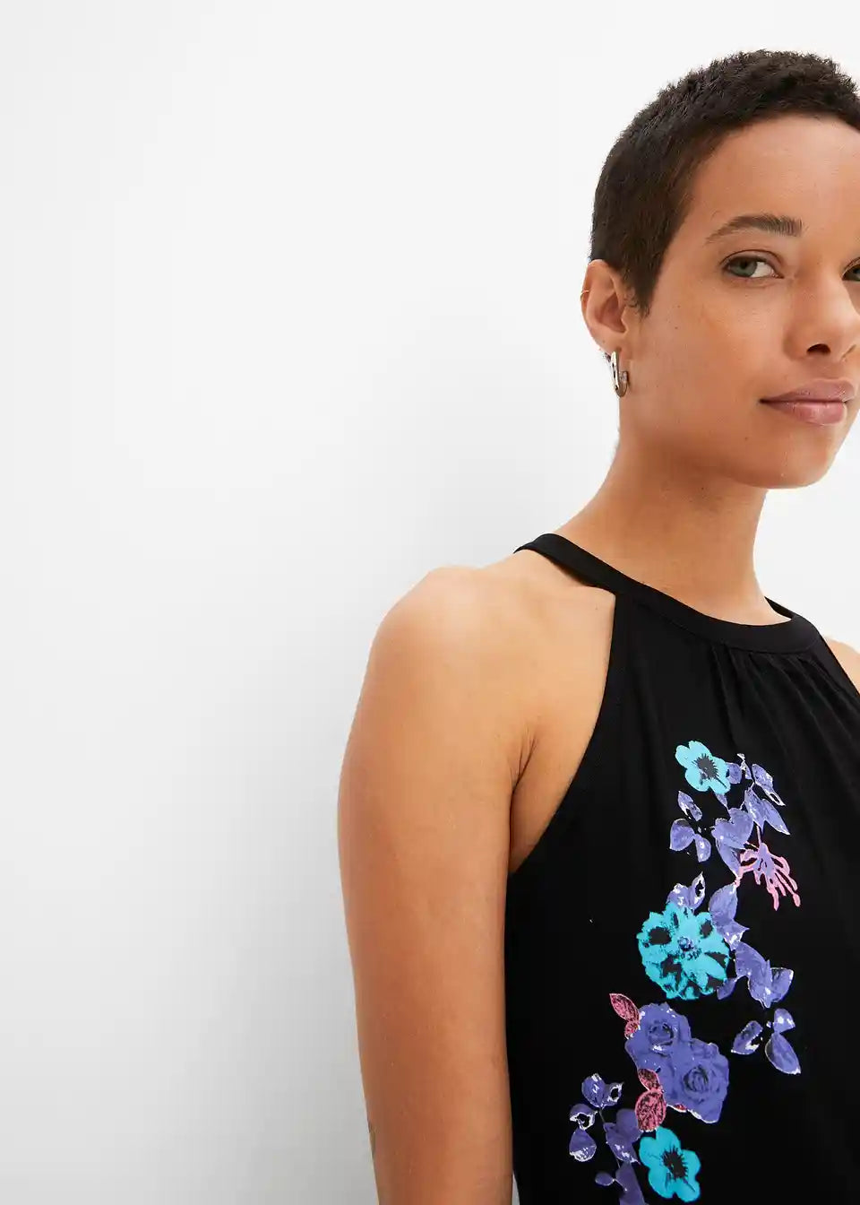 S čudovitim nabiranjem na izrezu in zavezovanjem na zatilju deluje top posebej ženstveno in igrivo. Cvetlični potisk na straneh in razporka na hrbtu dodajata privlačne poudarke. Zaradi širokega, elastičnega robu top znamke BODYFLIRT mehko objame postavo. Odlično se poda k ozkim hlačam ali oprijetim krilom.