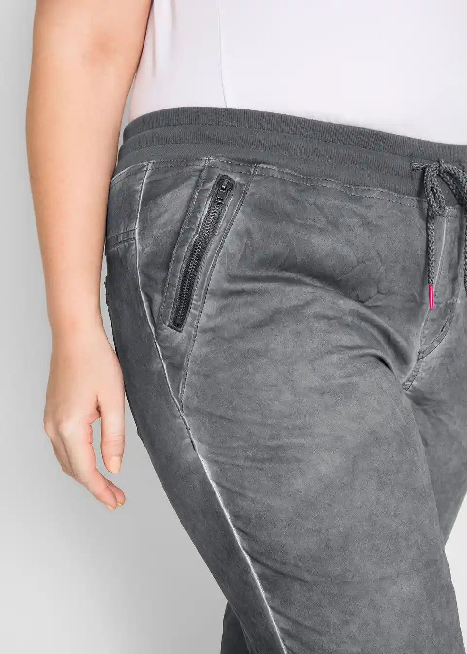 Modna obdelava materiala je v ospredju pri teh 3/4-hlačah s kontrastnim zavezovalnim trakom. Dizajn dopolnjujejo zadrge na vstavljenih žepih. Model nudi odlično udobje s prijetnim pasom in sproščenim krojem. Pisana majica ali top ter ujemajoče superge lepo zaokrožijo te 3/4-hlače s kontrastnim zavezovalnim trakom iz kolekcije bpc.