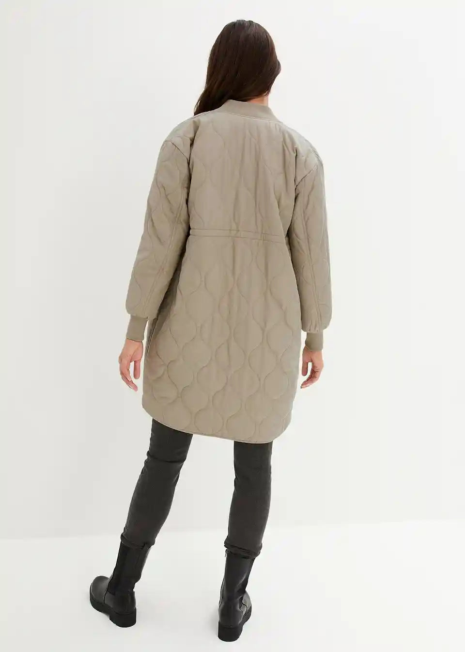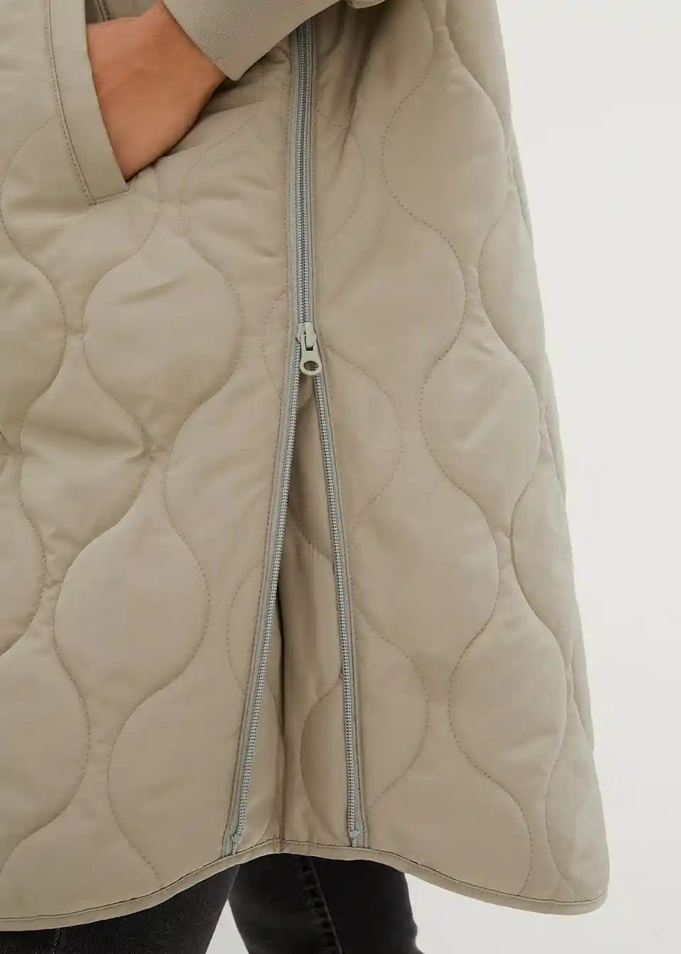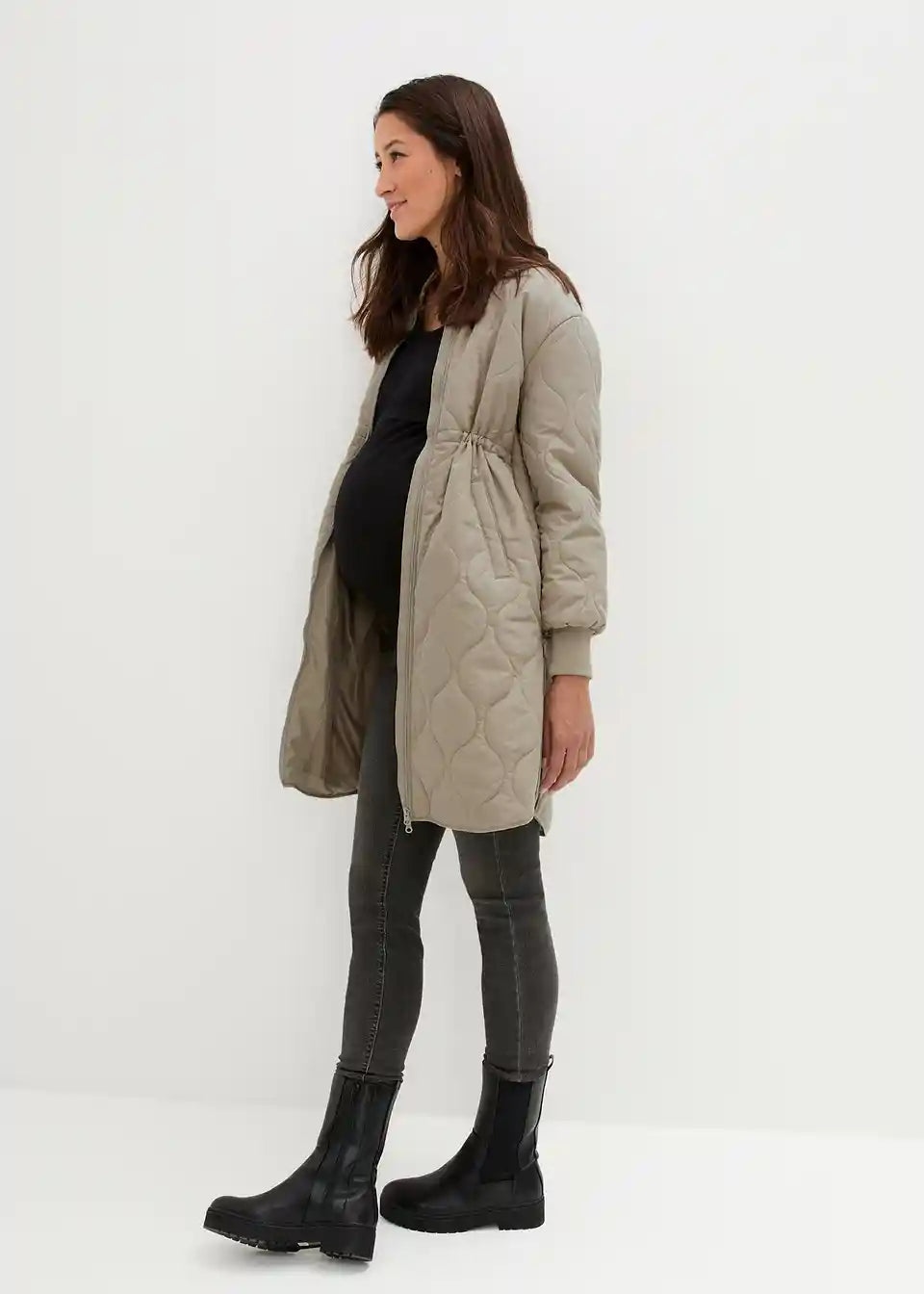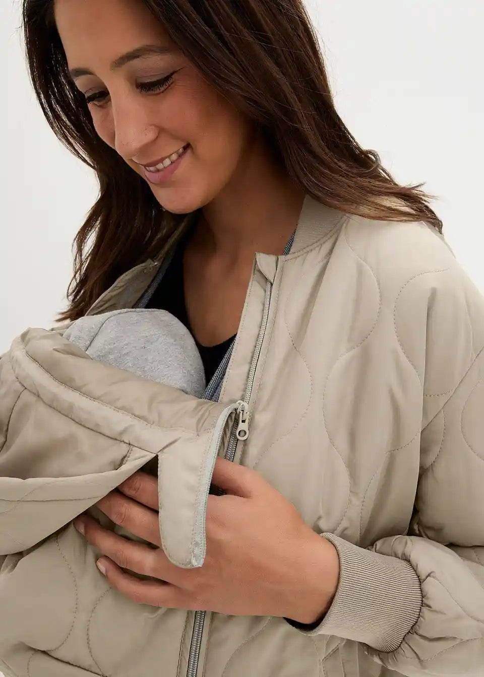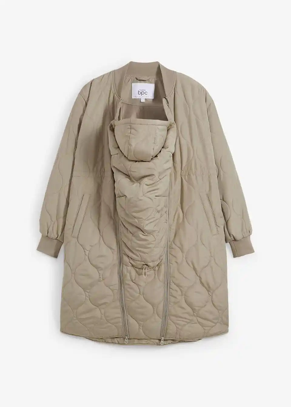 Prešit plašč z lahkim polnilom in stranskimi zadrgami za prilagajanje širine, ki omogočajo nošenje tako med nosečnostjo kot po njej. Z vložkom za nošenje z otrokovo kapuco. Rokavi in ovratnik z elastičnimi rebrastimi patenti.