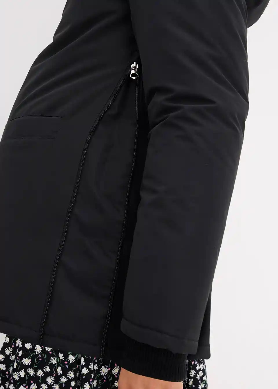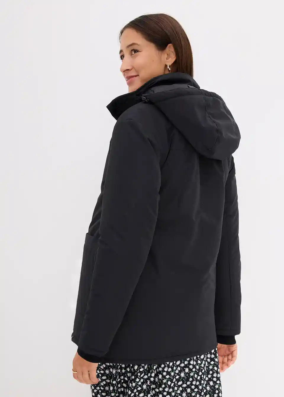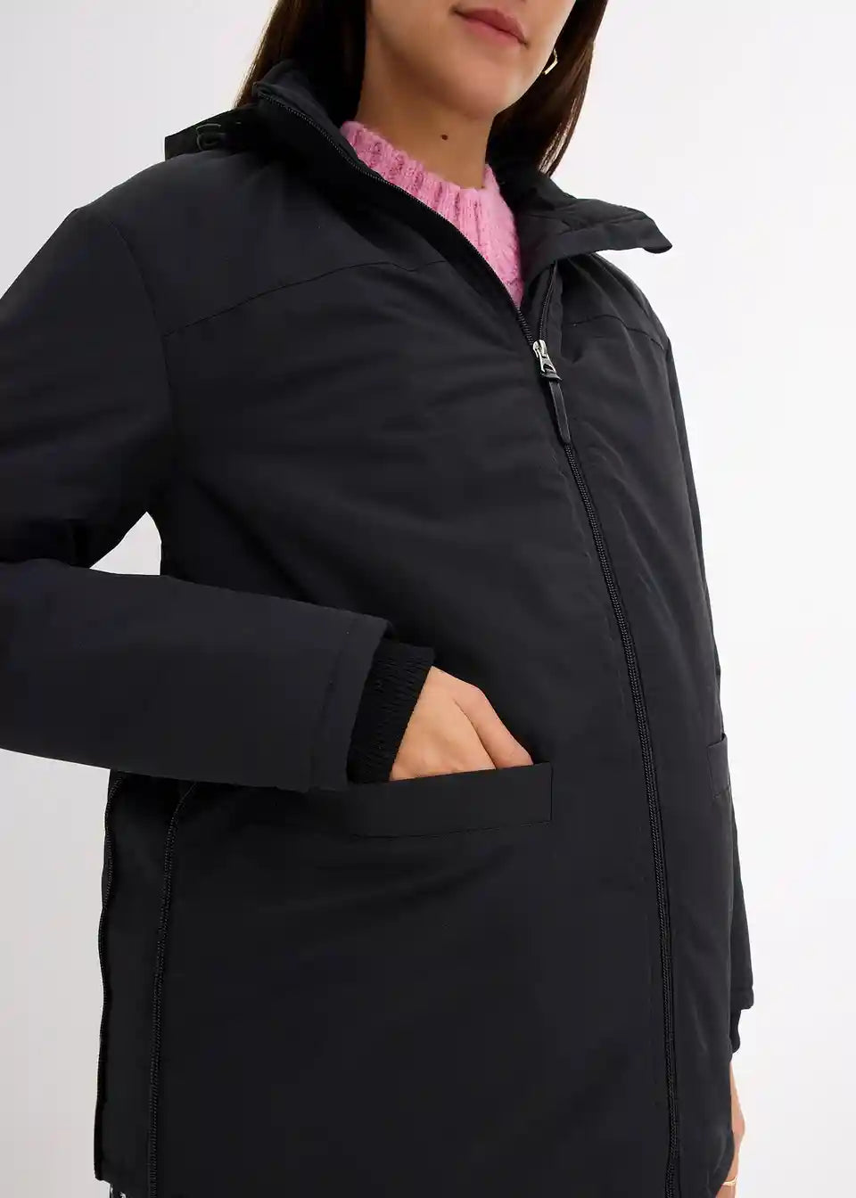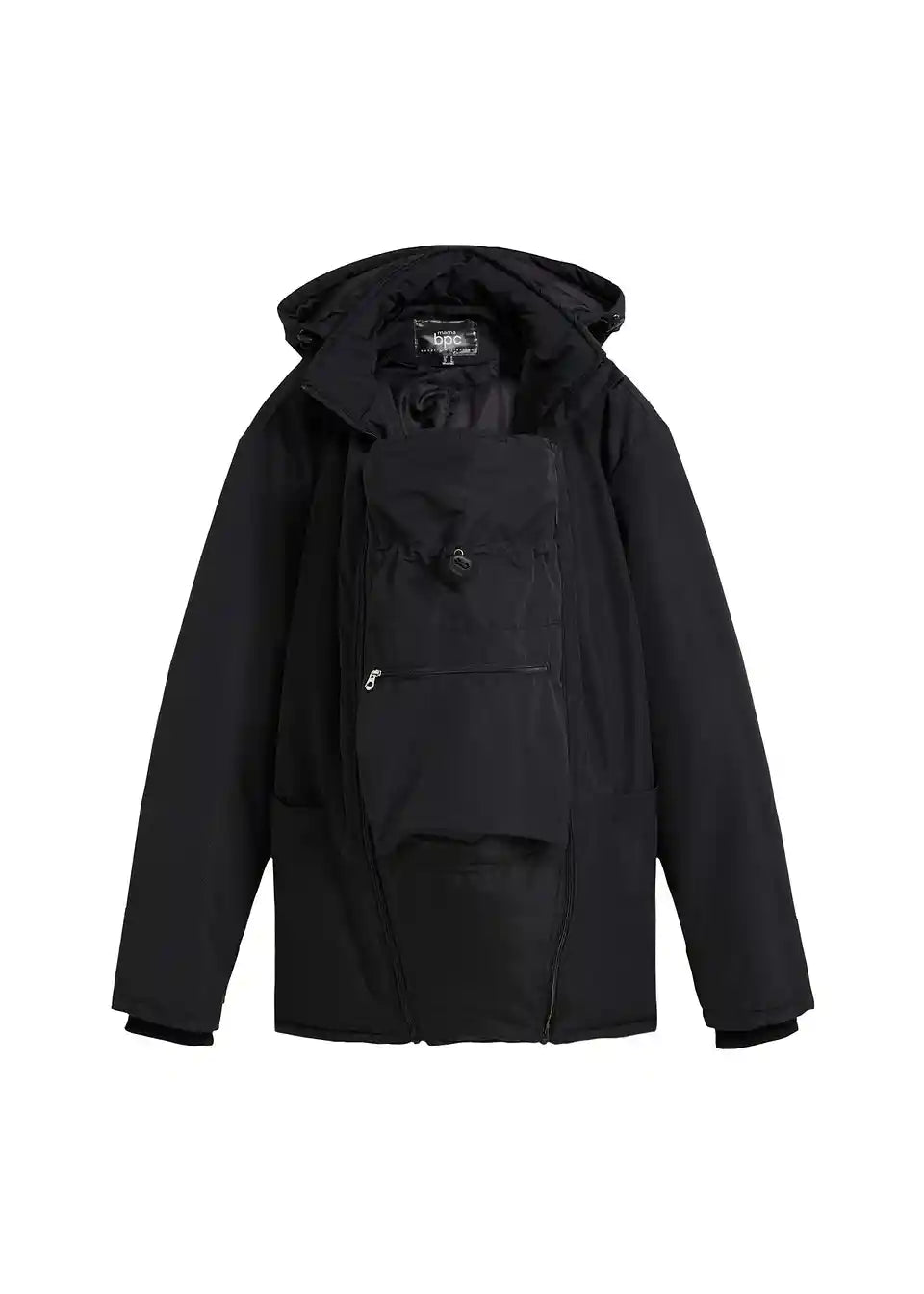 Dežju in vetru odporna funkcionalna jakna z vložkom za nošenje otroka. Ta ima praktično nameščen žep za otroške potrebščine. Mehke rebraste manšete na rokavih preprečujejo prehod mraza in vetra. Z žepi spredaj ter snemljivo kapuco z vrvico. Stranske zadrge omogočajo prilagajanje širine, kar omogoča nošenje tako med nosečnostjo kot po njej.