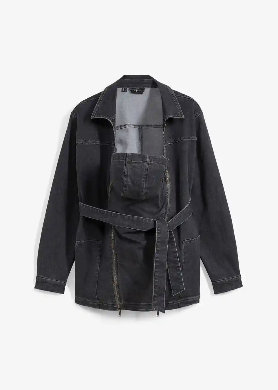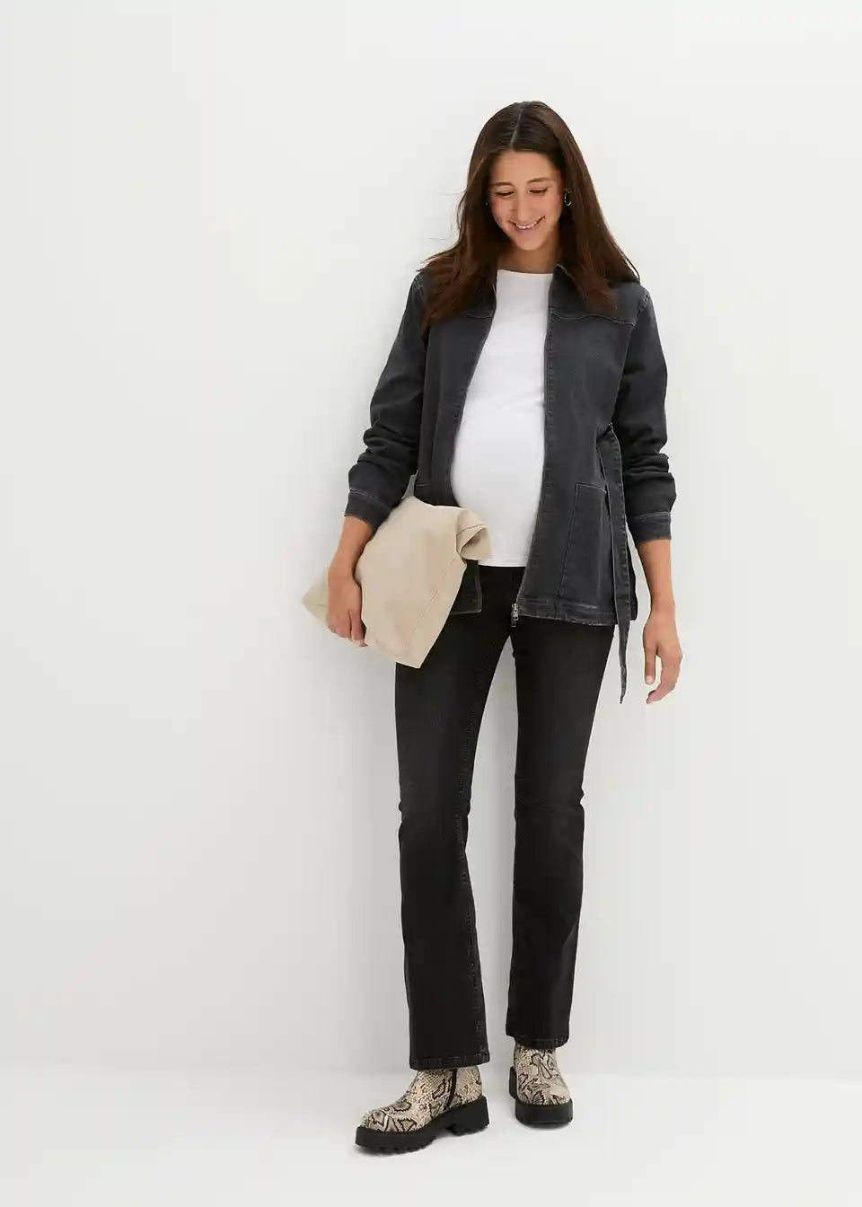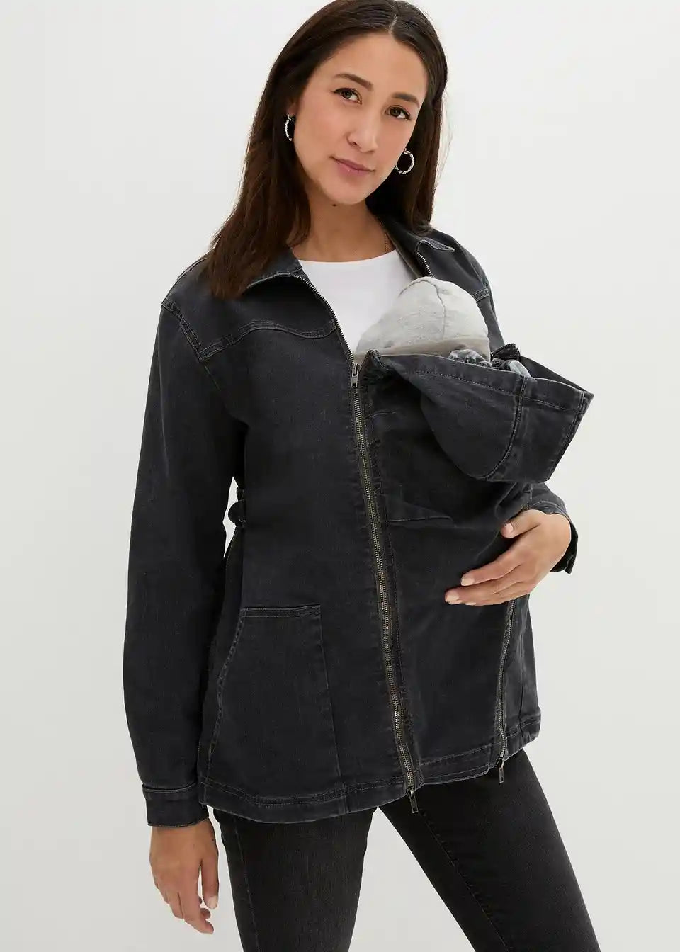 3-v-1 nosečniška jakna iz jeansa za nošenje dojenčka s trakom za zavezovanje