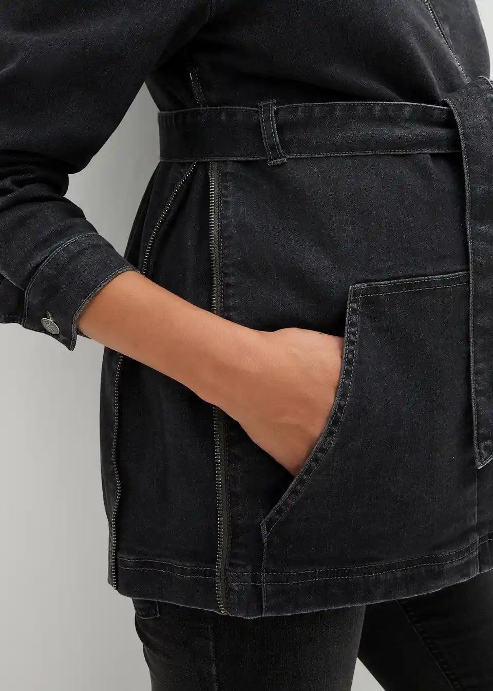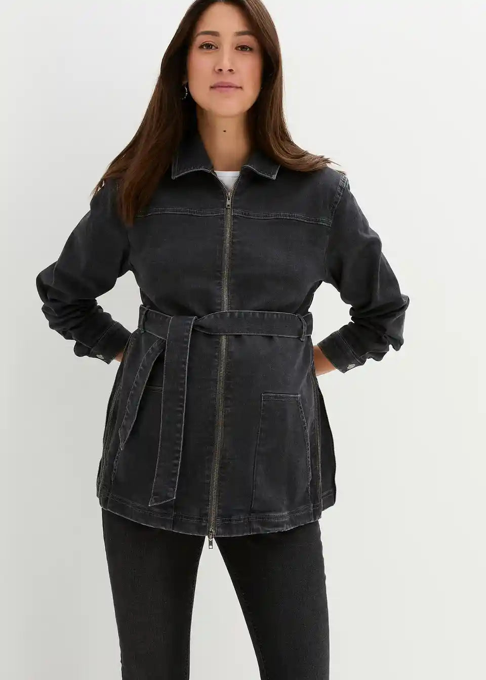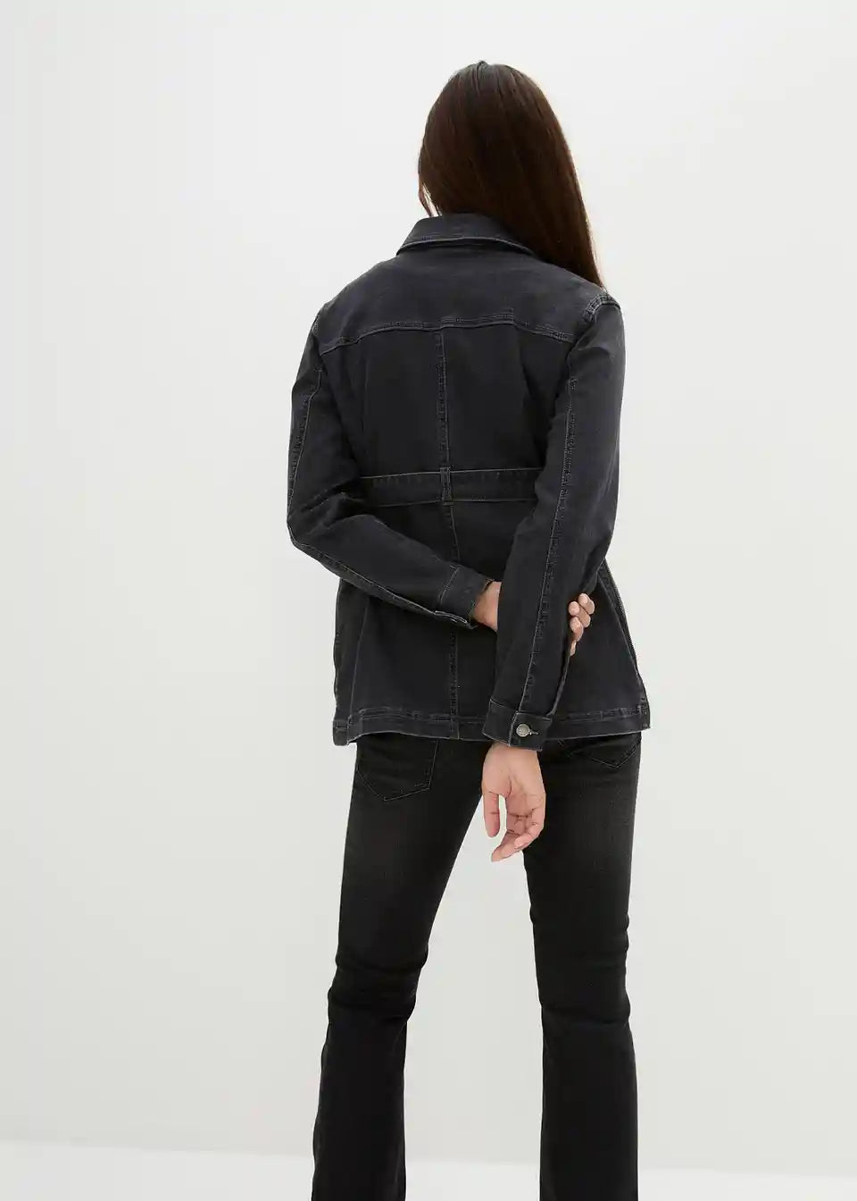 3-v-1 nosečniška jakna iz jeansa za nošenje dojenčka s trakom za zavezovanje